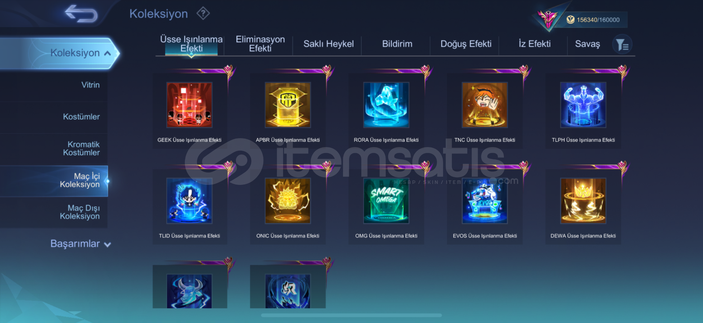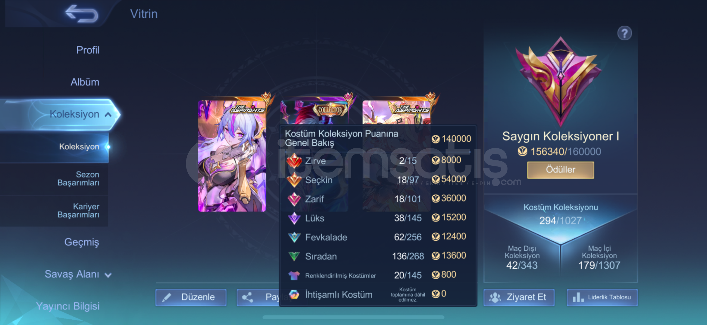 Hesapta sadece değerli skinler mevcut parayla alınanlar çoğu sadece bu skinlerle 160k koleksiyon puanı var