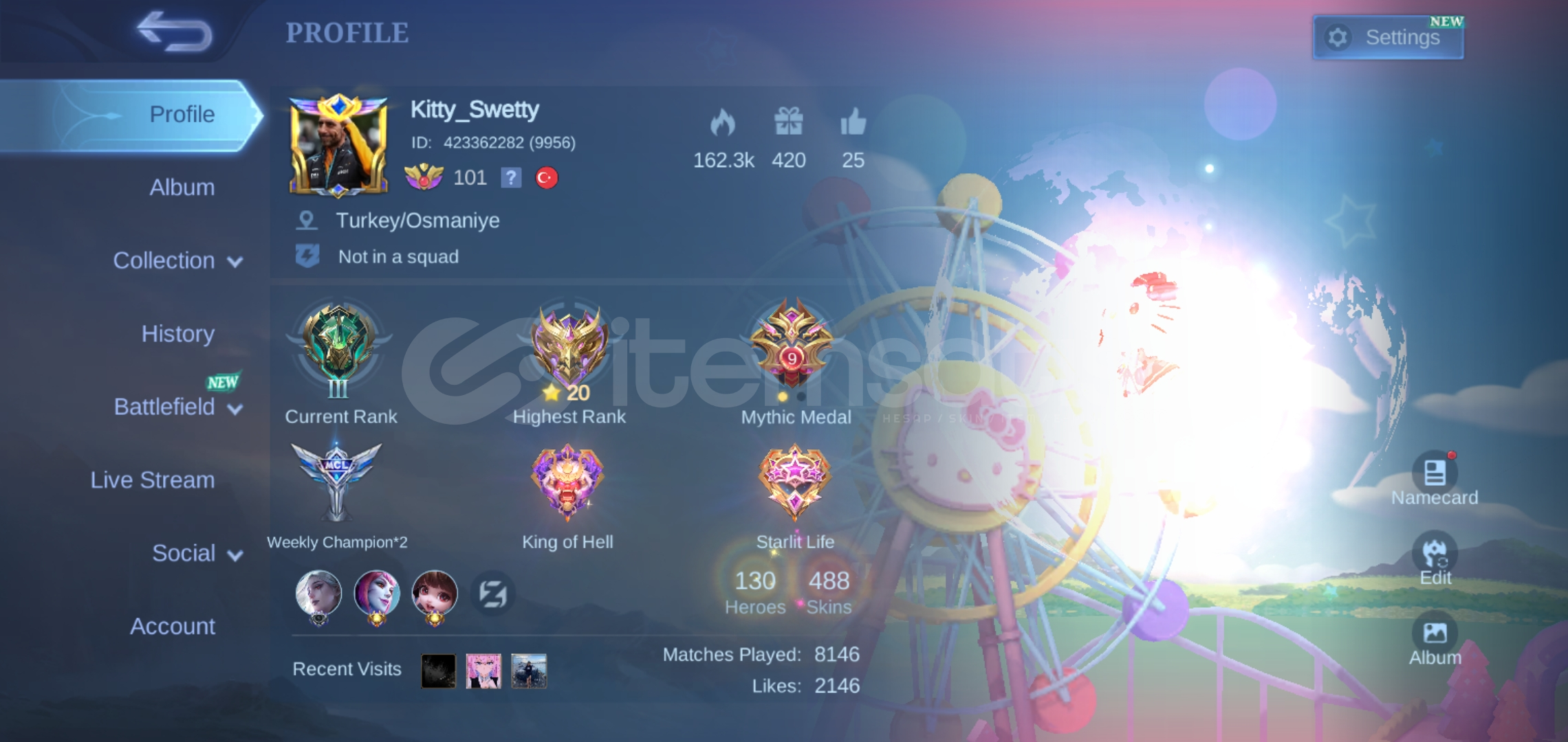 3.Hesap bölgesi Asya veya globaldir daha detayli bilgi ve elmas fiyatları için id/sunucu kontrolu isteyip link aliniz. (Mlbb de bölge farklılığı sadece elmas yükleme methodlarini etkiler, oyuna girdiğiniz anda türk arkadaşlarınızla eşleşirsiniz. Herhangi bir ms/ping sorunu olmayacağının garantisi verilir.)