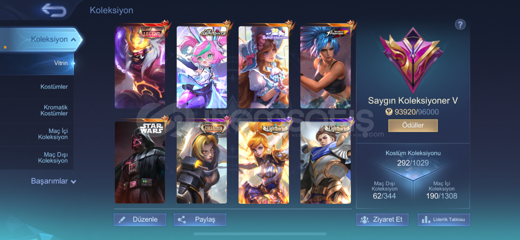 +300 kostümlü+70 epik ve üstü kostümFull amblemFull heroAnlık mistik ligiStarlight aktiftir ve gelecek sezonda aktif ...