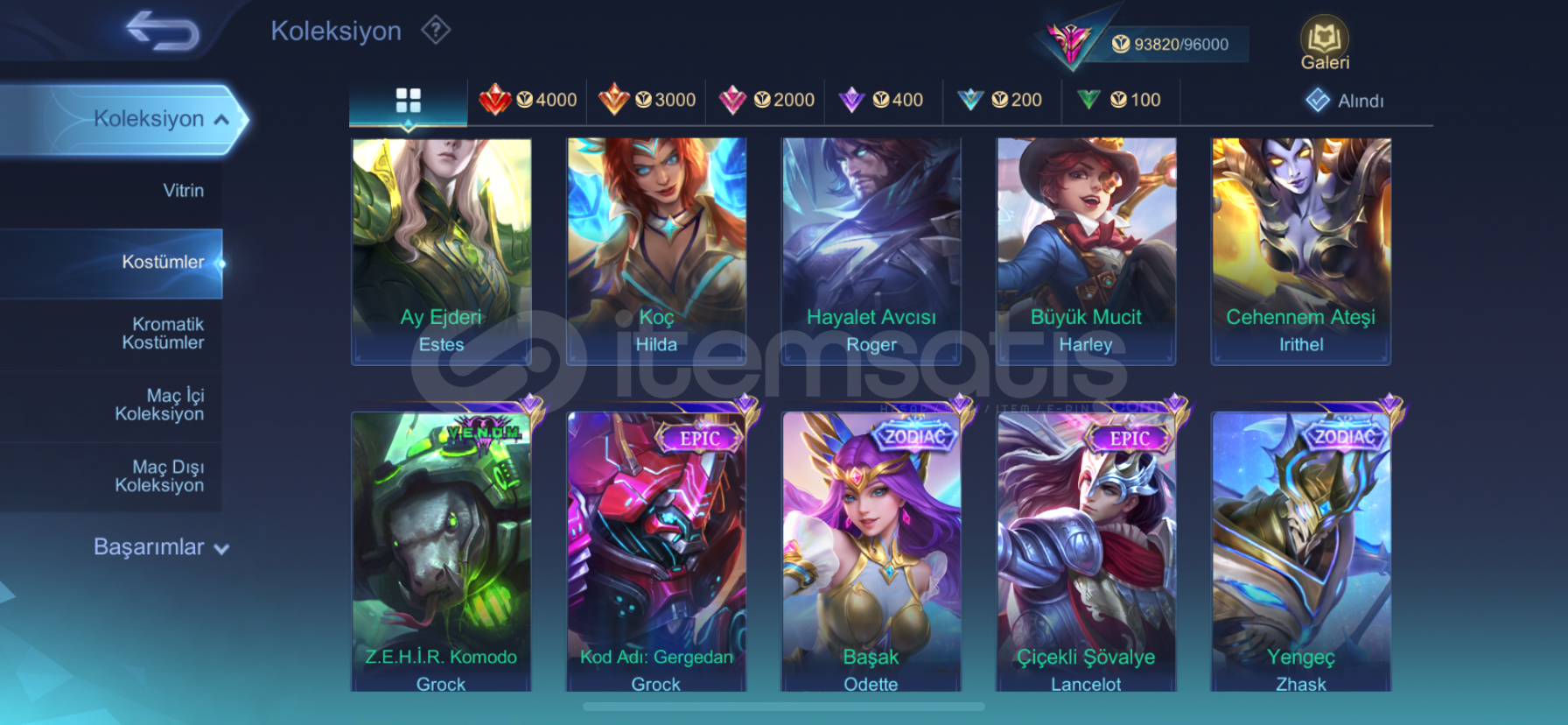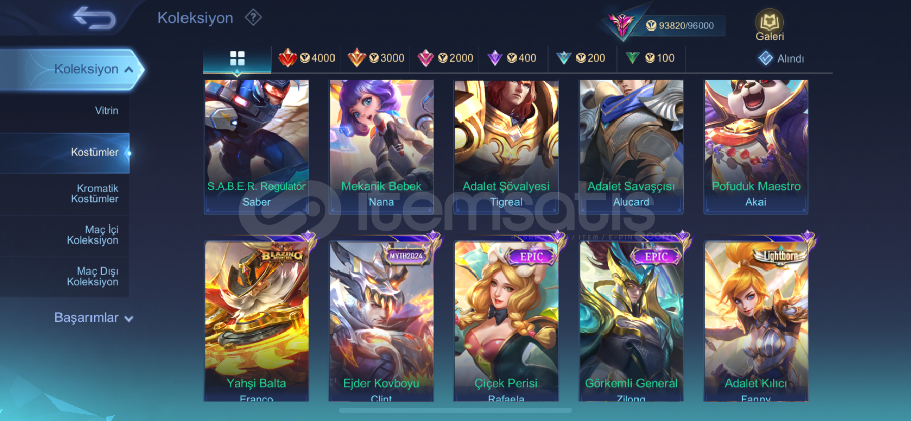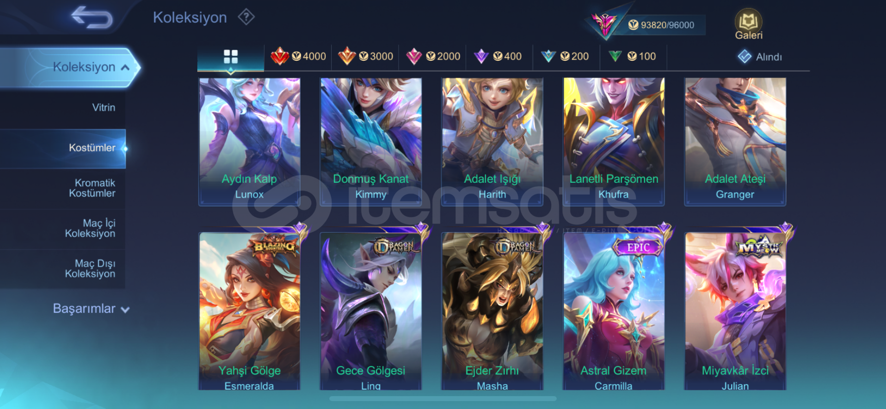 +300 kostümlü+70 epik ve üstü kostümFull amblemFull heroAnlık mistik ligiStarlight aktiftir ve gelecek sezonda aktif şekilde 300 Elmasla teslim edilecektir