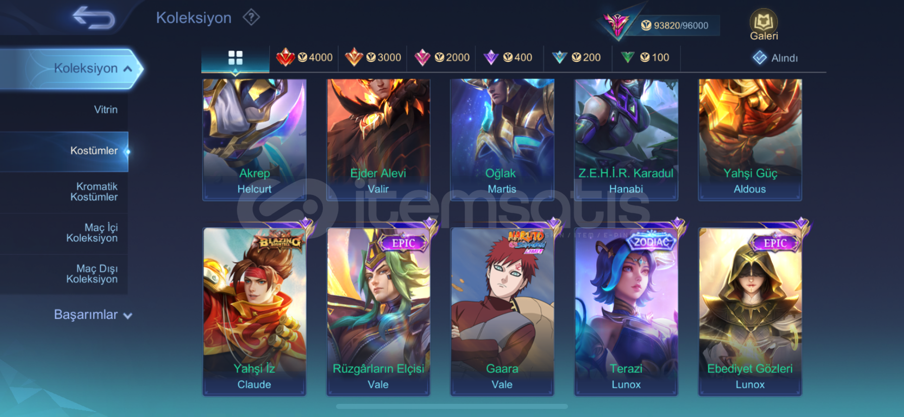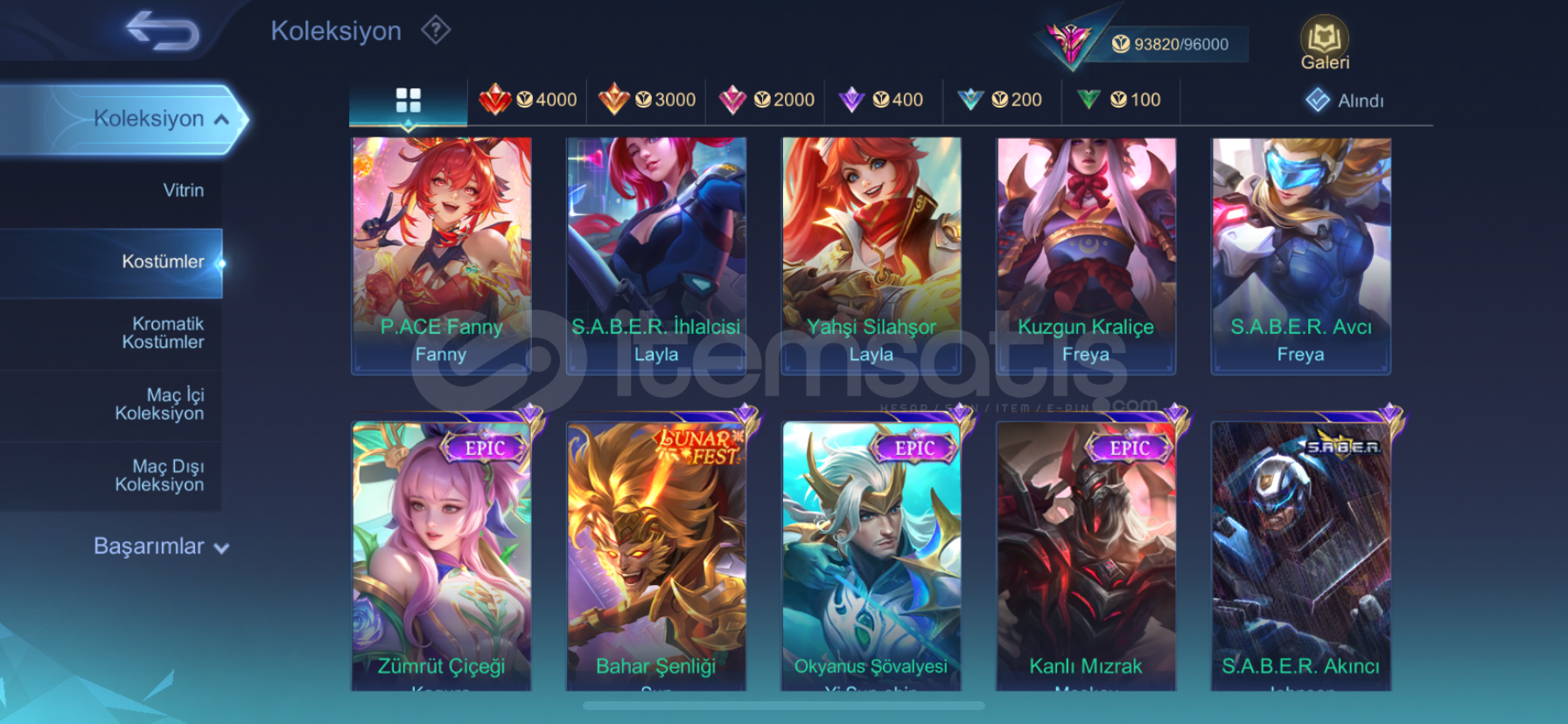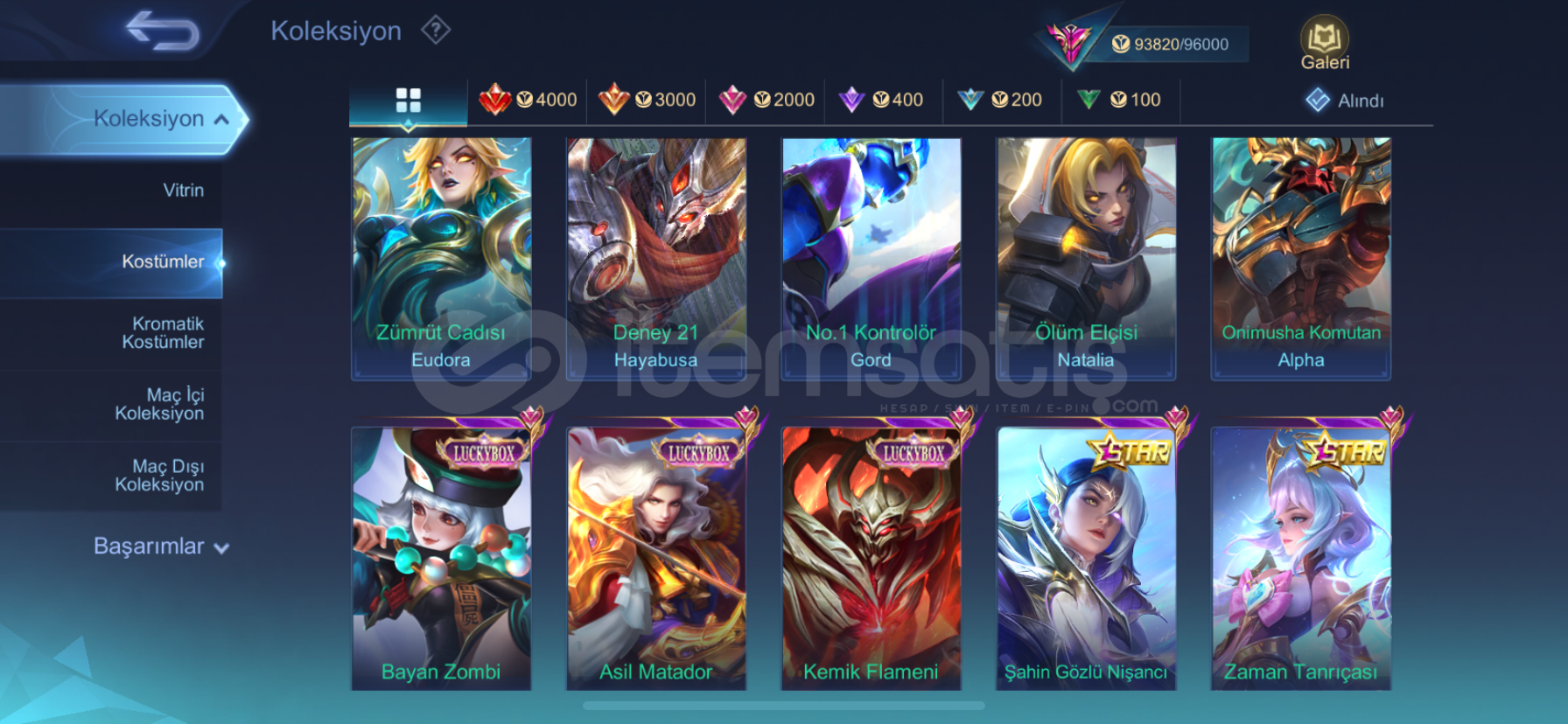 +300 kostümlü+70 epik ve üstü kostümFull amblemFull heroAnlık mistik ligiStarlight aktiftir ve gelecek sezonda aktif şekilde 300 Elmasla teslim edilecektir