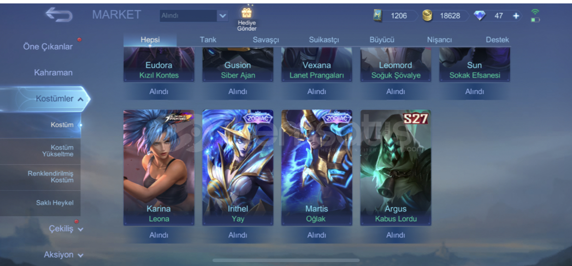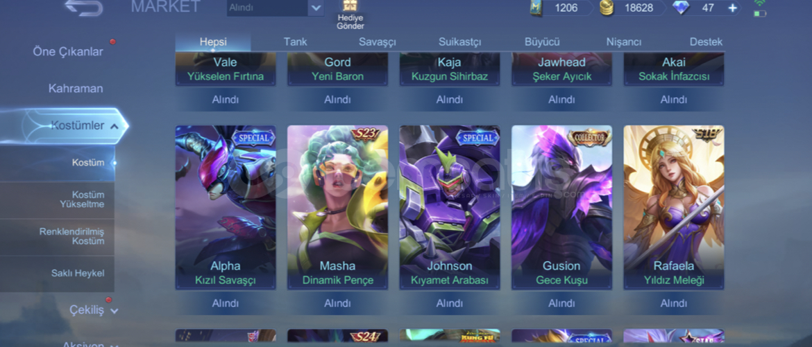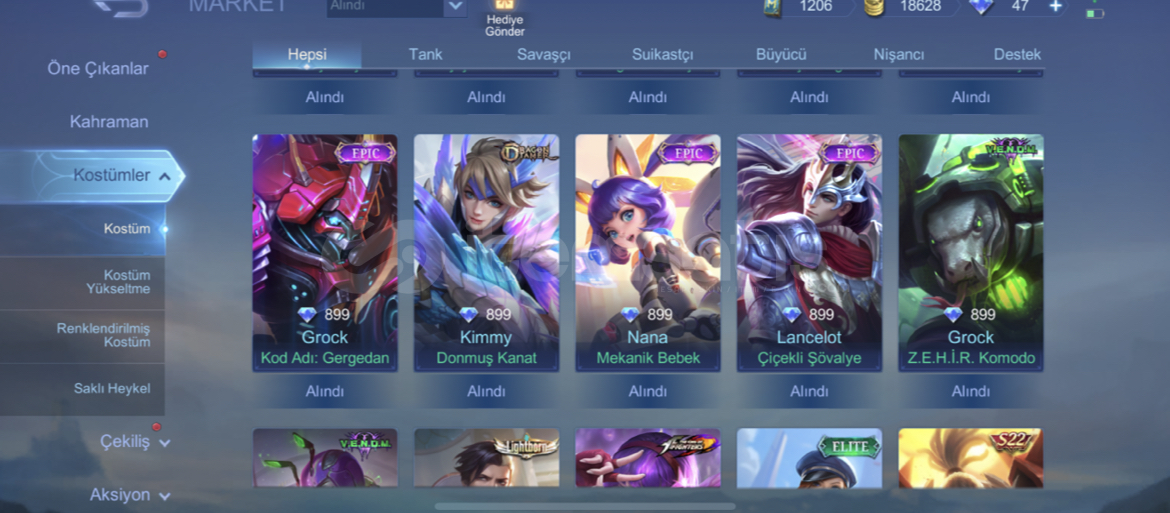 KOSTÜMLERGusion CollectorGusion ValentineKarina kofLancelot epik (asil matador)Lancelot epik (çiçekli şövalye)Aldous blazingGrock epik (gergedan)Grock venomAngela venomGuinevere kofRoger transformersThamuz kung fu pandaBadang pegasus seiyaMartis zodiacFranco hallowen(ışıltılı kabus renklendirme)Lolita hallowenEsmeralda blazingKagura summerVale epik (rüzgarların elçisi)Chang’e Lunar fest(yeni ay)Nana epik (mekanik bebek)...
