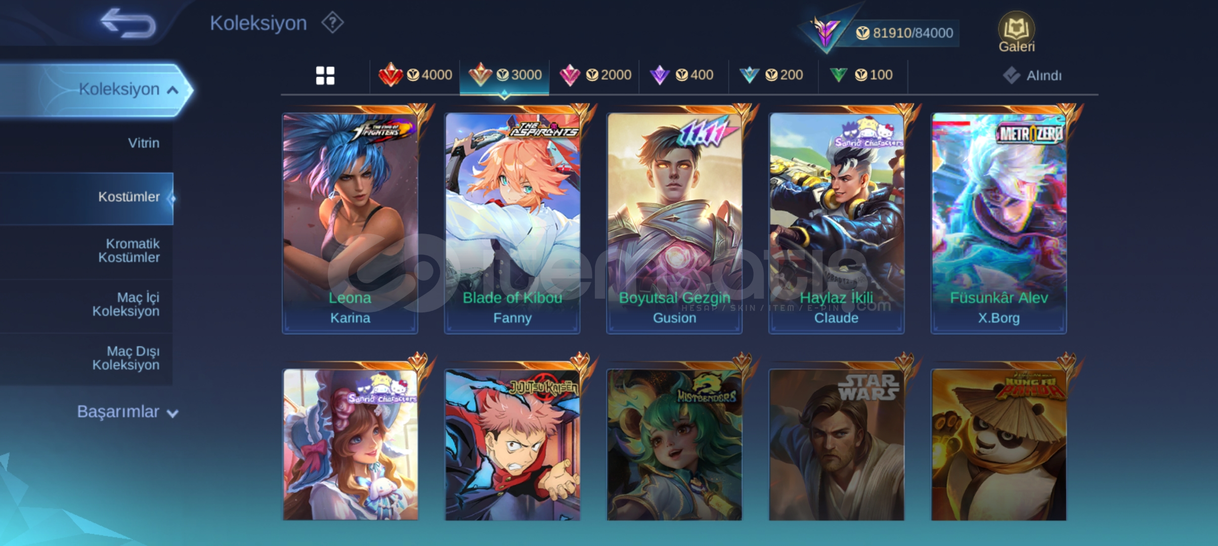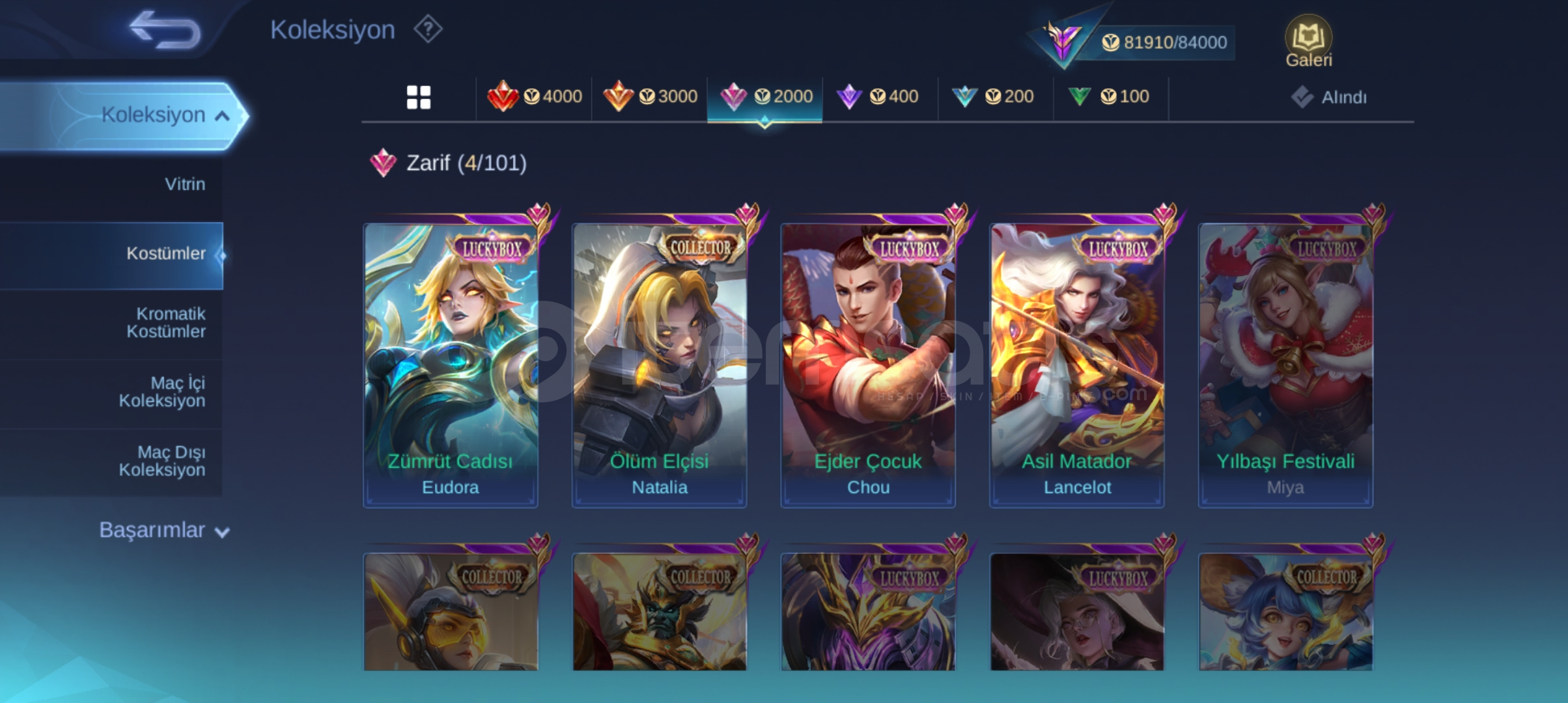 İstediğiniz 11.11 kostumunu alabilirsiniz 192 parça vardır Istediginiz legende alabilirsiniz11 günlük haftalık pass vardırFanny nin 3 kostumu dışında hepsi vardırAlev taci üste ışınlanma bulunmaktadir