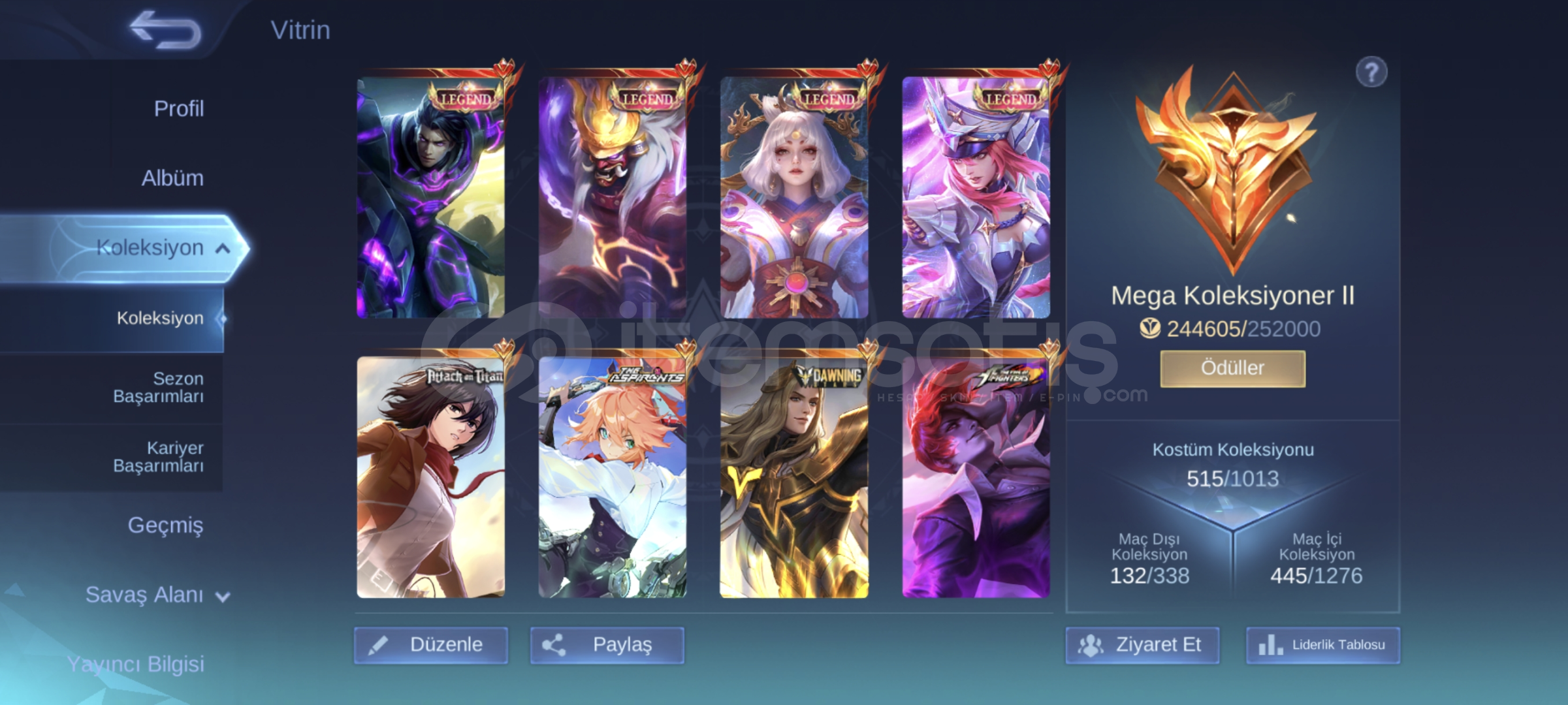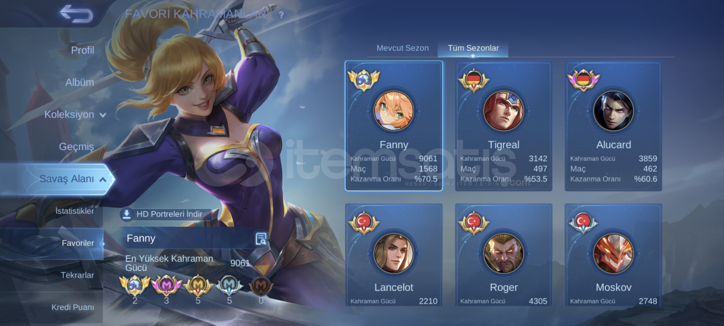 Hesapta 3k Şafak da var. Başlıca skinler:Alucard legendFranco legendFreya legendLunox legendAspirant fannyAspirant rubyAspirant lesleyAspirant changeKof karinaKof chouKof guinevereKof dyrrothTransformers rogerTransformers jonhsonTransformers grangerExorcists kaguraExorcists hayabusaPrime beatrixPrime ClaudePaq colBenet colEsmer colKhufra colMikasa fannyDawning lancelot11.11 hayabusaAllstar moskovKishin densetsu karrieNaruto suyouDucati leomordKung fu thamuzHunterxhunter harithNeob...
