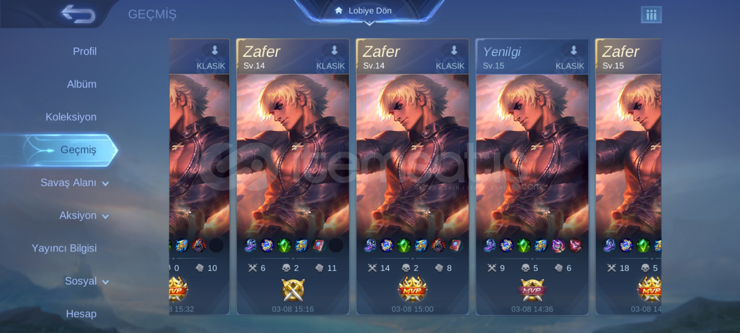 Gusion fullKagura Bulutların Ötesinde ve StarLunox LegendJulian JJKSelena S.T.U.N.Badang Saint SeiyaKOF ;DyrothGuinevereKarinaAuroraGusion+ olarak epik base bulunur. Amblem + hero full + 700k gold + nick değiştirme kartı+ yüzük çerçevesi.Oran takıntısı olmayana gider ( detay için dm ) ( ölücüler yazmasın )