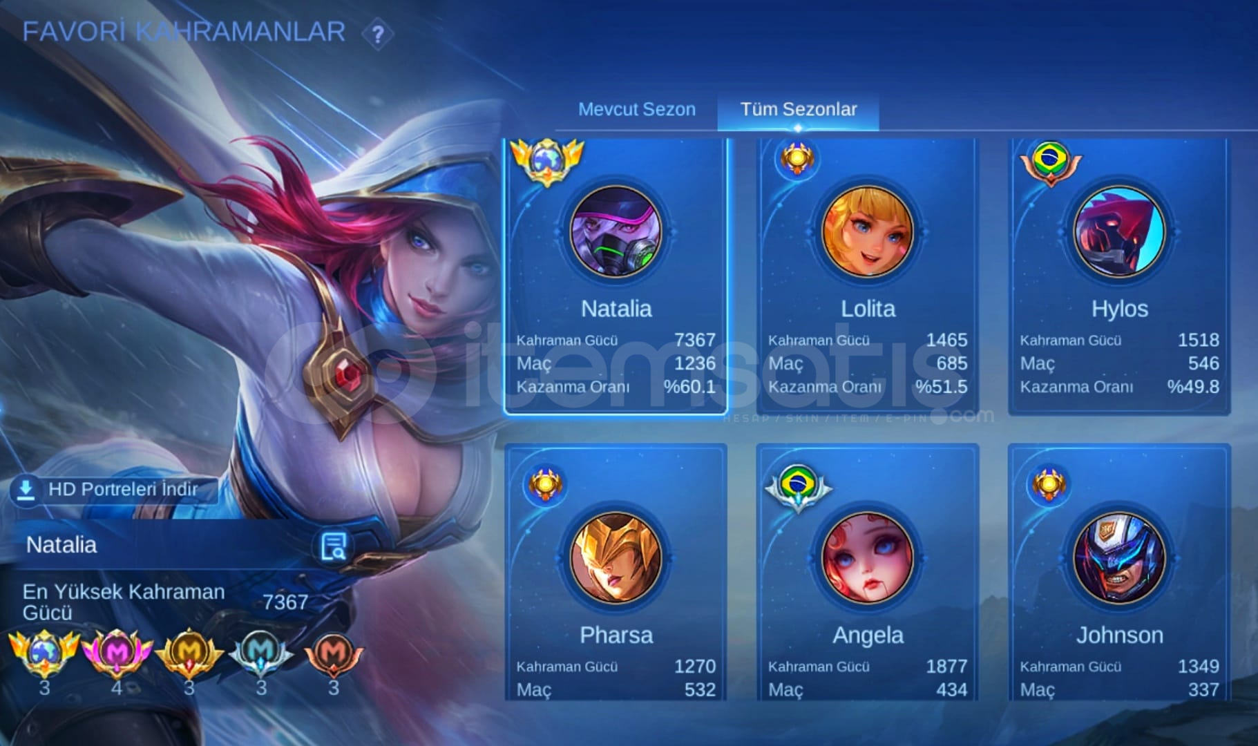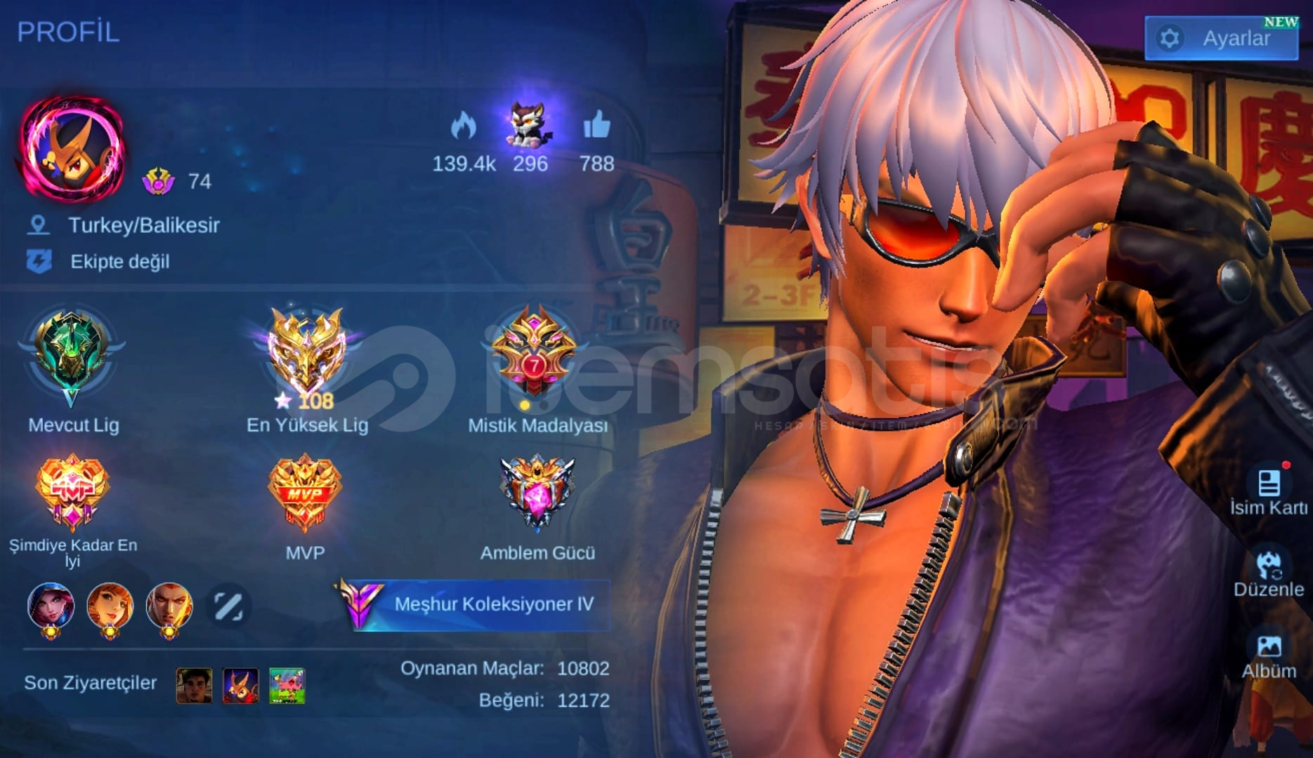 Hesap Seviyesi: 74Max Rank: Yüce Mistik 108 YıldızToplam Maç: 10800+Beğeni: 12172Koleksiyon Seviyesi: Meşhur Koleksiyoner ıvKostüm Sayısı: 230 (LEGEND VALİR,GUS KOF,+)Amblemler: 60 LvL (MAX)Karakter Sayısı: 124 (Savaş Puanı (PARA) : 97219)Hesabın E-Postası Devredilecek.