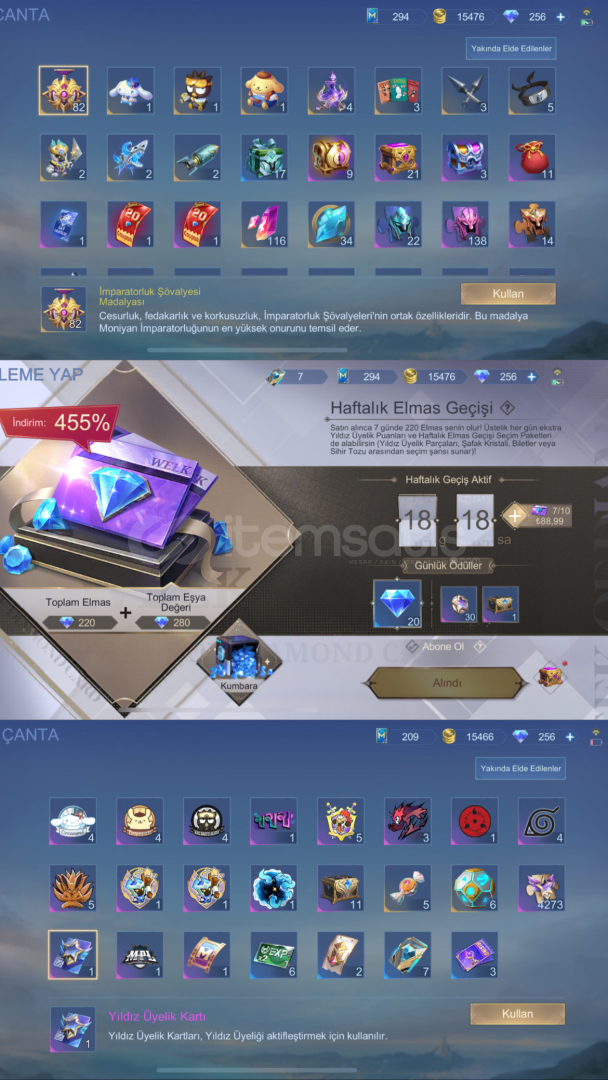 HESAPTA HAFTALIK ELMAS GEÇİŞİ AÇIKTIR VE 256 ELMAS BULUNMAKTADIR TOPLAM 636 ELMAS