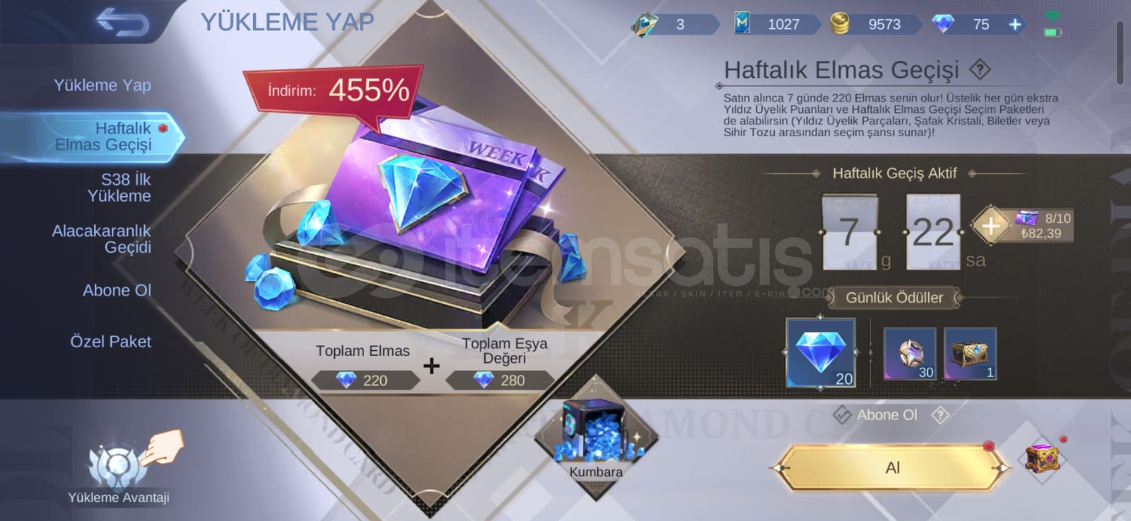 7 günlük ıd kartı 50 elmasa alabilirsiniz haftalık geçiş var zaten 7 günlük ayrıyetten 95 elmas var hesapta