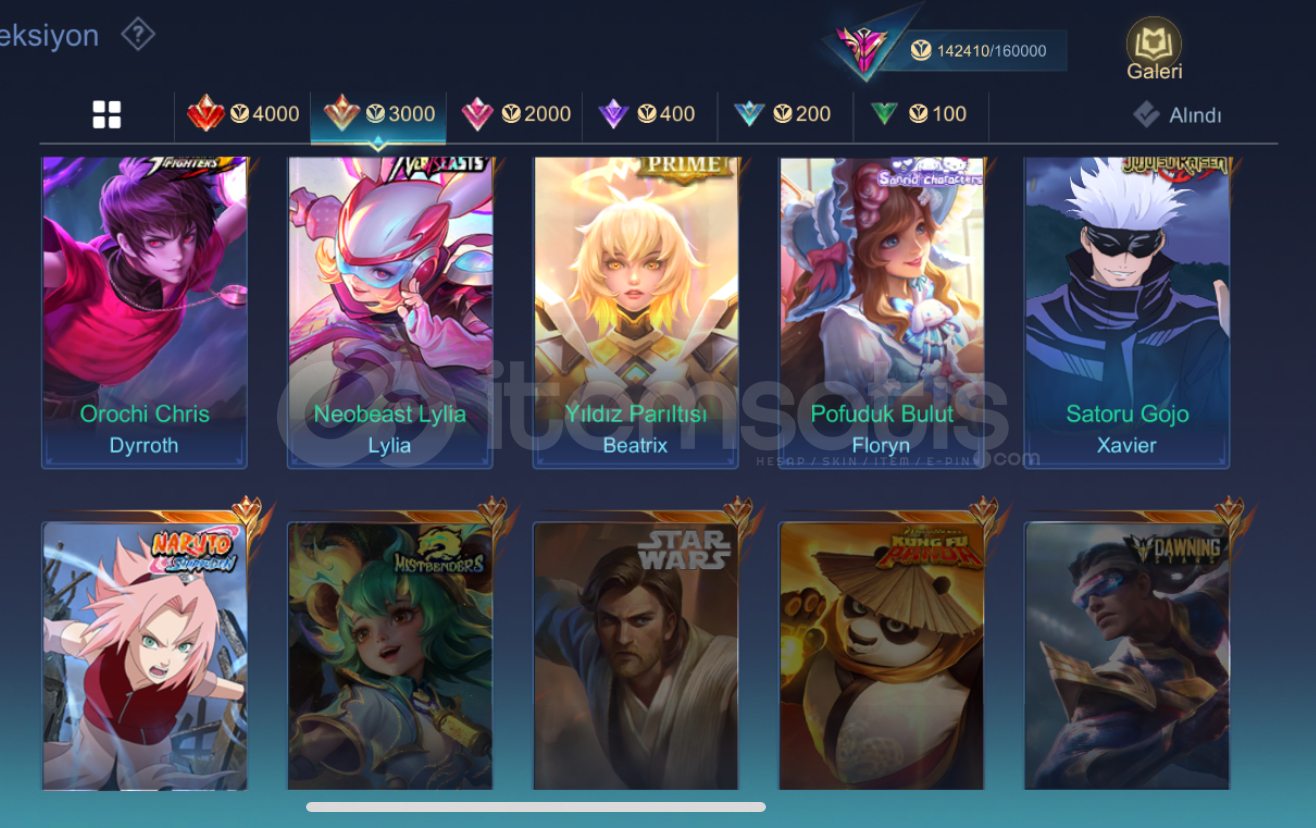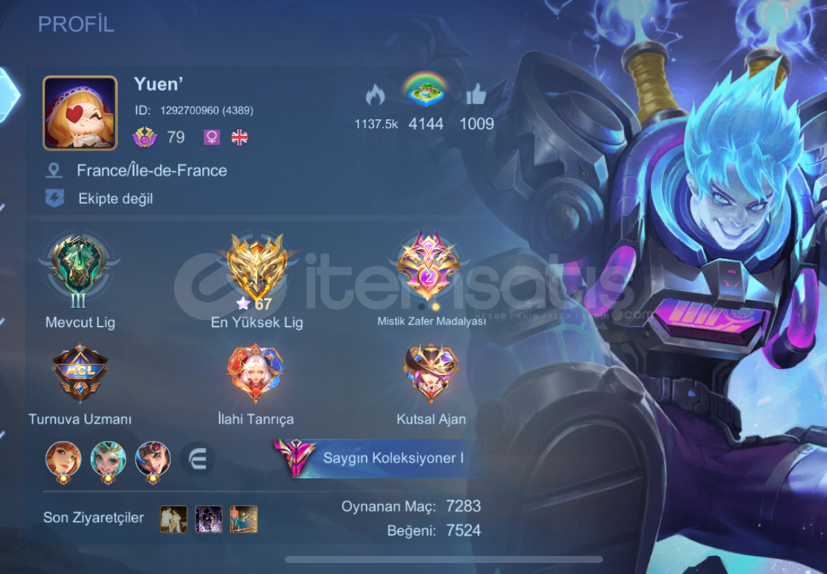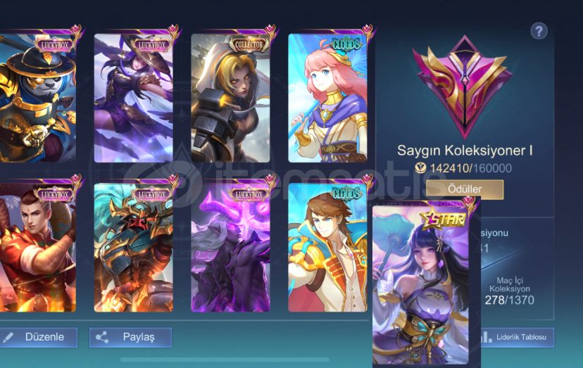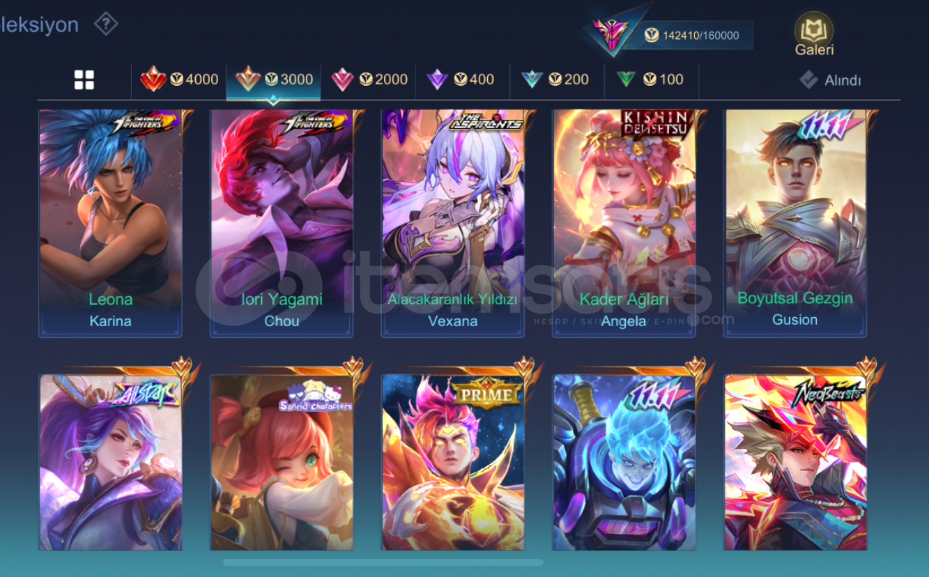 Hesapta her koridora ait hero ve kostüm bulunmaktadır.Düzenli oynanmamış dönemleri olduğu için geliştirmeye ve kasılmaya oldukça uygundur.Hesapta iki adet Fransa tagı (Lunox & Carmilla – S37) mevcuttur.22 günlük haftalık elmas aktiftir (24.12.26 itibarıyla) ve hesapta kalan elmas ile istenilen bir adet Attack on Titan kostümü alınabilir.