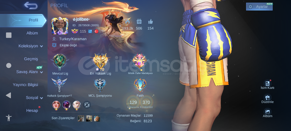 GÜNCEL OLARAK SATIŞTADIR. İŞLEMLER ANINDA BAŞLAR!Hesap resimdeki gibidir. Tek bağ moonton, moonton'a bağlı e posta değişimi ile teslim.YILBAŞI ÖNCESİ ÖZEL FİYATLA SATILIK SON FIRSAT!Hesap TR değildir. Filipin ID hesaptır. Filipin elmas yüklenir. TR yüklenmez. Eşleşme sistemi ile hesabın elmas bölgesinin Filipin olmasının alakası yoktur. Hangi ülkedeyseniz hangi i...
