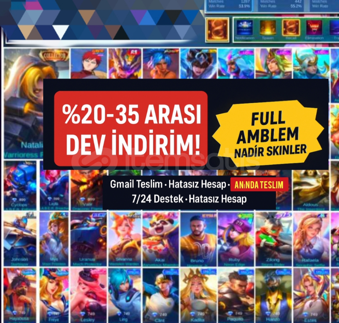 📌 HESAP ÖZELLİKLERİ⭐ Hero Sayısı: 80–100 (oyunda zaten Max 130 hero var)🎨 Skin Sayısı: 100-130🛡️ Amblemler: En kötü Amblem seviyesi bile 45. Çoğu Max seviye.🏆 Lig: Efsane / Mistik🎁 Nadir Skinler: ( Collector, Epic, Zodiac, Starlight, Collaboration)📧 Gmail teslim edilir – Tam erişim sizin olur.📌 Neden Bu Hesap?Hatasız – Temiz – Ban riski ...