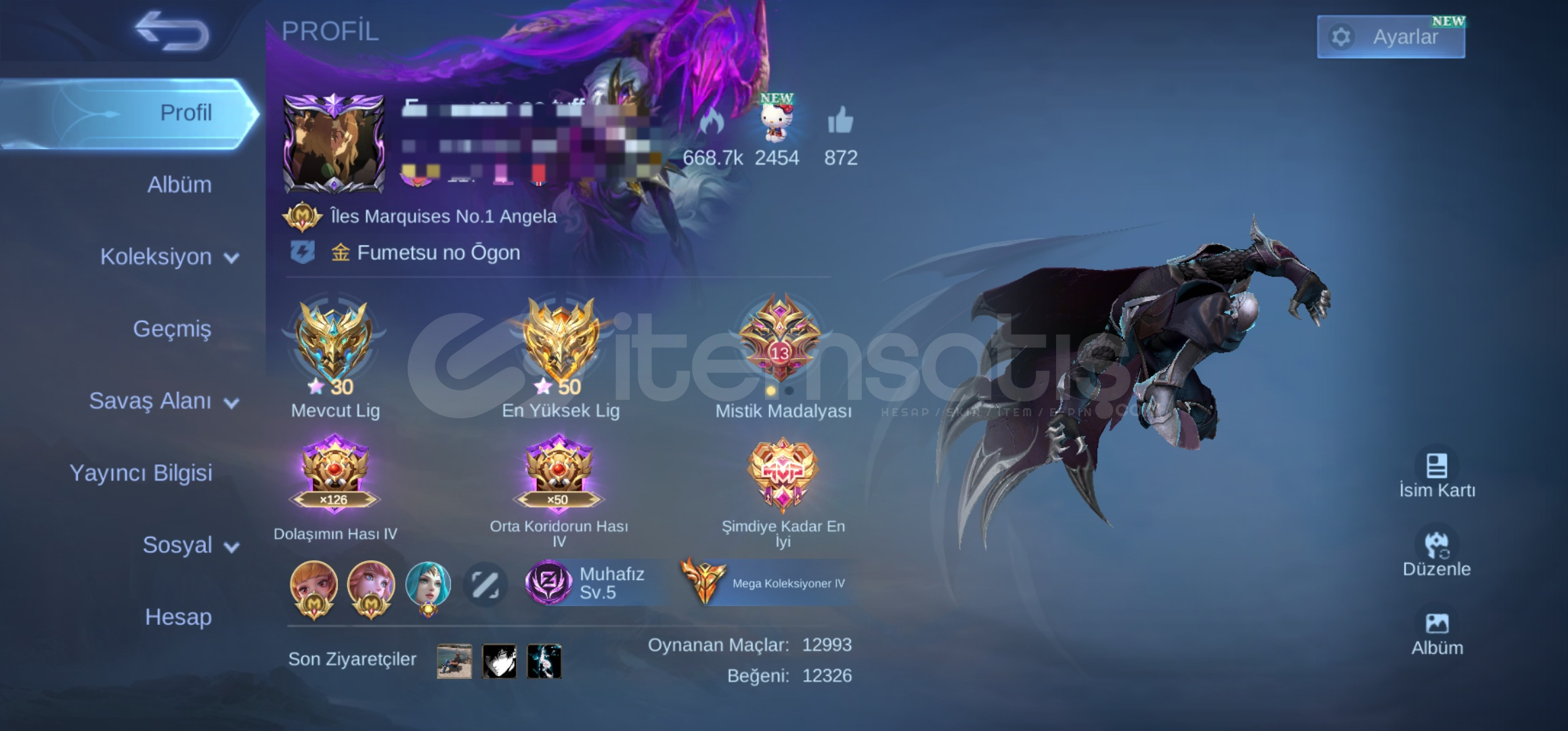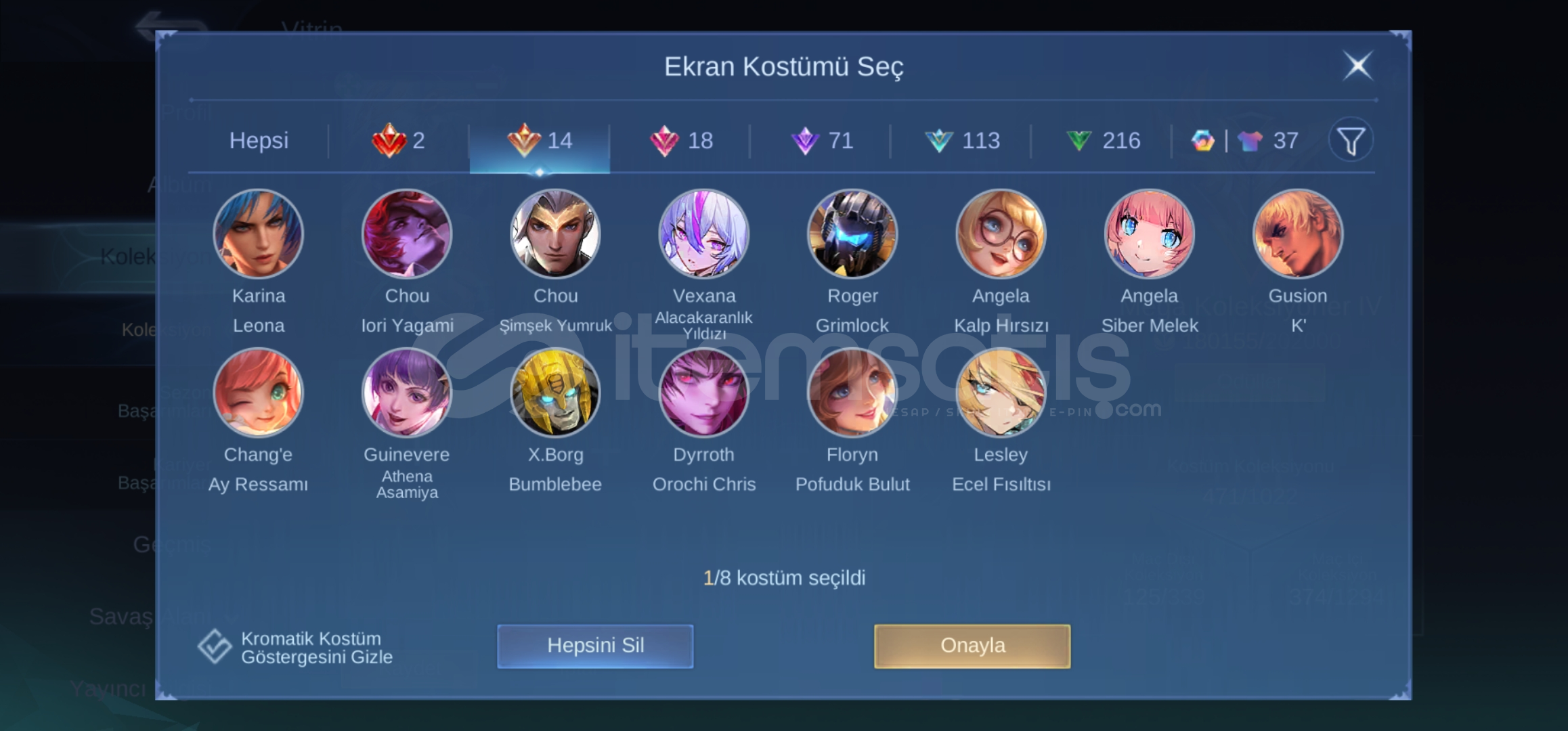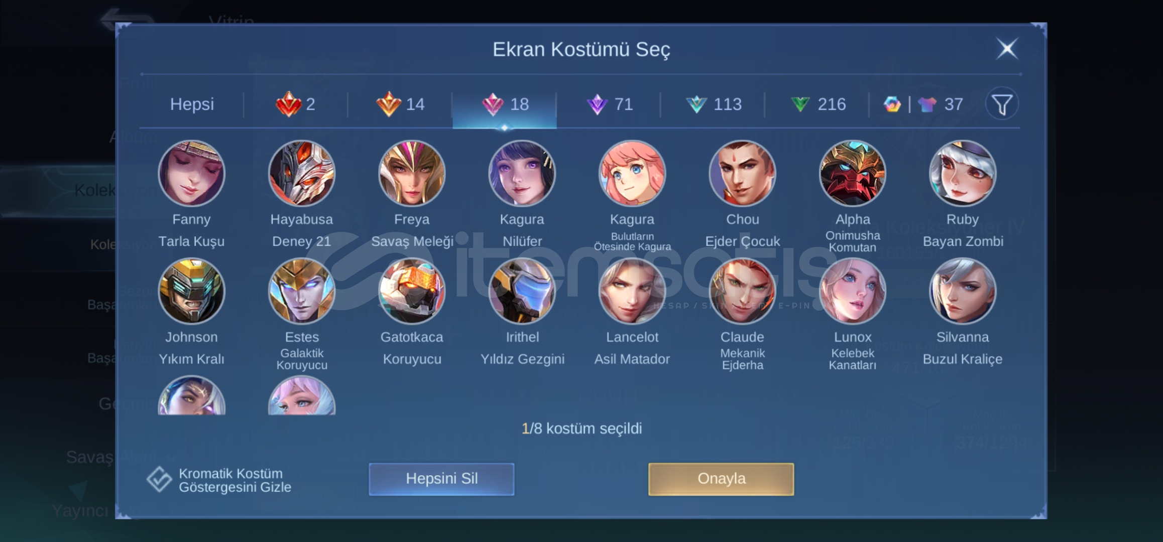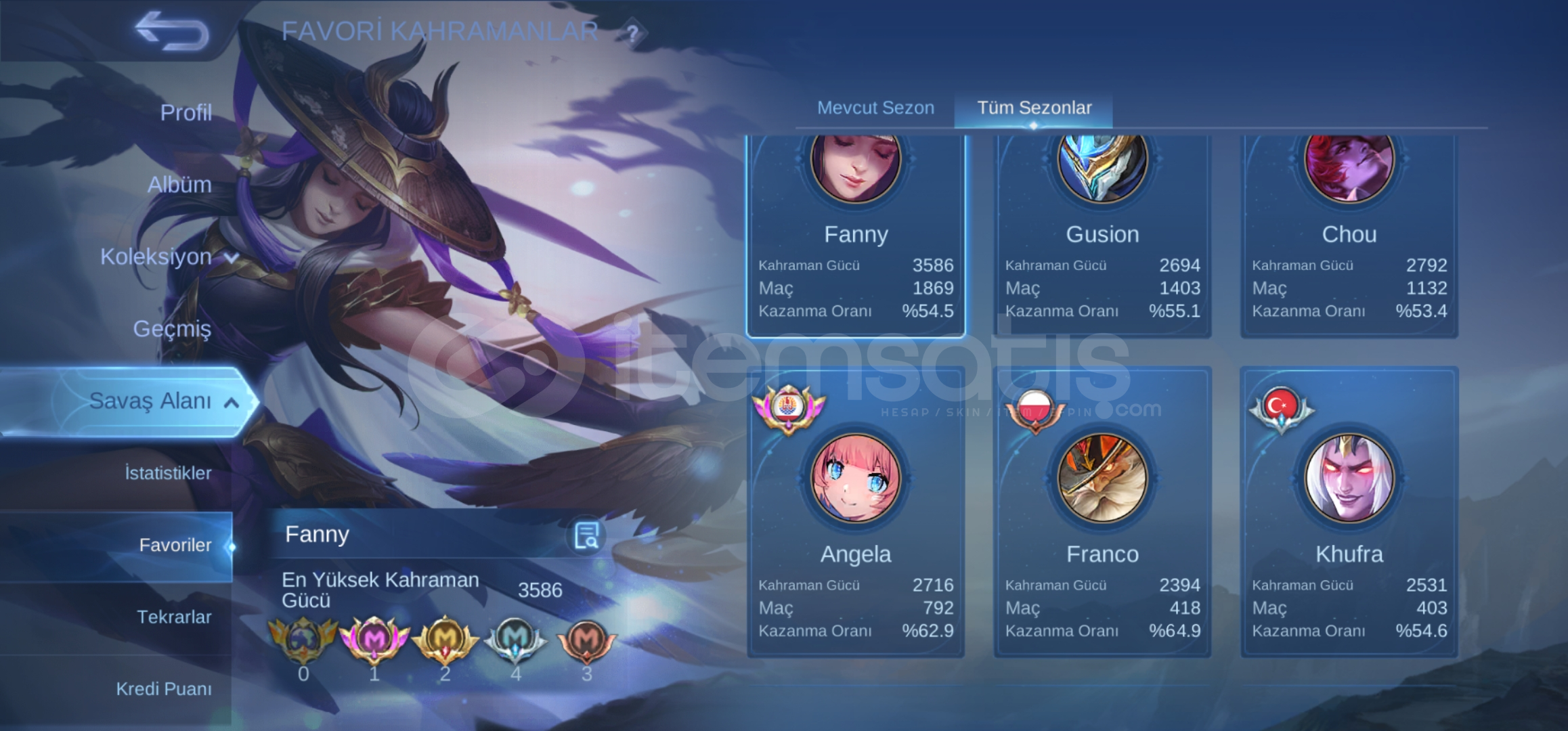 İÇERİSİNDE GUSION VE JOHNSON BULUNUR1 EPIC BASE BULUNURBÜTÜN KARAKTERLER AÇIKTIR VE AMBLEMLER FULLDURORANLARI ORTA 50+ 60+1 isim değiştirme kartı bulunur 7 günlük106 elmas var