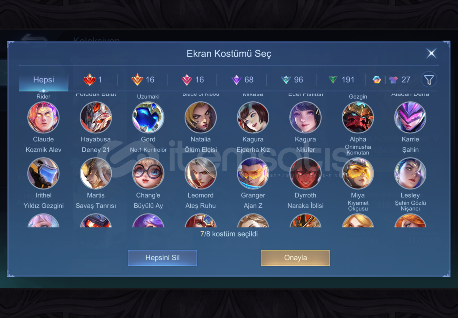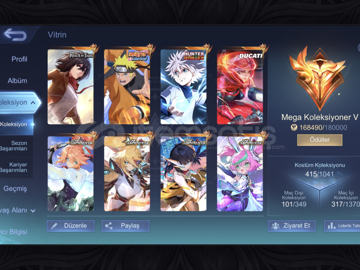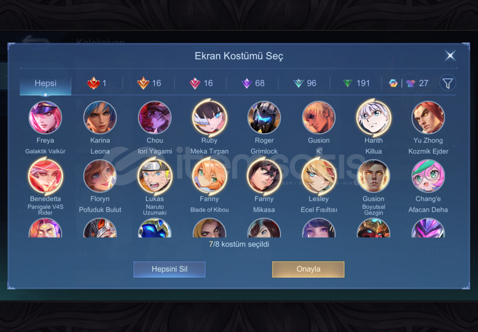 hesap mega 5 e göre özel kostümler içerir her animeden 1 kostüm vardır