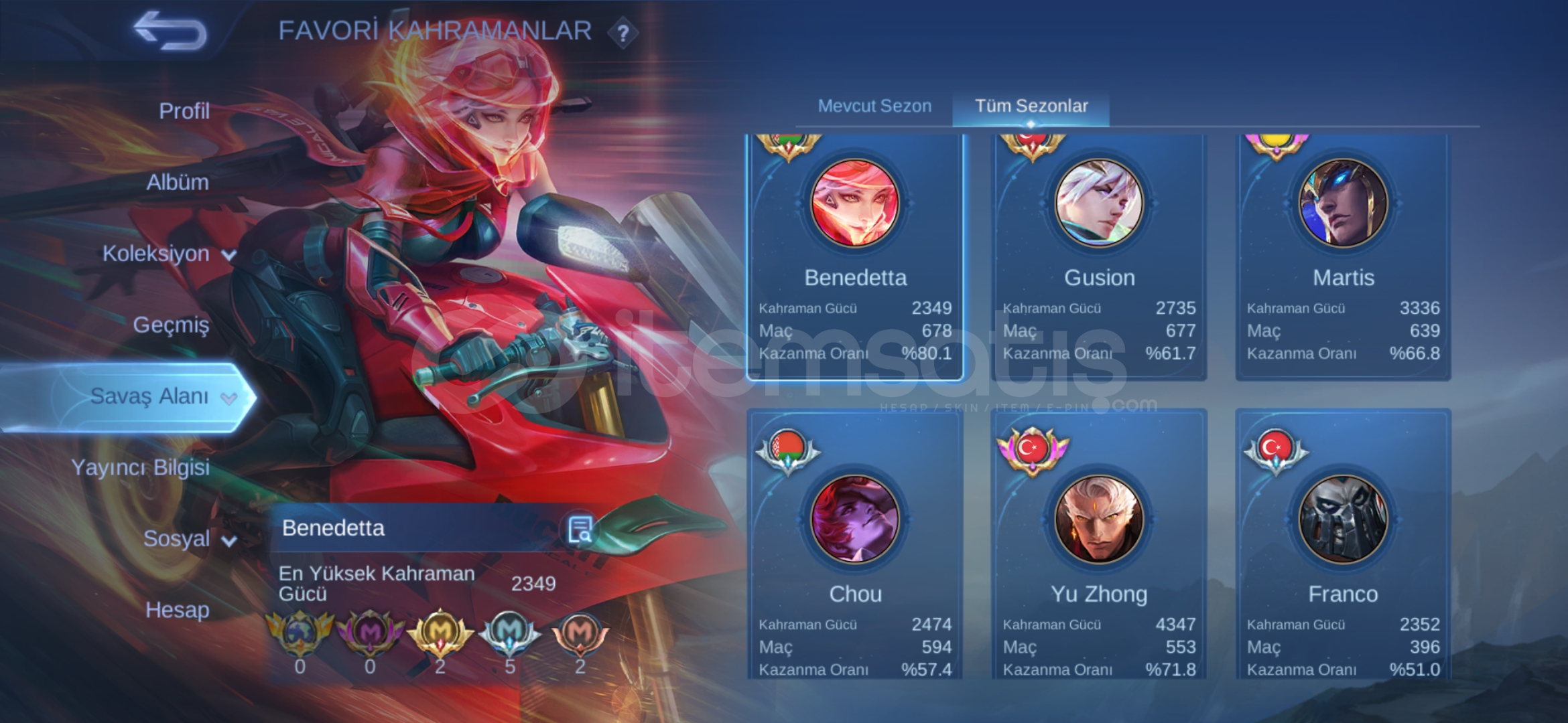 Mlbb çift hesabıdır aşinalık yüksek ilandaki iki hesap vardır beraber satıştadır hesaplarla ilgili merak ettiğiniz bilgiler için mesaj atabilirsinizFotoğraflarda olmayan bazı hesap içerikleriHesapların maxıBiri 150 Yıldız Diğeri 135 YıldızNovaria,Lesley,Esmeralda,Floryn,Arlott,Brody,Yss CollectorHesapların Genel Maç SayılarıBenedetta main hesap19762 maç...