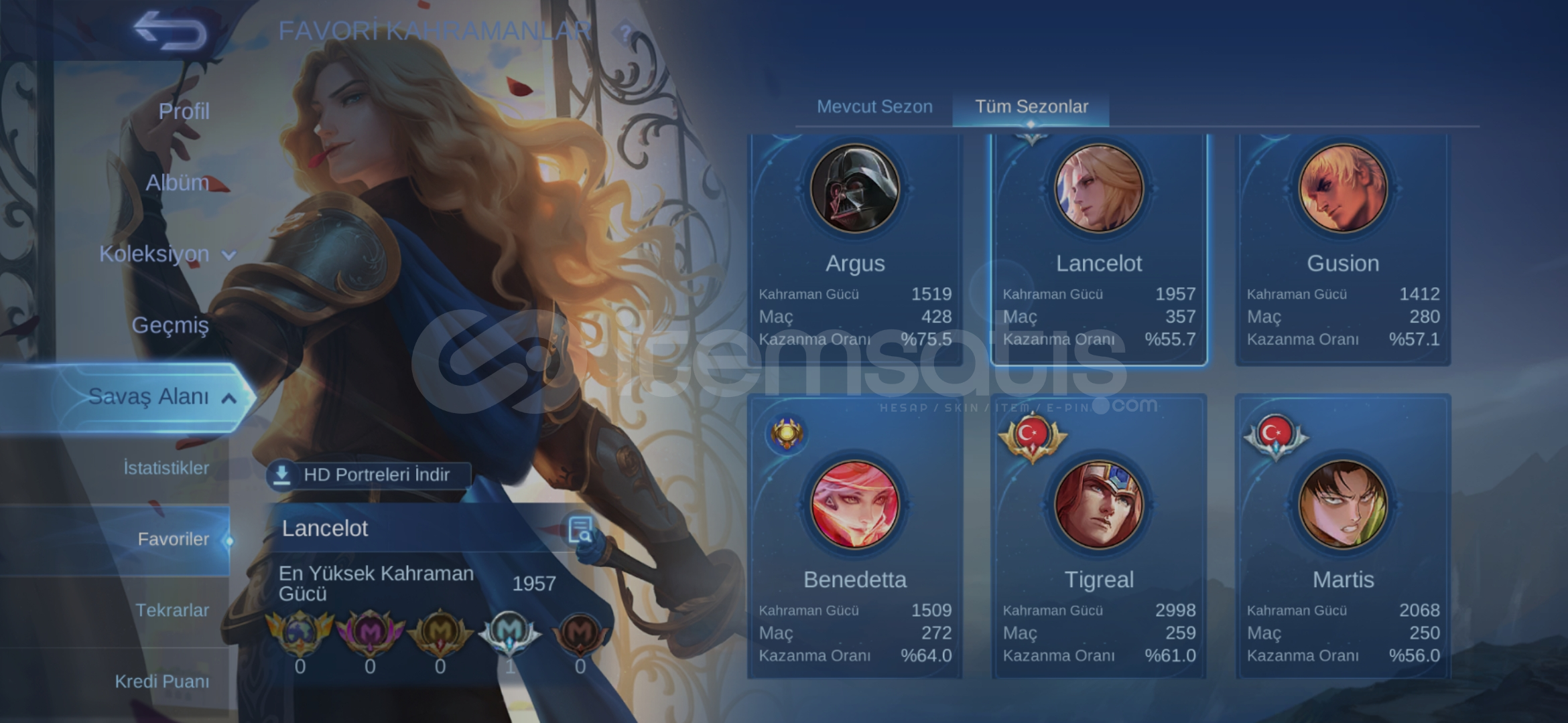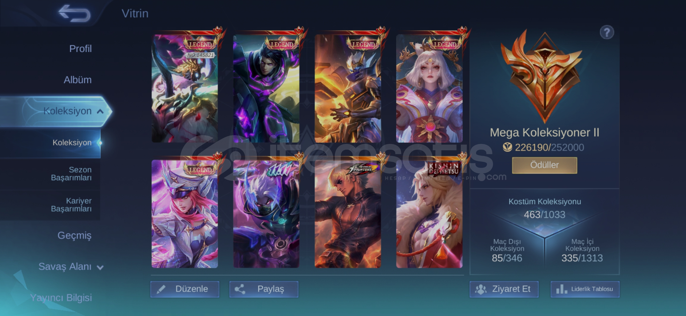 464 kostüm mega koleksiyoner 2 karakterler full oranlar ortalama 60 gus kof haya 11.11 ling neobeast 5 legend ve daha birçok kostüm mevcuttur amblemleri full max yıldızı 53 tür 1k şafak kristali bulunmaktadır hesapta 1 aylık haftalık elmas geçişi mevcuttur e posta devri yapılacaktır.