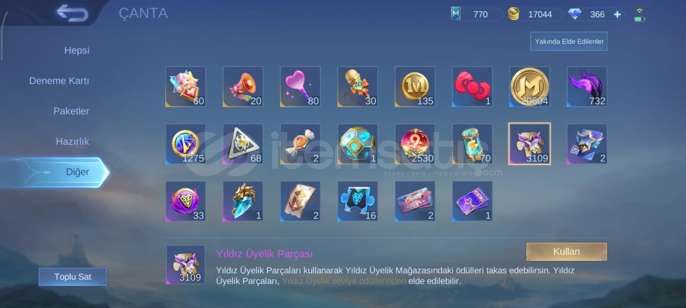 Hesapta 360 elmas vardır Yıldız üyelik kartı 2 tane mevcuttur6 aylık yıldız hesap alınmıştı...