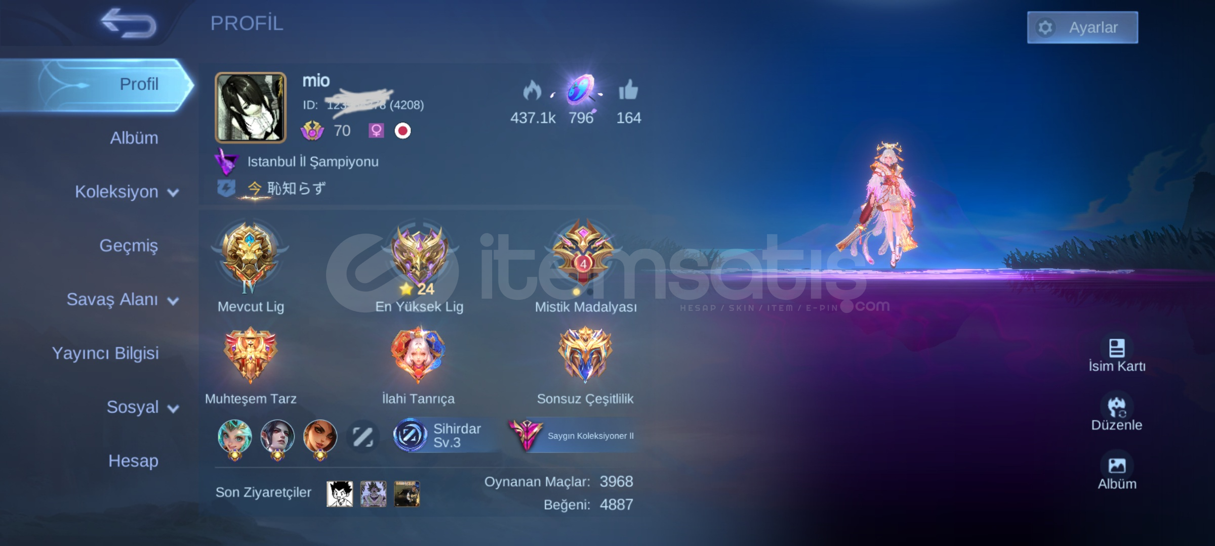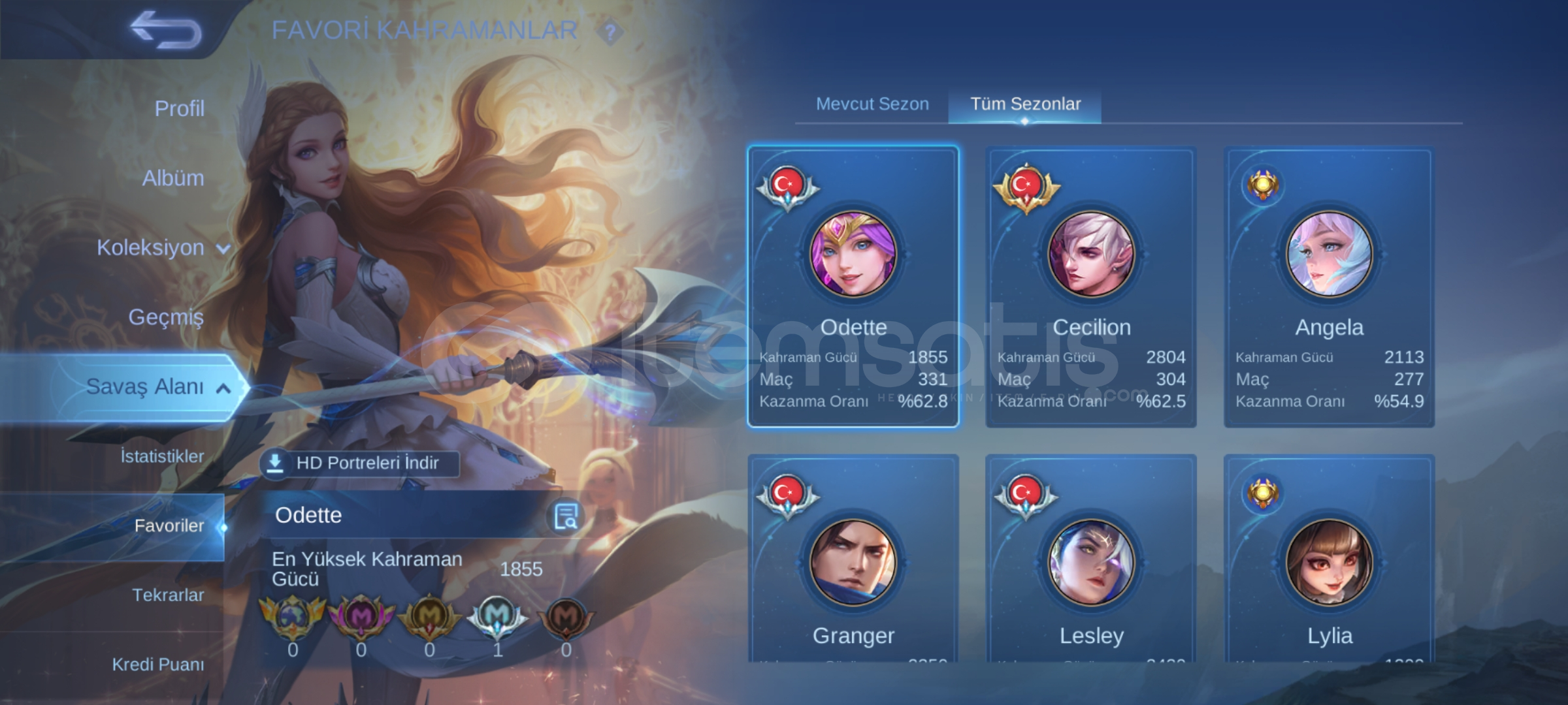 birçok kostüm vardır, özellikle epik kostümlerin neredeyse çoğu vardır. tüm kahramanlar vardır. amblemlerin hepsi 60. toplam neredeyse 4k maçı var. %54 kazanma oranı. 280000 altını vardır. emoji ve çerçeve çeşitleri yüksek. beş yıllık hesap, artık oynamadığım için bırakıyorum. lig pek kasmadım, o yüzden uyguna salı...