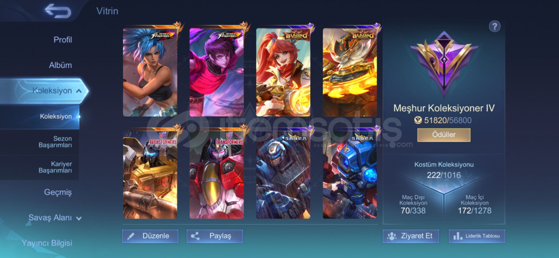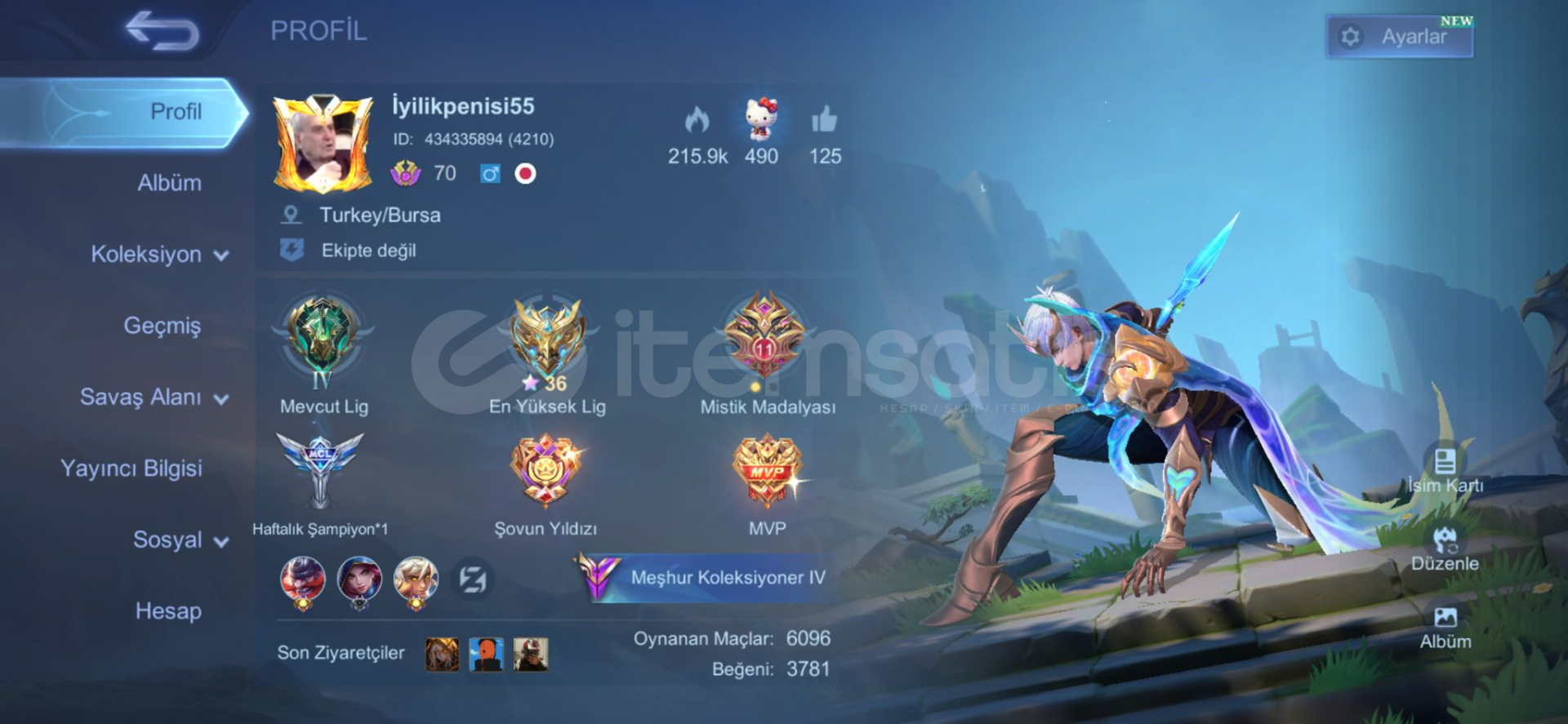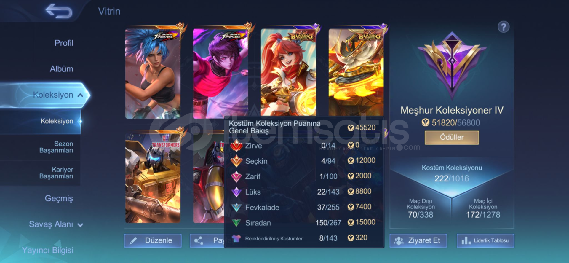 Şanlı mistik 36 maks70 gökyüzü leveli222 köstümamblemler full122 karakter vardır960 maç franco 53 orangus 602 maç 57 oranPAZARLIK PAYI VARDIR