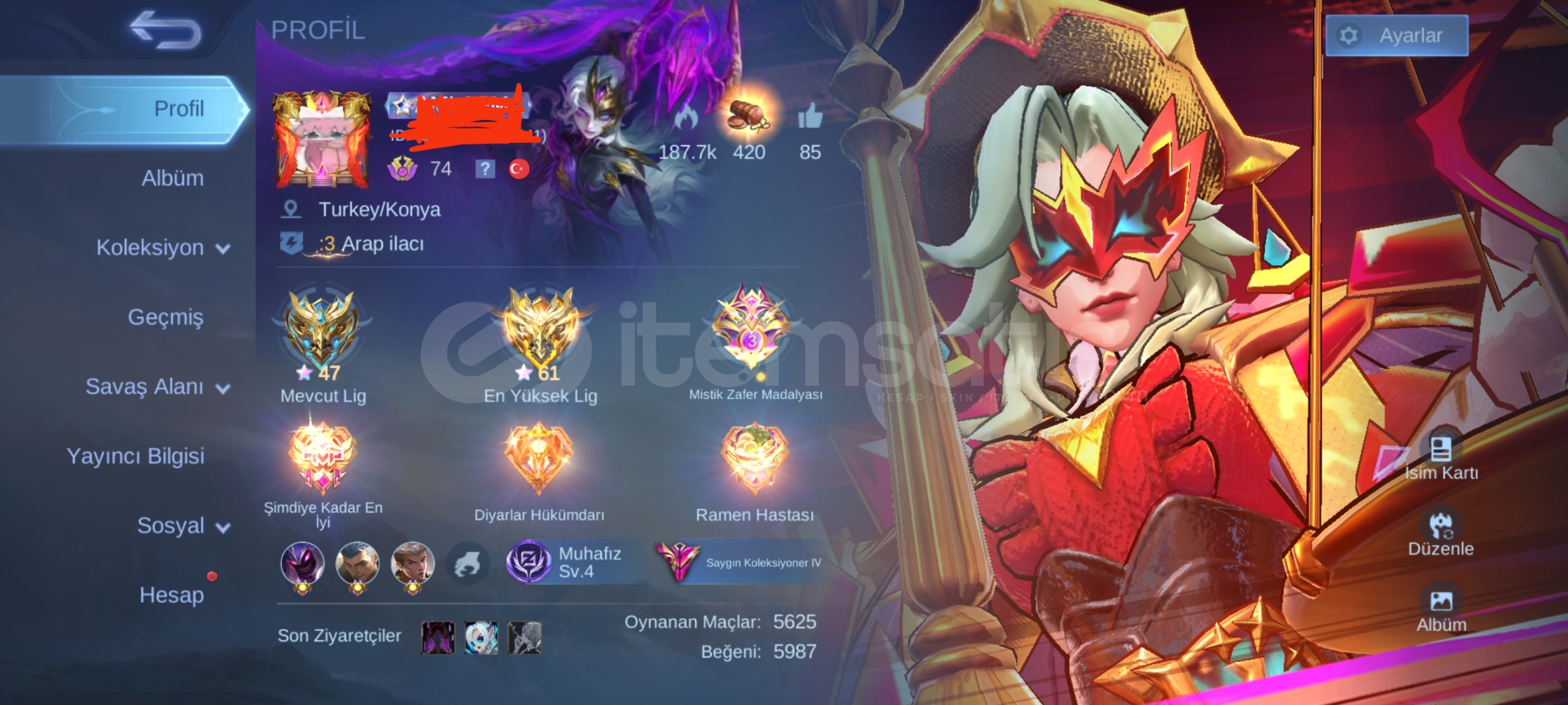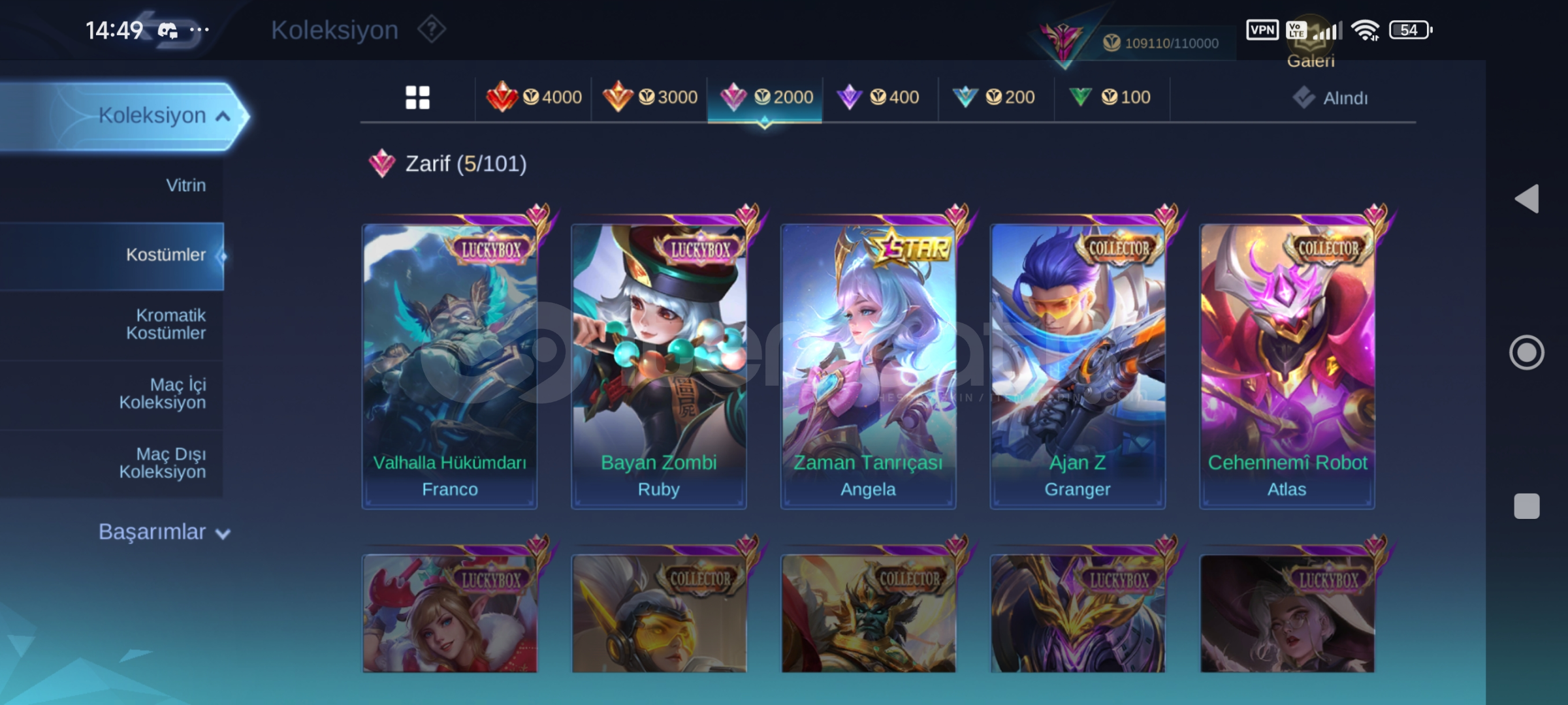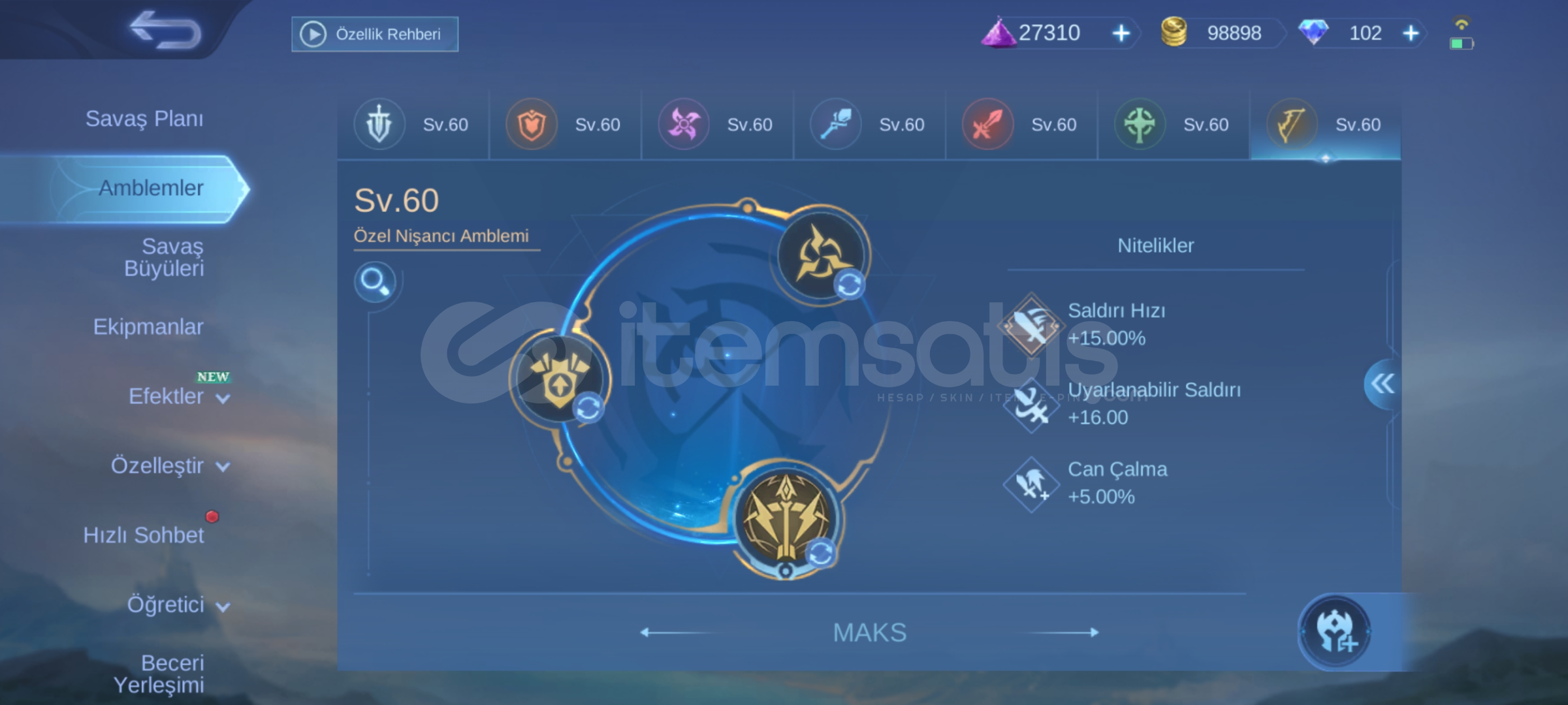 Hesap detayları için mesaj atabilirsiniz .Hesapta bütün kahramanlar mevcuttur .Bütün amblemler mevcuttur.Hesapta 100 elmas+23 günde haftalık paket süresi vardır.