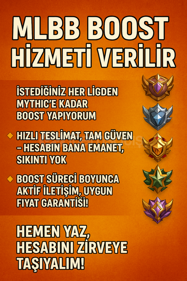 MLBB (Mobile Legends: Bang Bang) boost hizmeti verilir. İstediğiniz her ligden MİSTİĞE kadar güvenli ve hızlı şekilde çıkarılır. Teslimatlar kısa sürede ve garantili yapılır. Hesabınız güvende, bilgileriniz gizli tutulur. Uygun fiyat, profesyonel oyun deneyimi, yüksek win oranı!💬 Detaylı bilgi ve fiyatlandırma için mesaj atmanız yeterli.