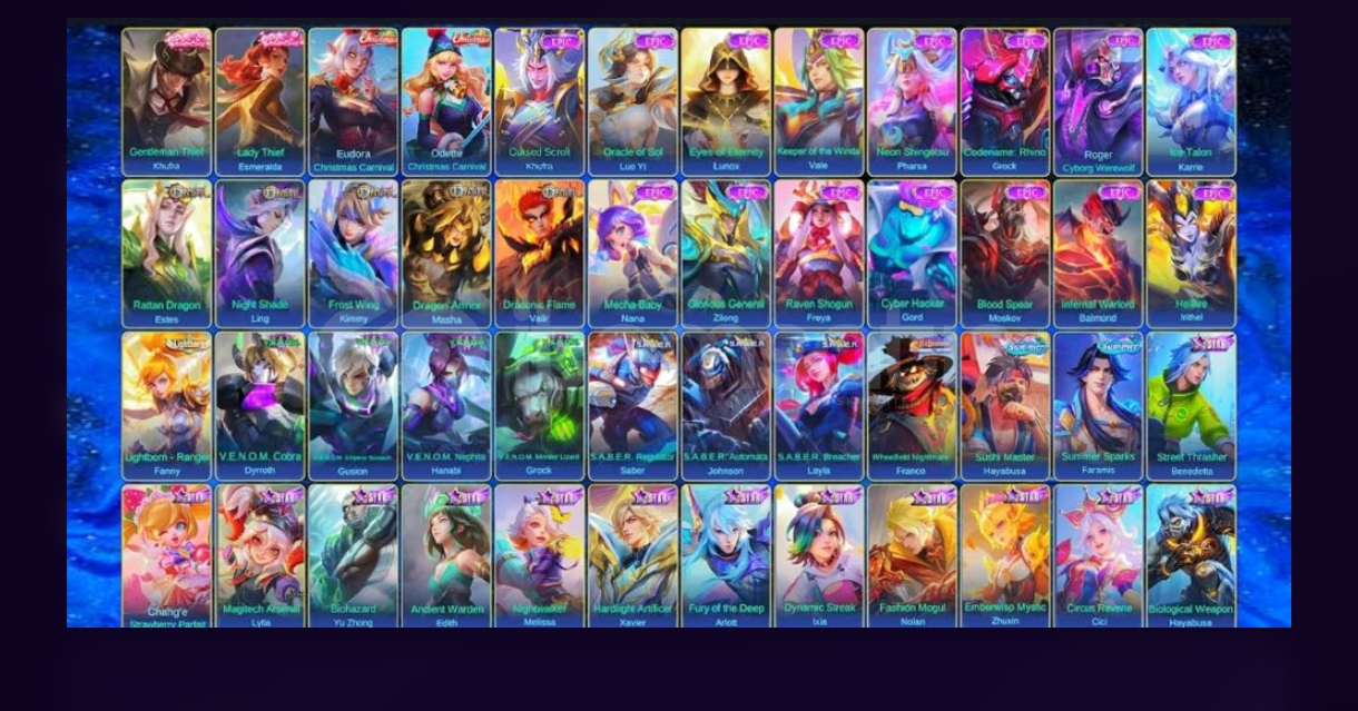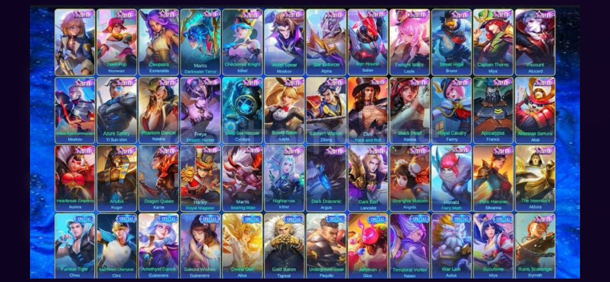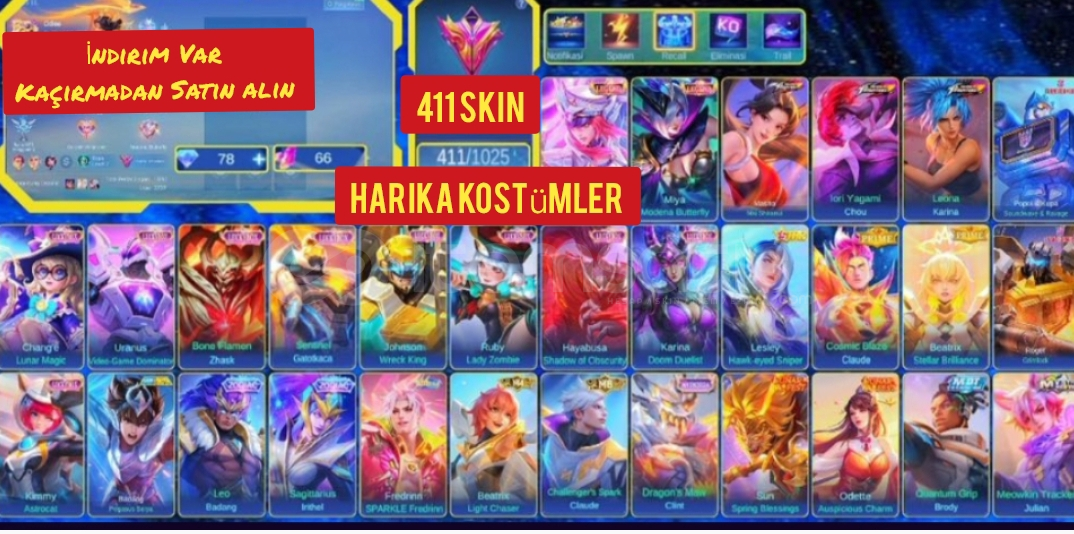 🌟 En Yüksek Lig: 62🎨 Toplam Skin Sayısı: 411---✨ Skin Detayları👑 Efsanevi (Legendary): Miya, Freya🥋 KOF: Karina, Chou, Masha💎 Prime: Claude, Beatrix🤖 Transformers: Popol & Kupa, Roger🌈 Sparkle: Fredrinn🏆 Annual Stars: Lesley♈ Zodiac: Badang, Irithel🐾 Mystic Mew: Julian🎖️ M-Series: M6 Claude, M4 Beatrix⚔️ Saint Seiya Bronze: Badang🔮 Mythical: Faramis, Clint&...