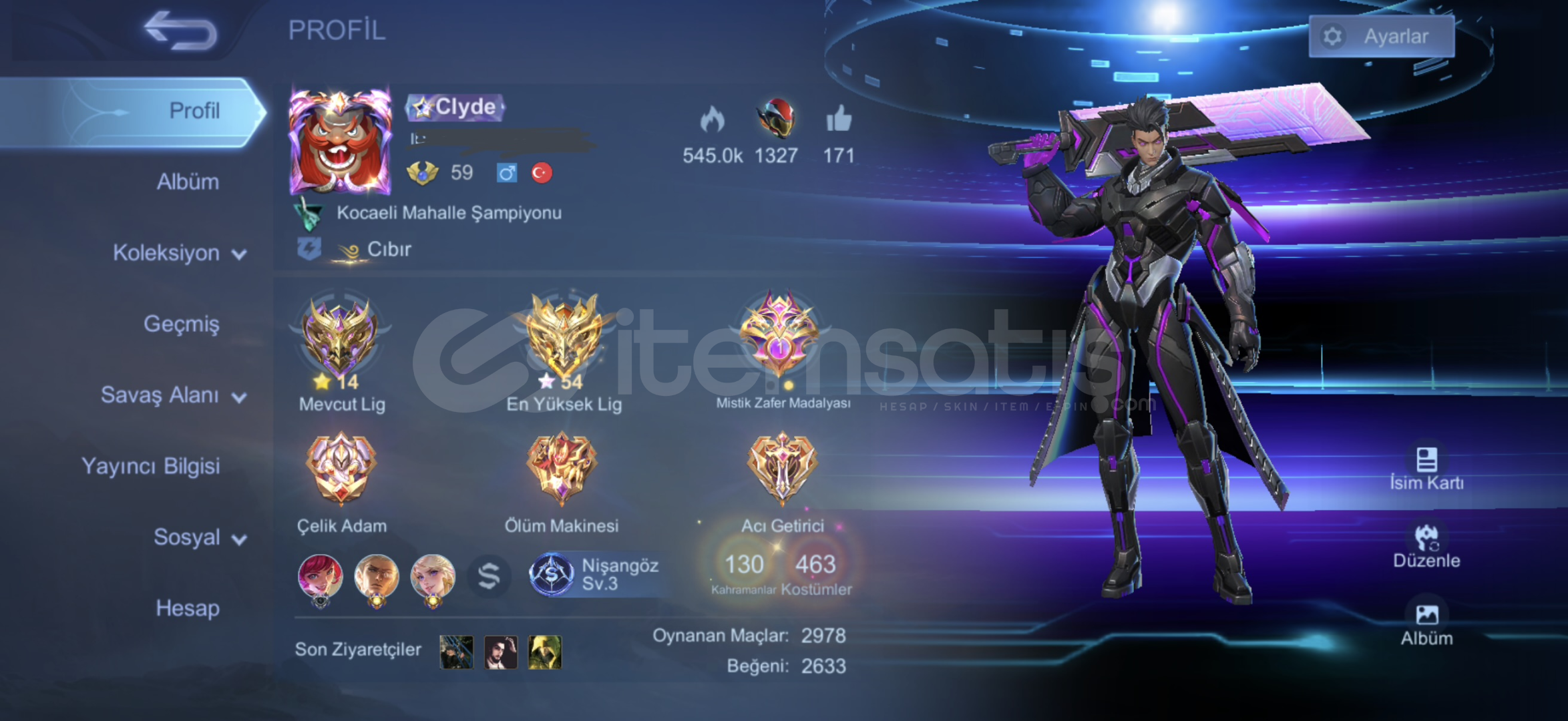 59 seviye full karakter yüksek oran mistik 14 yıldız max lig mistik zafer 54 yıldız her sezon mistik bitirmiş hesap en düşük 8 sezondur aktif hesap 463 kostüm güvenilir geri çekme vs yok oyunu oynamıyorum geleni üzmene isteyene saraylı video atabilen wp den