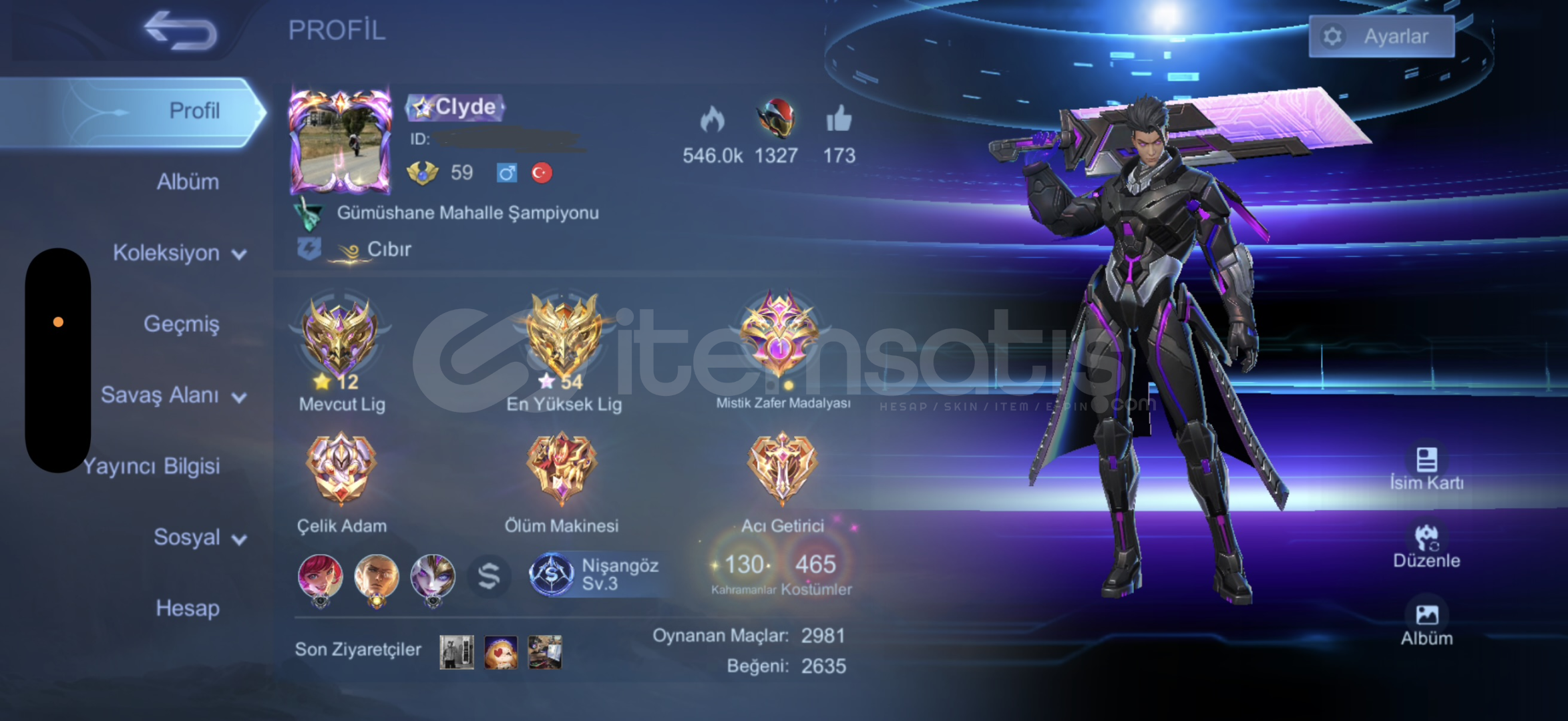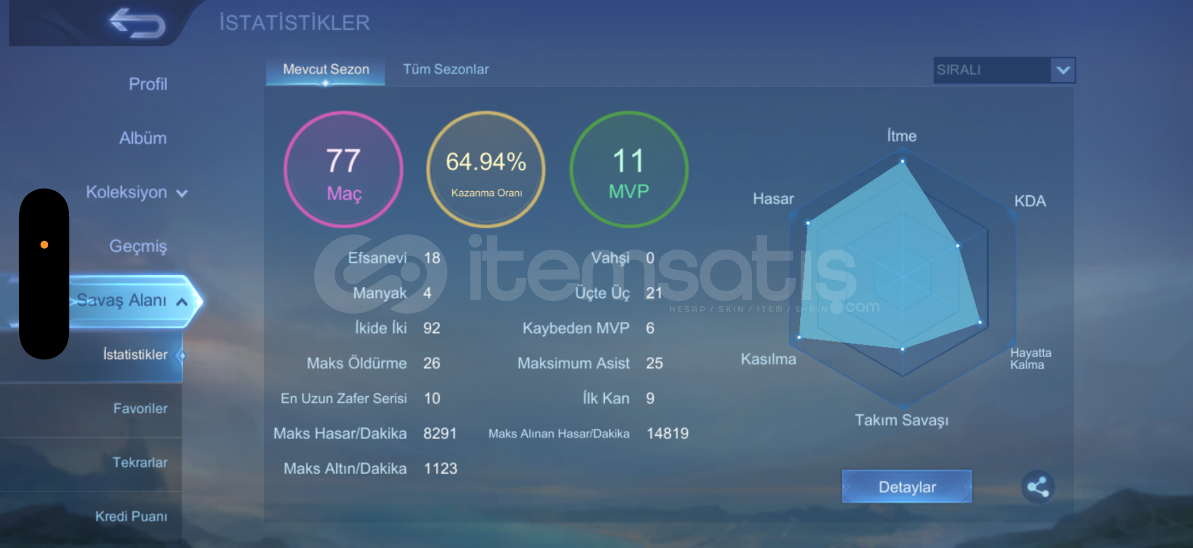 59 seviye full karakter yüksek oran mistik 12 yıldız max lig mistik zafer 54 yıldız her sezon mistik bitirmiş hesap 8 sezondur aktif hesap 465 kostüm güvenilir geri çekme vs yok oyunu oynamıyorum geleni üzmene isteyene video atabilen wp den ekip yanında hediye