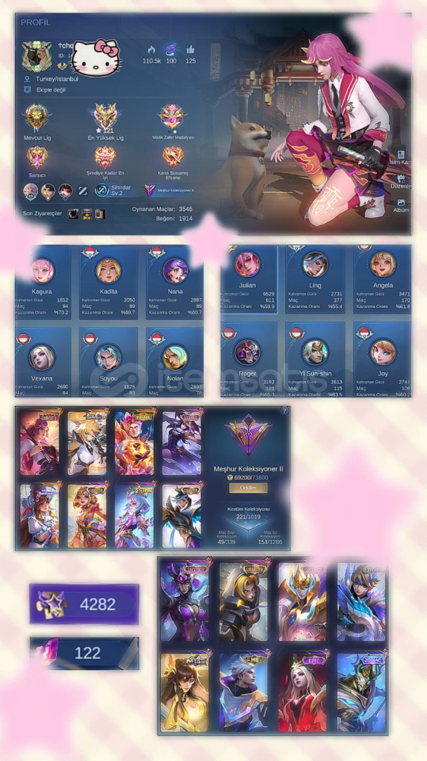 💖✨uygun bütçeli hesap🌸💐🎀🌷max 121 yıldız✨♡oranları güzel🌷egzorsist kagura, asp les, coll ling,tarla kuşu fanny, prime claude..✨♡4282 yıldız üyelik parçası🌷122 büyü çekirdeği iletişim için DM💖
