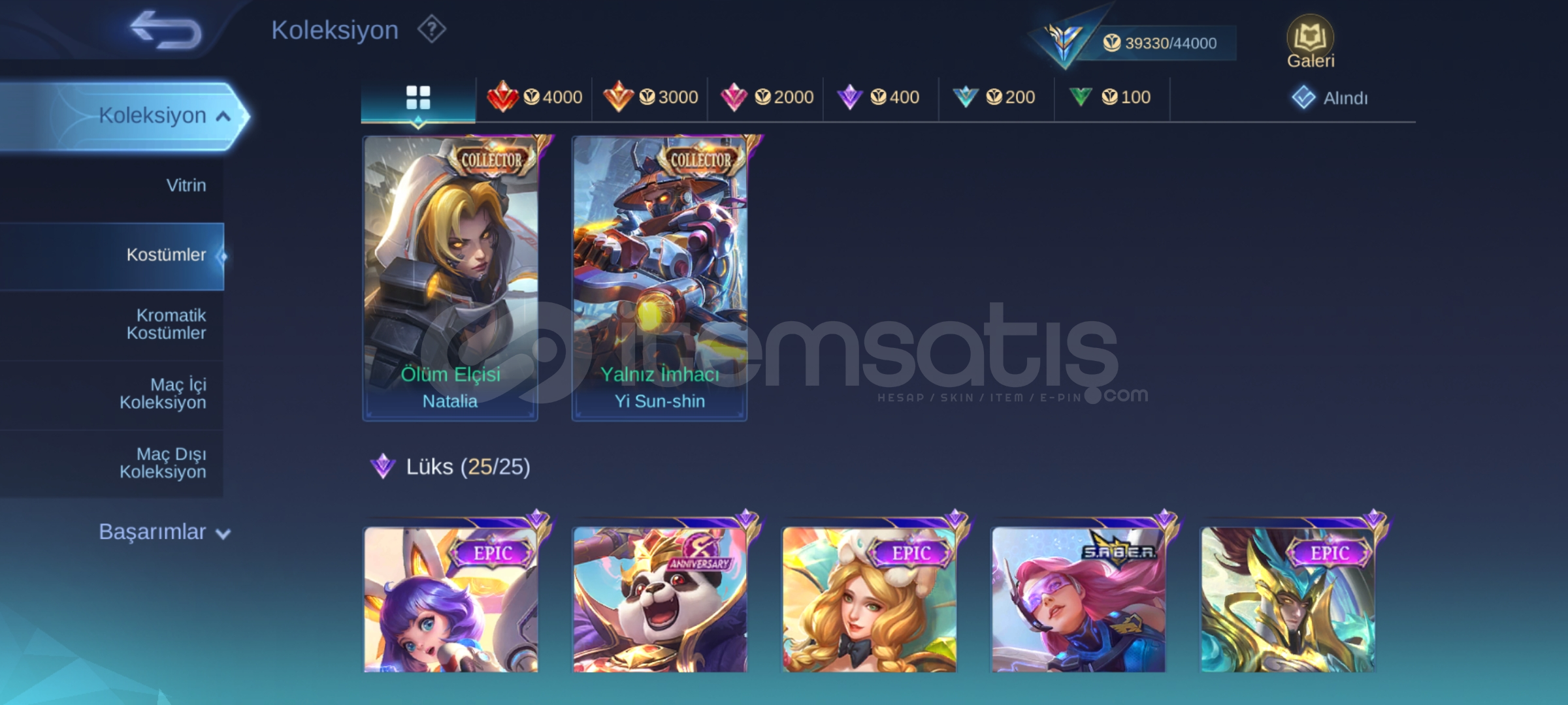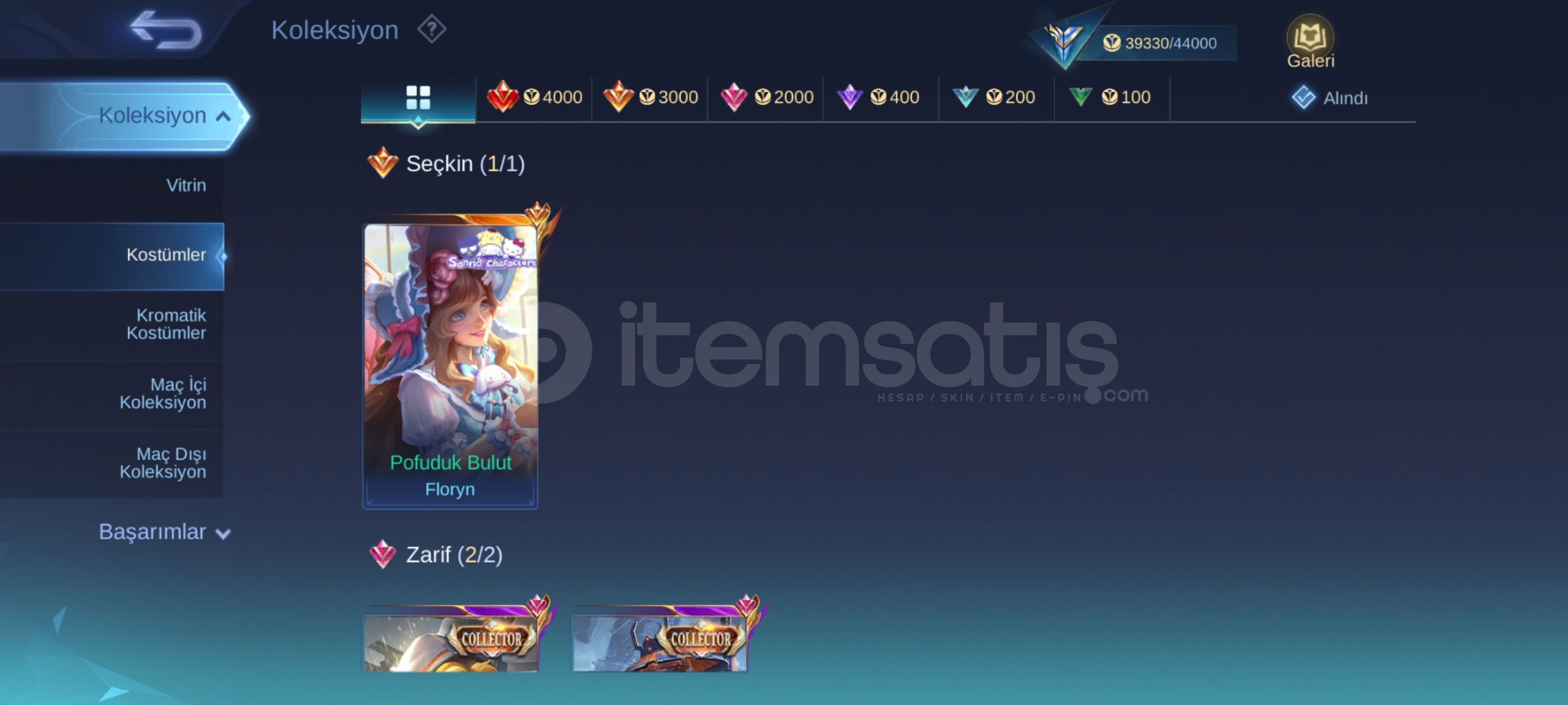 Nadir Natalia Collector ve Yi Sun-shin Collector kostümleri mevcuttur.SINIRLI İŞBİRLİĞİ: Bir daha gelmeyecek Floryn Sanrio Characters özel kostümü.TOPLAM KOSTÜM SAYISI: Tam 163 adet kostüm! (Tüm rollere uygun çeşitlilik, mid oynayacaklar için daha iyi bi hesap)AMBLEM SEVİYESİ: En kritik amblemlerden Özel Büyücü Amblemi (Mage Emblem) Max Seviye (Sv. 60)!Diğer önemli amblemle...