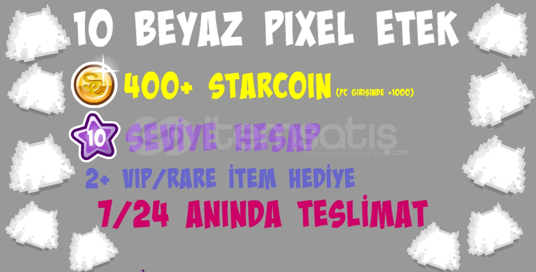 10 PIXEL ETEK450+ StarCoin (PC girişinde +1000)10 SEVİYE HESAP2+ Level-up VIP/Rare/DP Item7/24 ANINDA OTOMATİK TESLİMATSipariş, söz konusu ürünlerin içerisinde olduğu bir hesap şeklinde teslim edilmektedir.Hesaplar içerisindeki itemler belirli renk paketleri özelinde, estetik kaygılar güdülerek renklendirilmiştir.Her türlü soru, istek, şikayet için buradan ve ekten ulaşabilirsiniz;...