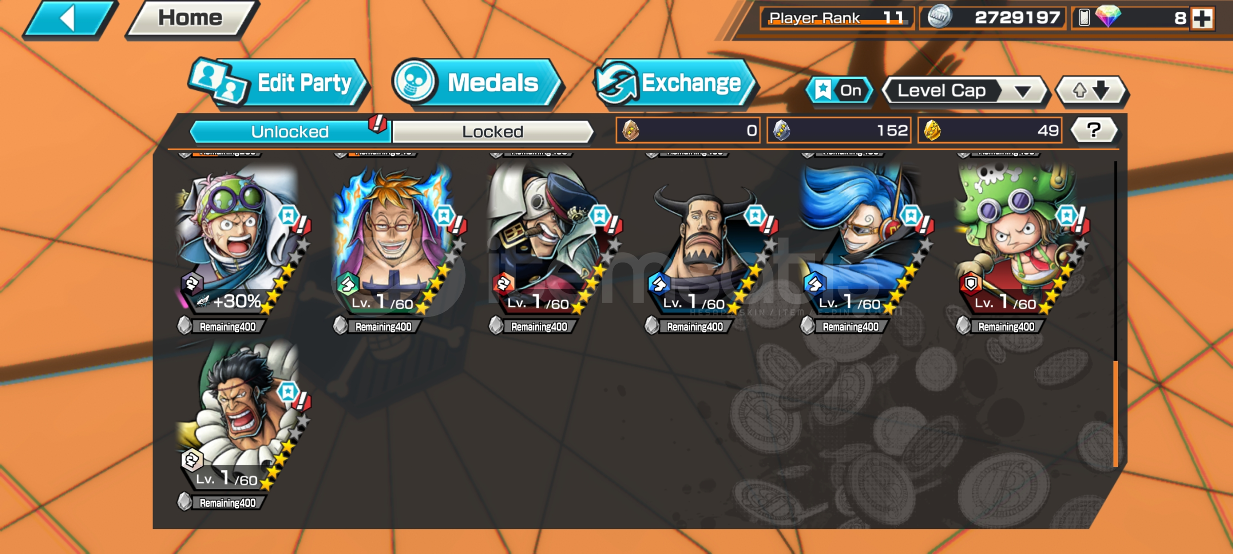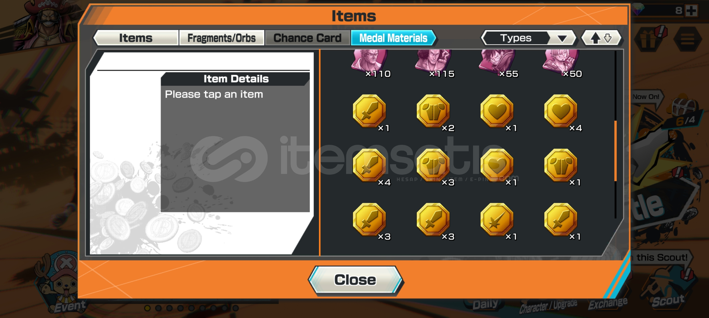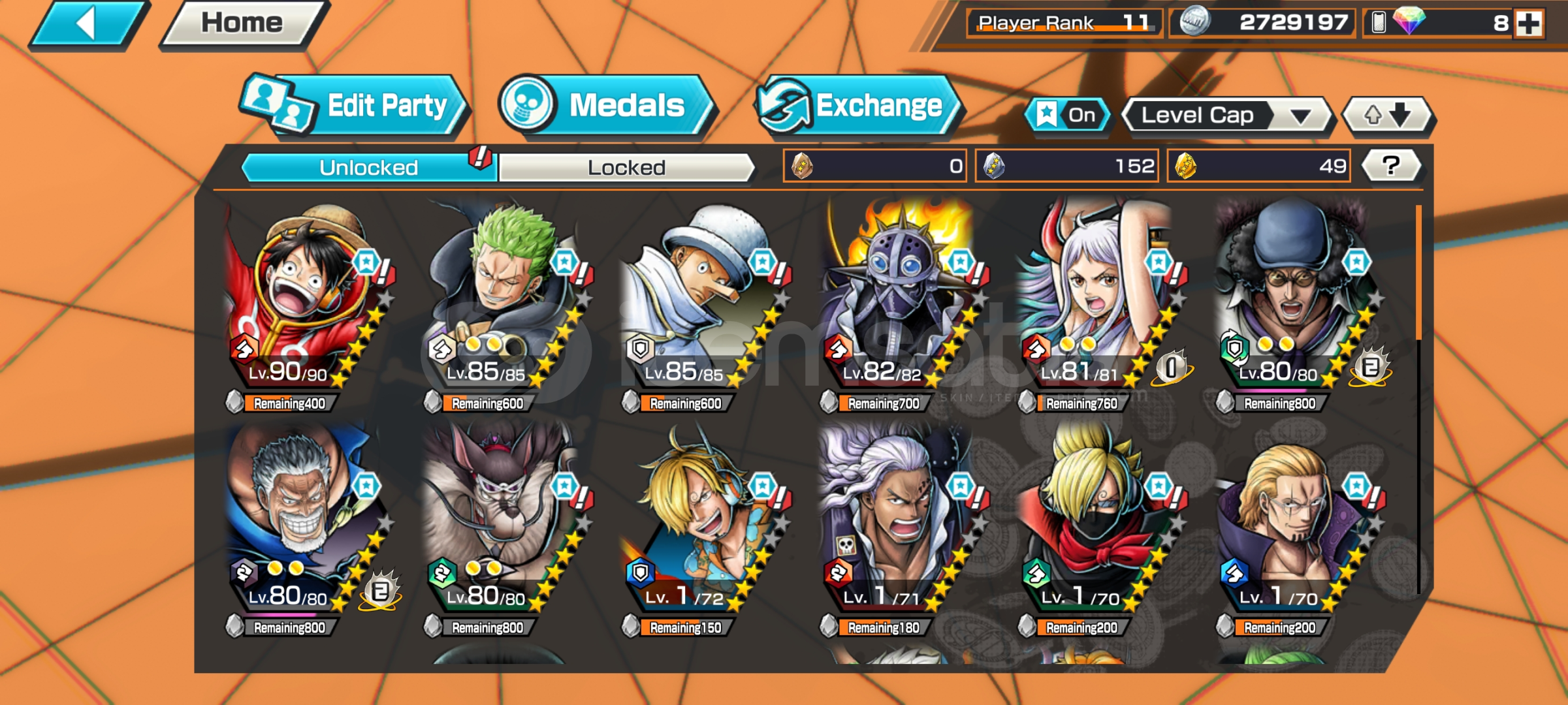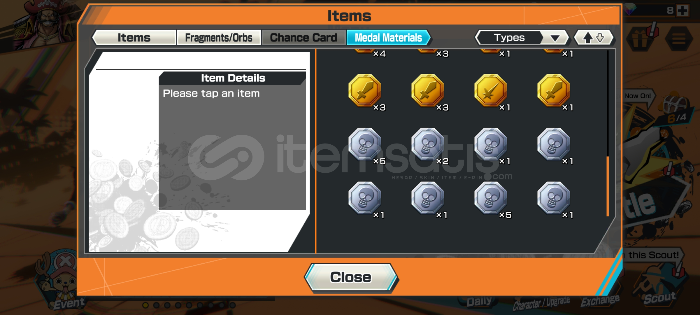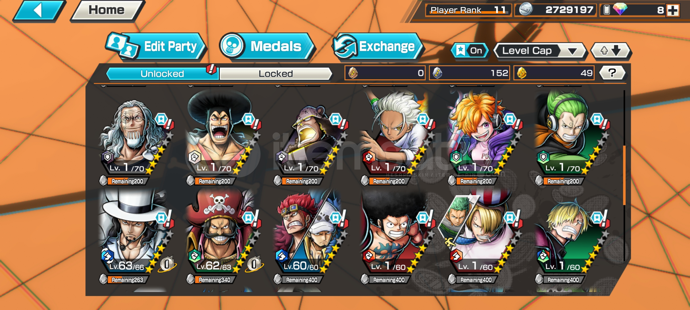Hesap çok güzel yeni başlama hesapı hesapta çok güzel yeni Kahramanlar var hesaptaki exlerKaido's Son Yamato Level:81Black Pirates Kuzan Aukiji Level:80Legendary Heroe Monkey D. Garp Level:80Awakened From Rob Lucci Level:66King of Pirates Gol D. Roger level:63Battle of Monsters on Onigashima Kid&Law level:60Alıcısına şimdiden hayırlı olsun