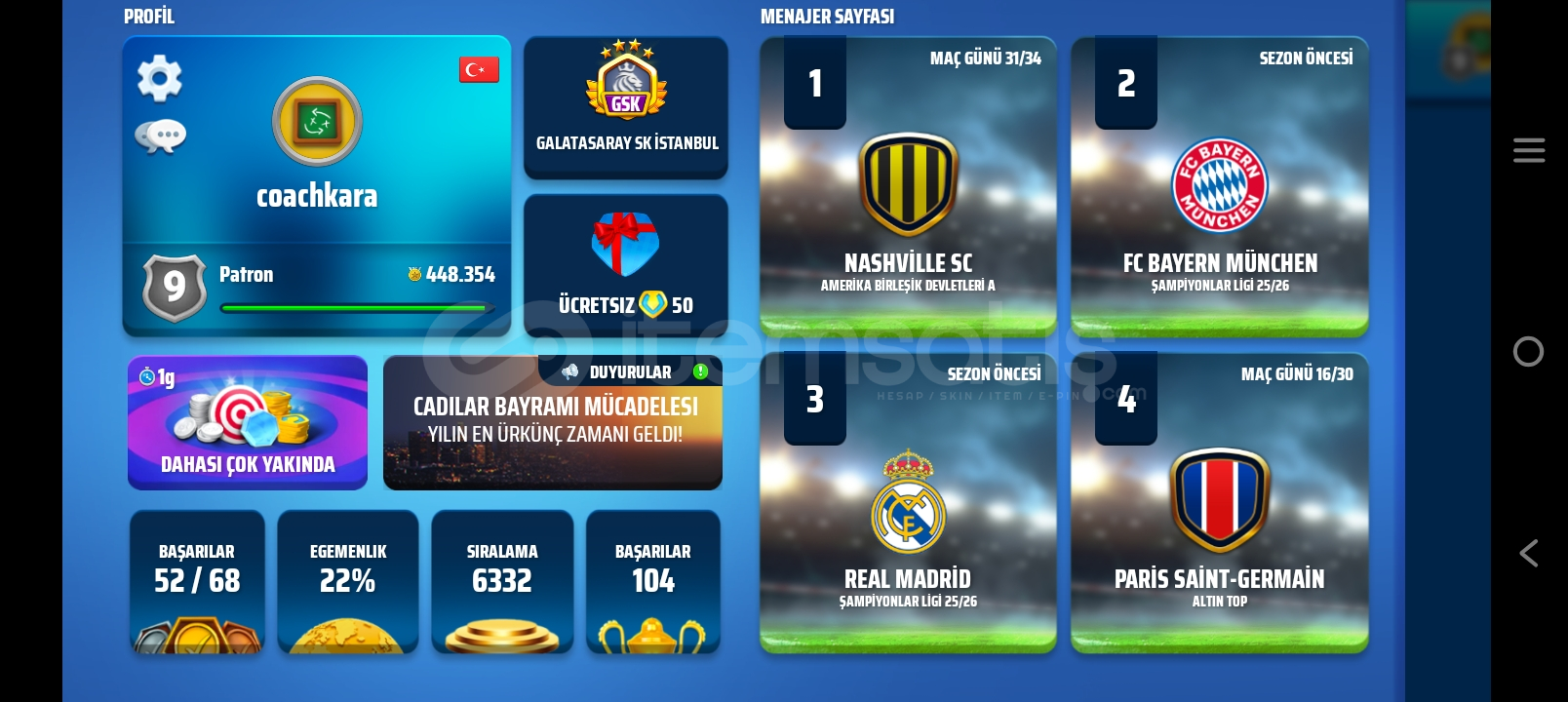 9 seviye patron hesap. Efsane seviyesine 10bin puan uzaklıkta. 100 kupa. Dünyadan 7bininci ülkede 1000. Sırada.Hesap, Dünya starlar ligi klasmanında ekibinin lideri konumunda.Ciddi alıcılar iletişime geçsin çokca emek var.
