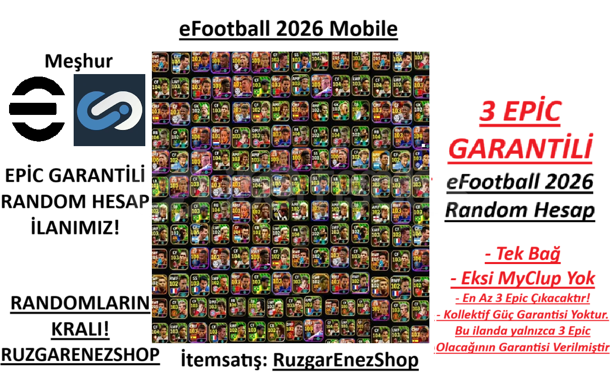 Garanti en az 3 destansı çıkacak olan stoklarımızdaki hesaplarda bulunan destansılardan bazıları;VAN DİJK, ADRİANO, YAMAL, MESSİ, NEYMAR, PEDRİ, DROGBA, CASİLLAS, VAN BUYTEN, RONALDİNHO, BECKHAM, ETO'O, SCHOLES, EDGAR DAVİES, MORİENTES ... v.s.! MAİL DEĞİŞEN RANDOM HESAP ! 'ı Kaçırmayın.!! İLANI SATIN ALMAK; NE ALDIĞINI BİLDİĞİNİ VE A&Cced...