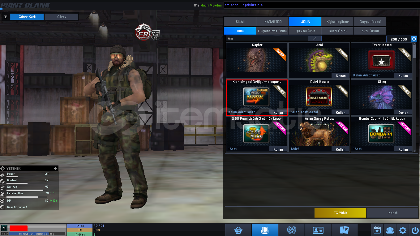 Hesabın içerisinde klan simgesi değiştirme kuponu bulunmaktadır ve pasif 500 TG vardır.