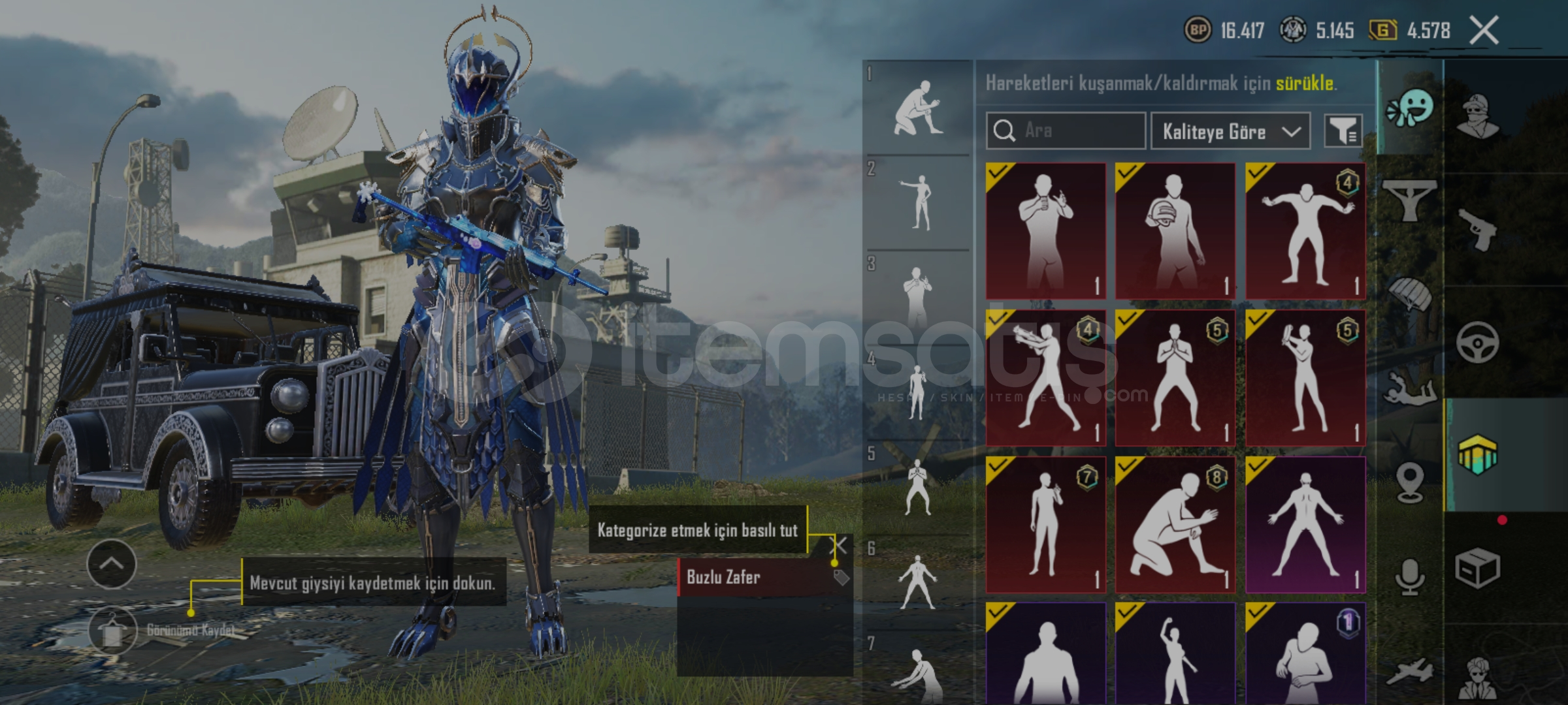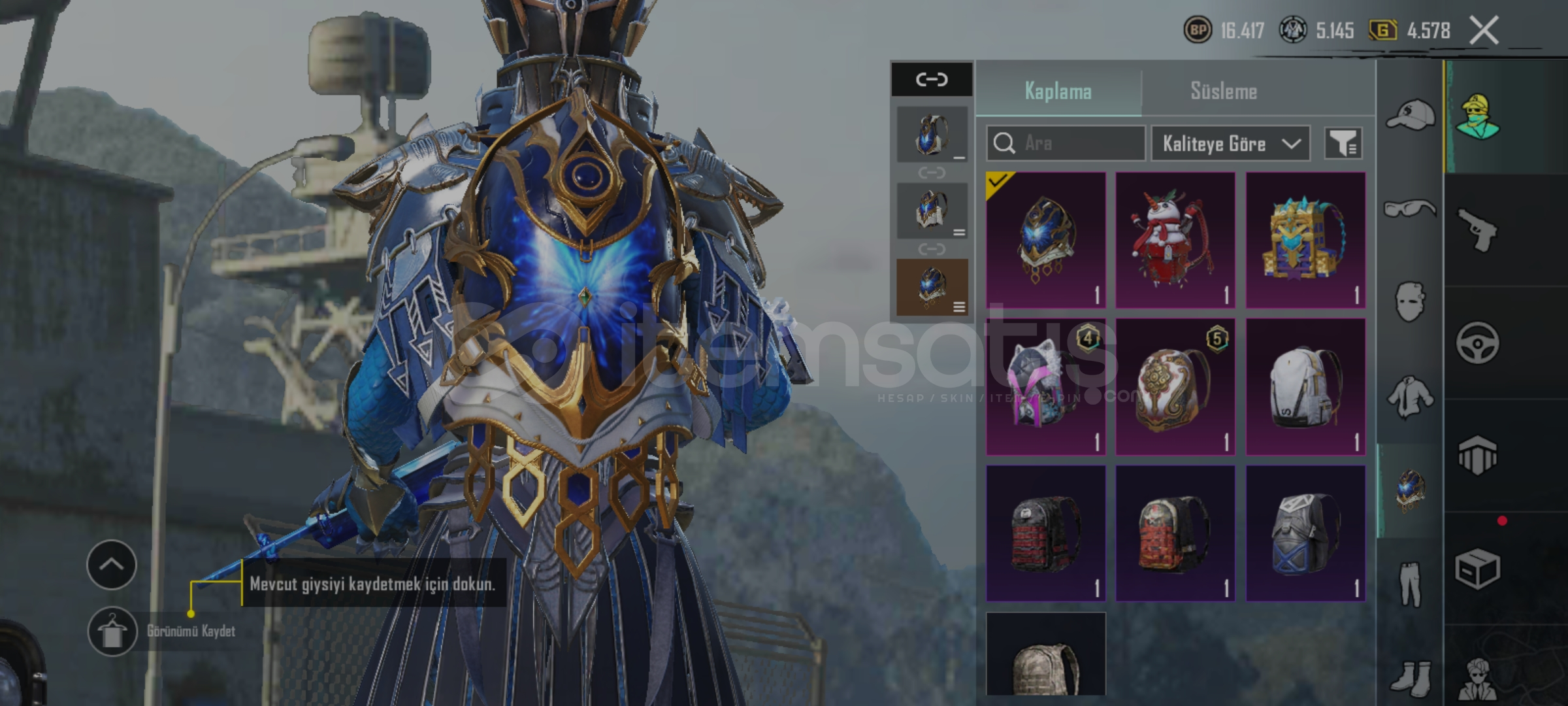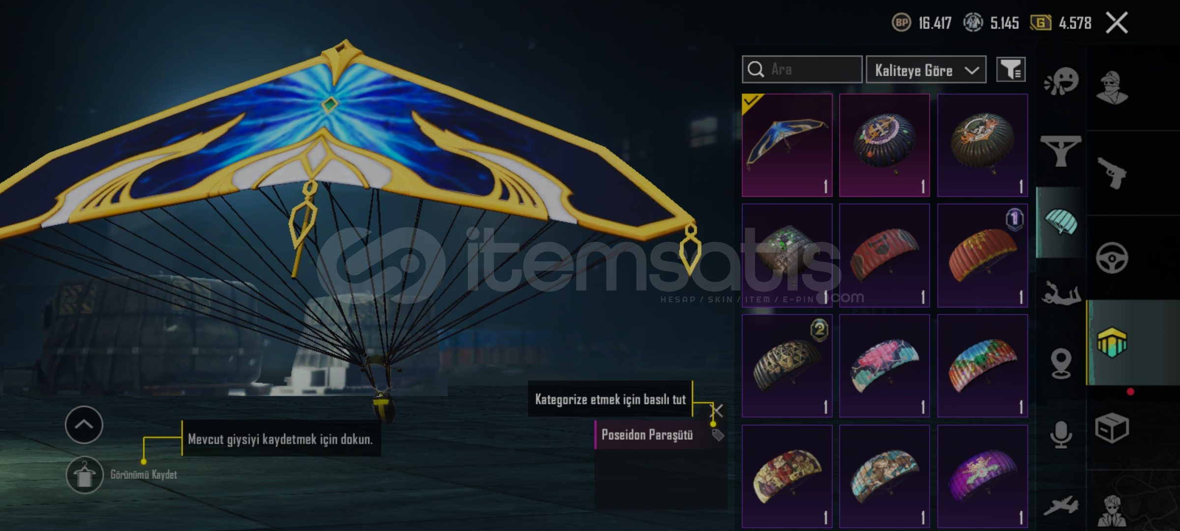 Hesap'da 10 tane destansı kostüm vardır en değerli kostümler posedion ve posedion'un elçisi seti'dir 36 tane'de efsanevi kostüm vardır paraşüt,bomba,molotof,sis bomsası deseni vardır viktoryen kadın uaz araba deseni vardır hesap 61 seviyedir hesap'da isim kartı vardır ( kalıcı ) fiyat:4000 TL dir ...( Pazarlık vardır )