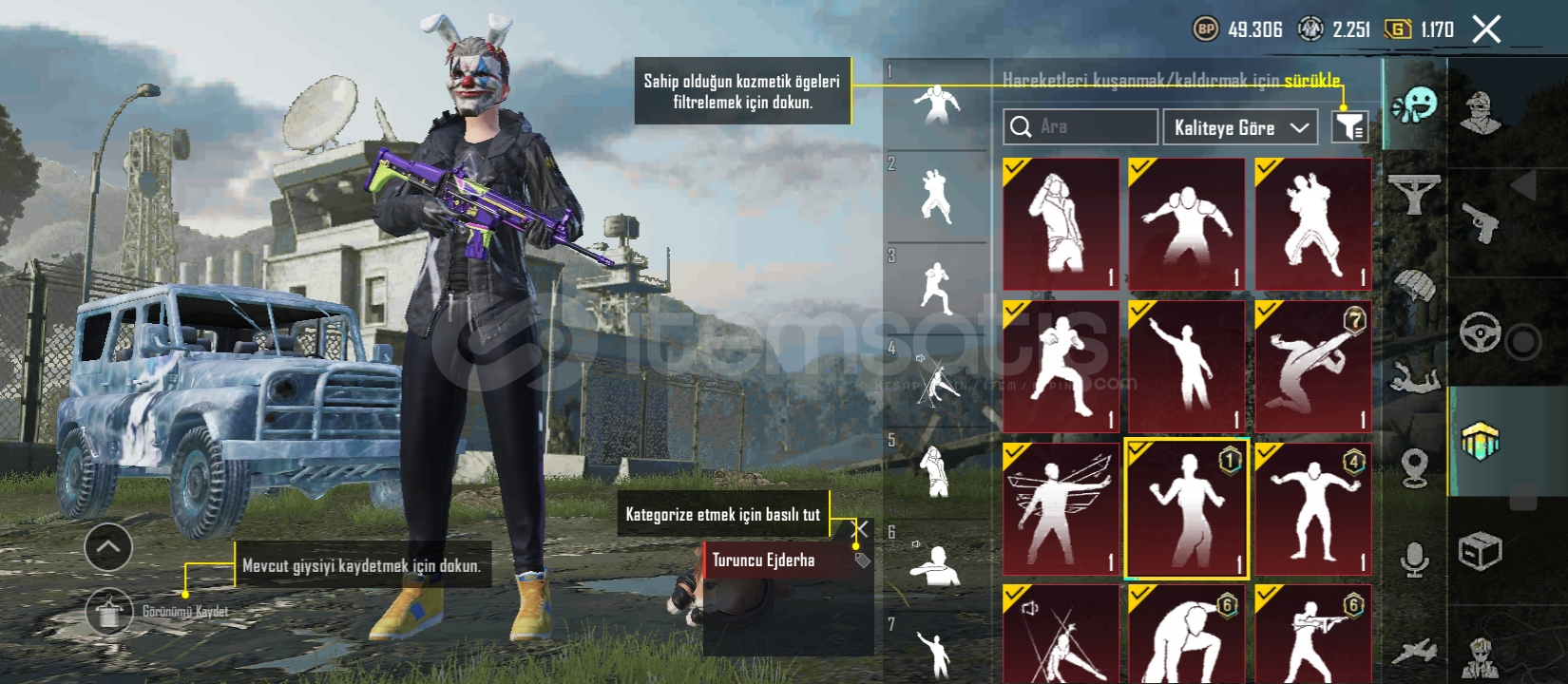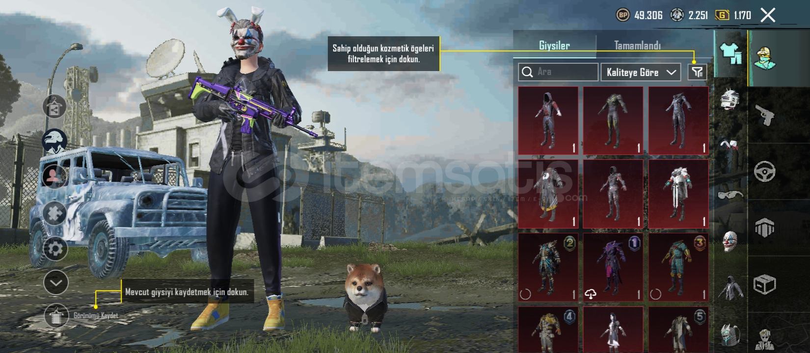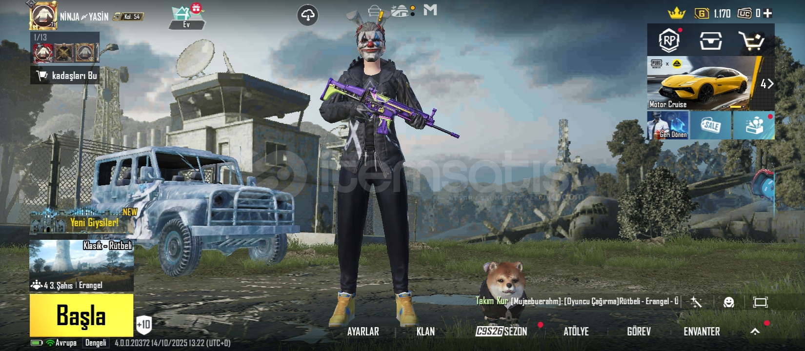 İlk önce hesap random değil aldığınız gibi üztünüze yapılacaktırBebek gibi hesap içinde13 yükseltilir1 materyalMaskara scar lDestansı gösteriş 60 Destansı varKöpek balığı DaciaBuz uazÖlüm makinesi, işgalci, maskeli medyum,distopya gibi şeyler varRP açıkÖdül yolu açıkSaç varS2 maskesi var