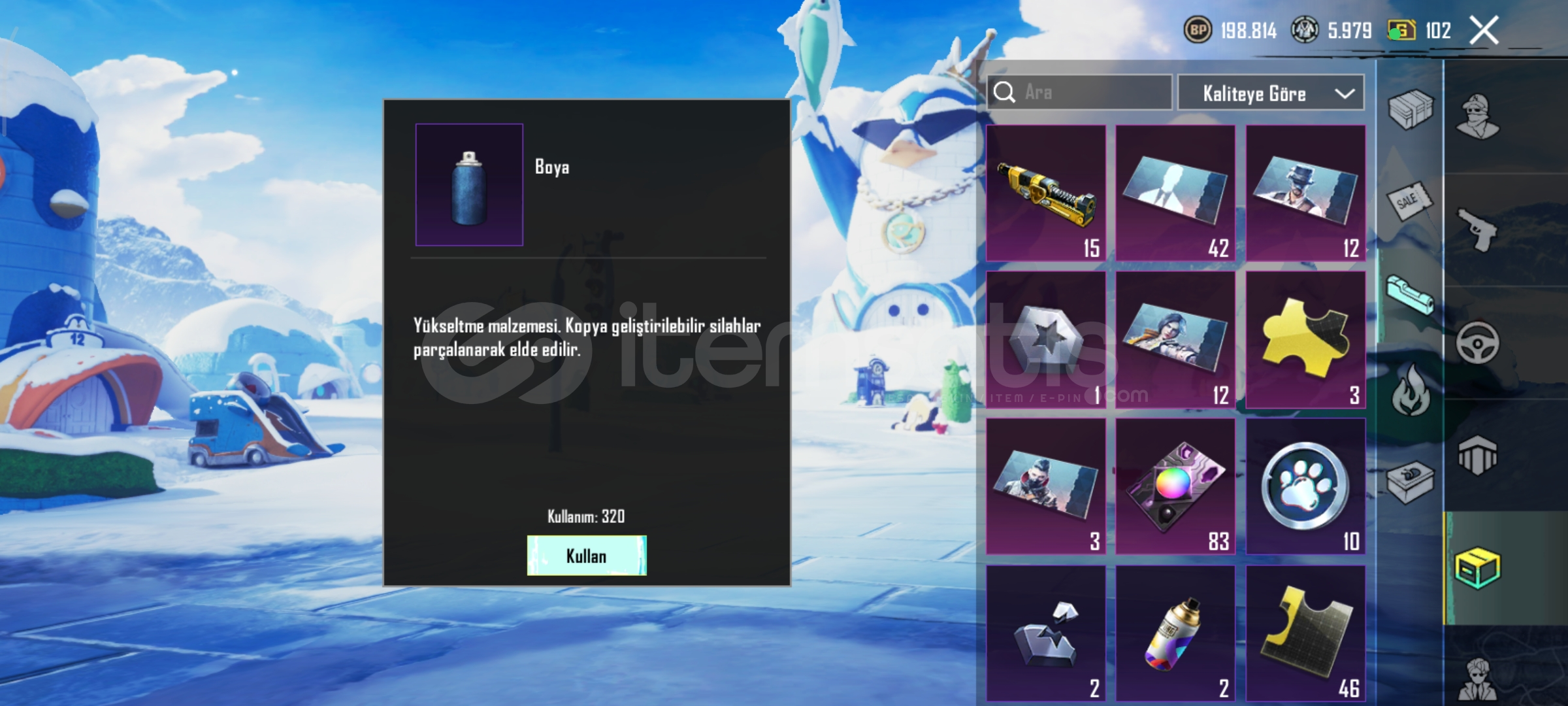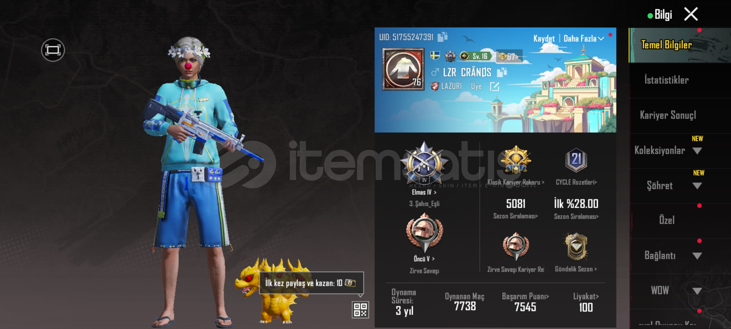 15 Metalyel49 koleksiyon49 destanstlıLazuri klanına üyeFirevun 1 seviyeYarın operasyonu setiÇelik asker setiişgalci setiAmansız suikastcı SetiMedyum KaskıSabah gezinti üst/altYarın operasyonu ScarL (1sv)Kod kırıcı AKM (1sv)Alevli Godzilla SAVAŞ BALTASI (3sv)Kış devriyesi VSS (1sv)Şekerli hortlak MP7 (1sv)Yamalı tavşan MK47 (1sv)Dikenli şafak M16A (1sv)Ejder katili Yadigarı PALA (2sv)2 ...
