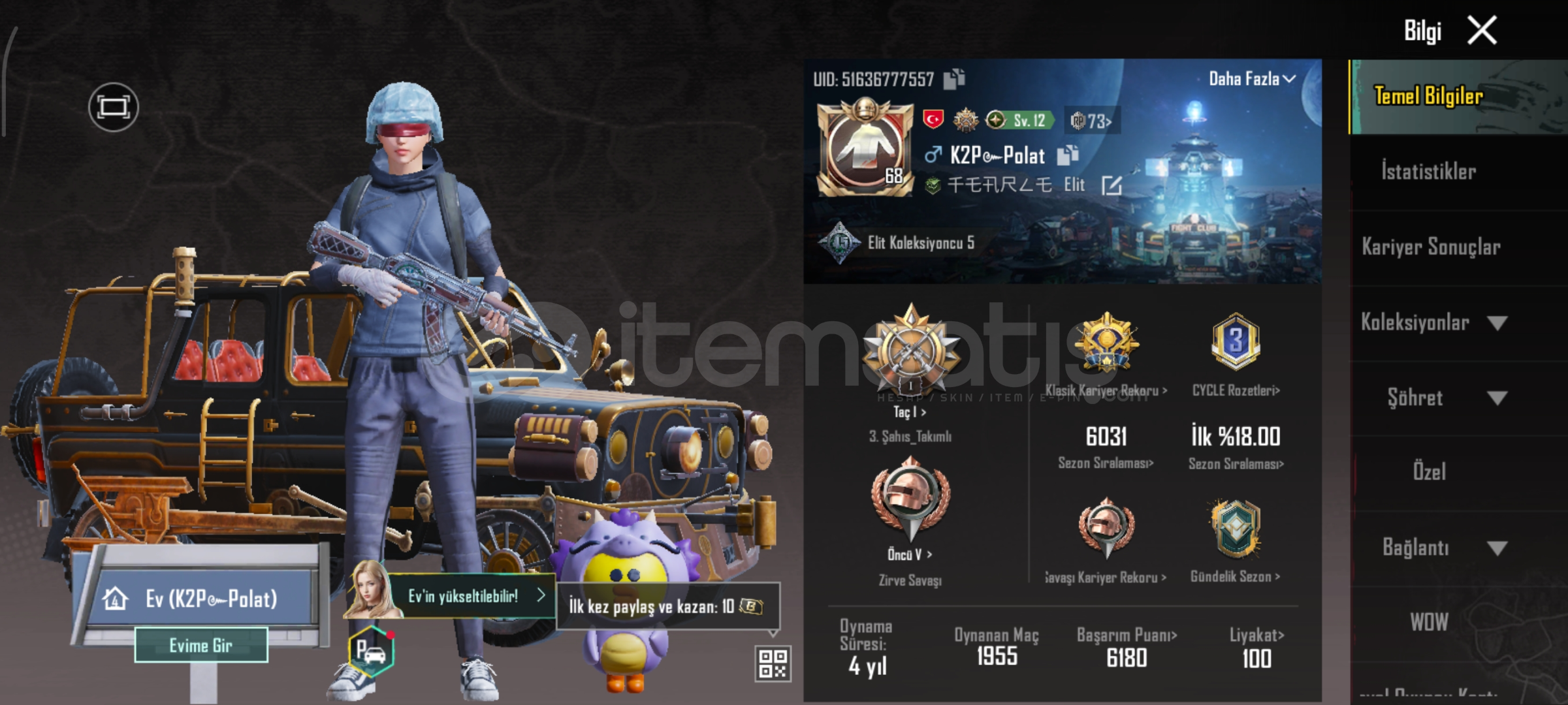 Hesap 4 yıllıktır işgalci,crew,ananas altı,buz diyarı kask ... gibişeyler vardır 16 yülseltilebilirin içinde 5 ölüm duyurusu vardır tel numarasıve gmail hesap alınırken değiştirebilirim.pazarlık yapılır.