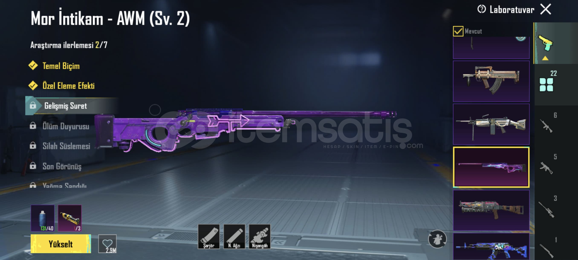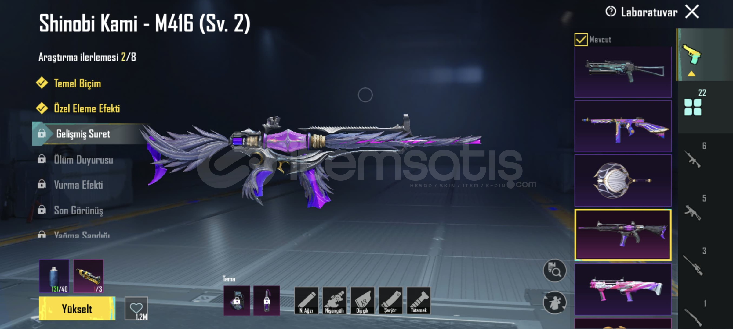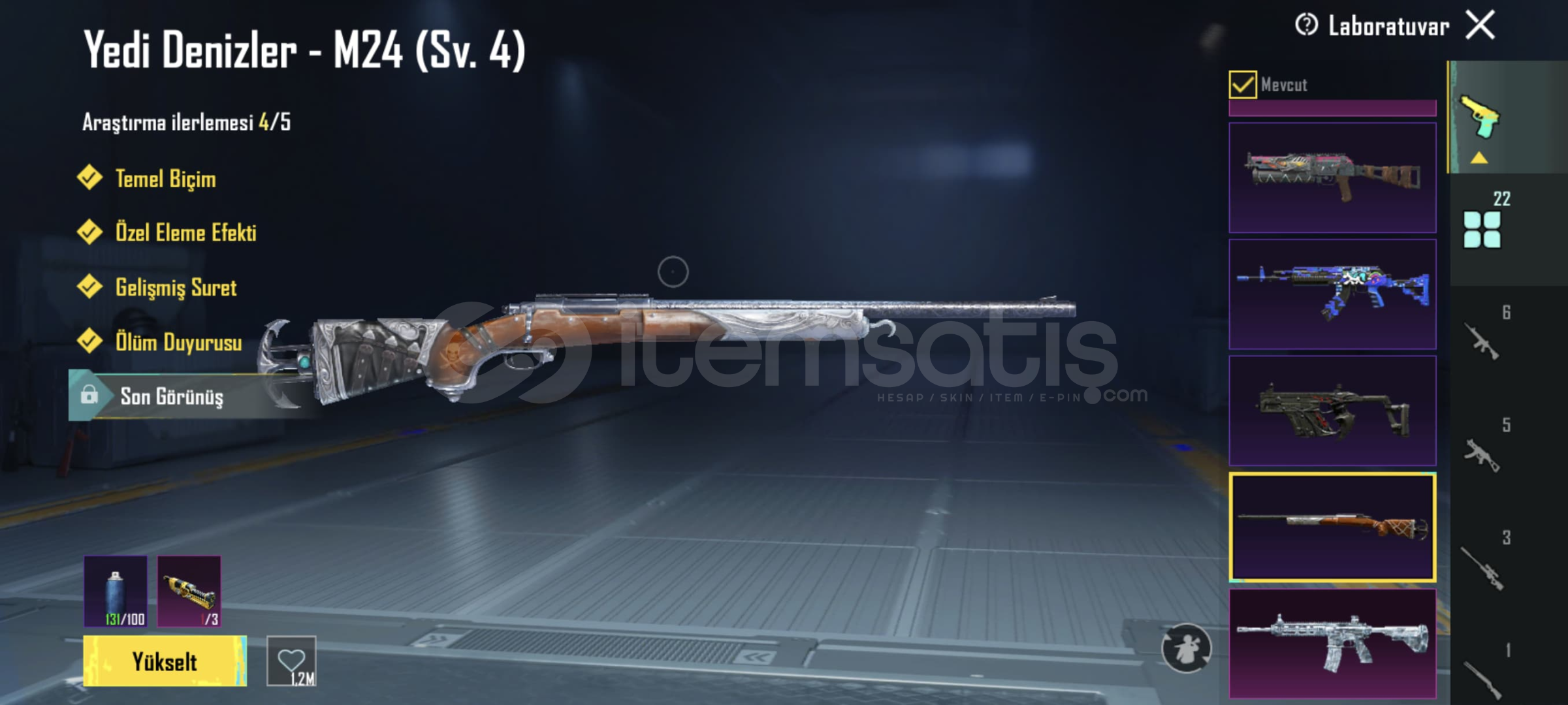 Buz m4 6 lvl!! Shinobi kami m4 2 lvl!! Mor intikam AVM 2 lvl !! Yedi Denizler m24 4 lvl!! Kor Alev X-SUİT 1 lvl(+) 1 materyal!! 22 Yükseltilebilir Silah 6 Kill Mesaj3 Destansı Çanta! 5 Destansı Planör!! 78 Destansılı!! Destansı Gösteriş Ünvanı!!