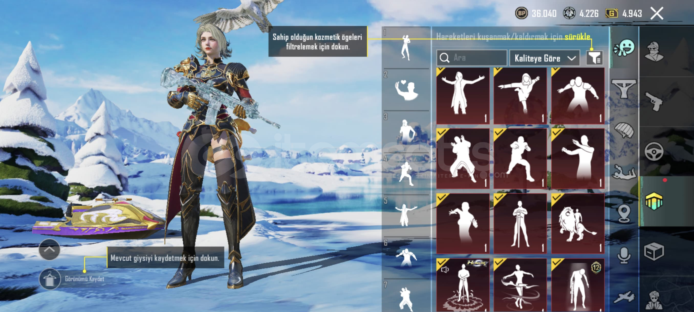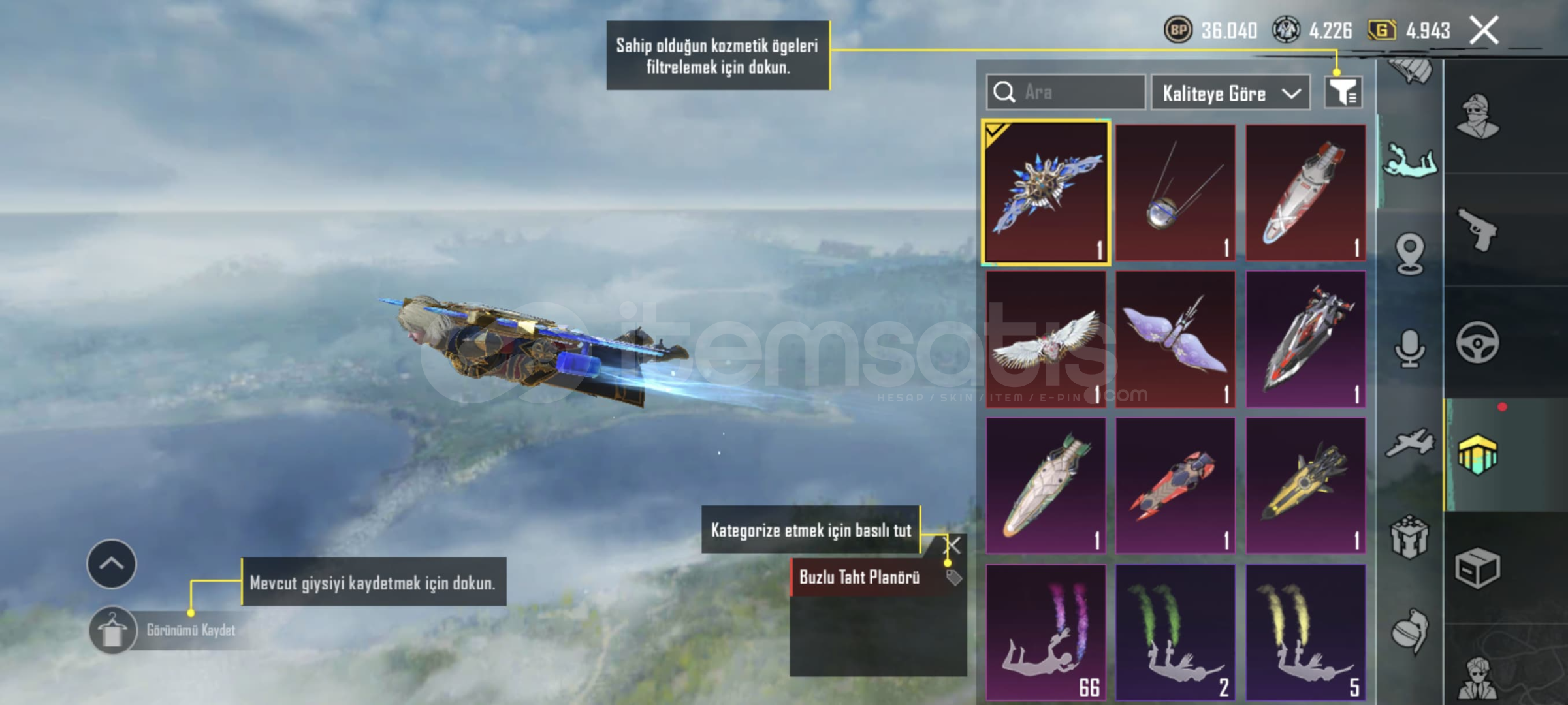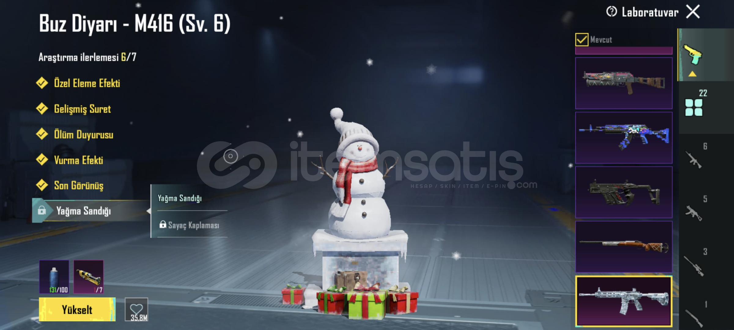 Buz m4 6 lvl!! Shinobi kami m4 2 lvl!! Mor intikam AVM 2 lvl !! Yedi Denizler m24 4 lvl!! Kor Alev X-SUİT 1 lvl(+) 1 materyal!! 22 Yükseltilebilir Silah 6 Kill Mesaj3 Destansı Çanta! 5 Destansı Planör!! 78 Destansılı!! Destansı Gösteriş Ünvanı!!
