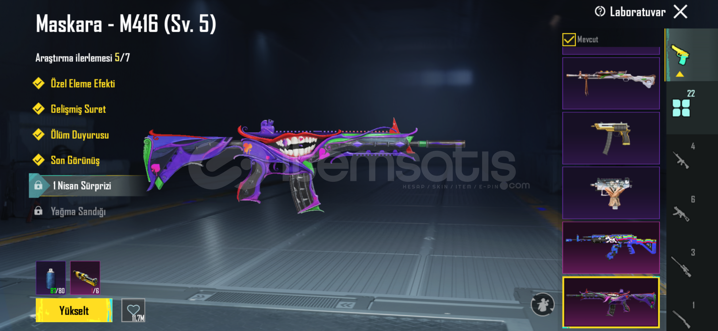 Midilli m762=maxMaskara m416=5 seviyeRomantik anlar uzi=2 seviyeZarif leylak thompson=3 seviyeŞirin kedi kar98=3 seviyeGece gladyatörü bizon= MaxAtomik tetik s12k=3 seviyeRuhani muhafız uzi= maxSokak grafitisi m249=3 seviyeRuhbiçen ump45=3 seviyeİsterseniz kimlik onaylı hesaptan da satışı yapabiliriz