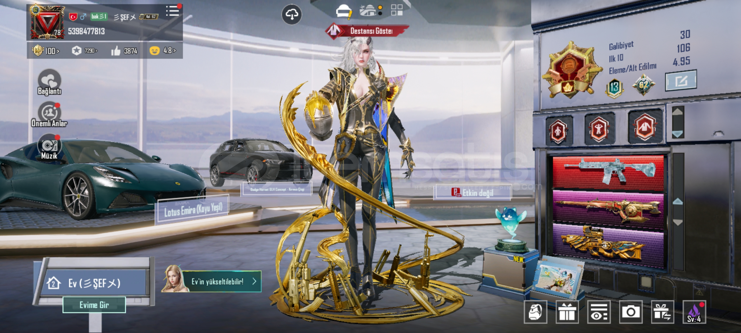 SATILIK 78 seviye 62 koleksiyon Ödül yolu ve rp açık2 spor araba Dodge uaz Lotus emira BUZ DİYARI 7 YED DENİZLER M24-4 LVLKÜÇÜK MİDİLLİ M762 -4LVPARLAK GÜNEŞ QBZ-2LVLKOD KIRICI AKM 2-LVL8BİTLİK PATLAMA UMP-4Lider panter dbs-3lvl Arındırıcı Amr -4Thmapson 3lvl maxKar98 3 level MaxBizon 3 level maxUzi 3 level maxHançer 3 level MaxP90- 4 level Scar l 3 level max Toplamda 28 yükseltili...