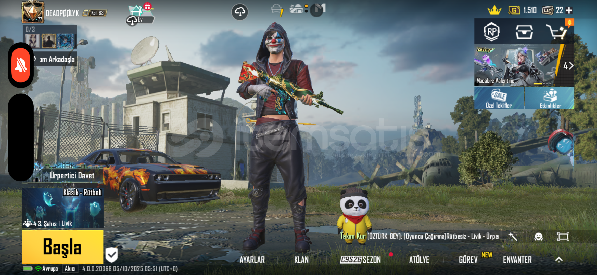 KOLEKSIYON 63 SEVİYEDİR27 YÜKSELTİLEBİLİE SİLAHYAKAN KÜKREME M4(4sv)BUZUL ÇEKİÇ UZİ(4sv)KÜÇÜK MİDİLLİ(4sv)GALADRİA AVM(2sv) ve bır cok daha olum mesajlı silah2 x suit bulunur ikiside 2 leveldirKOMUTAN BULUNUR VE CREW