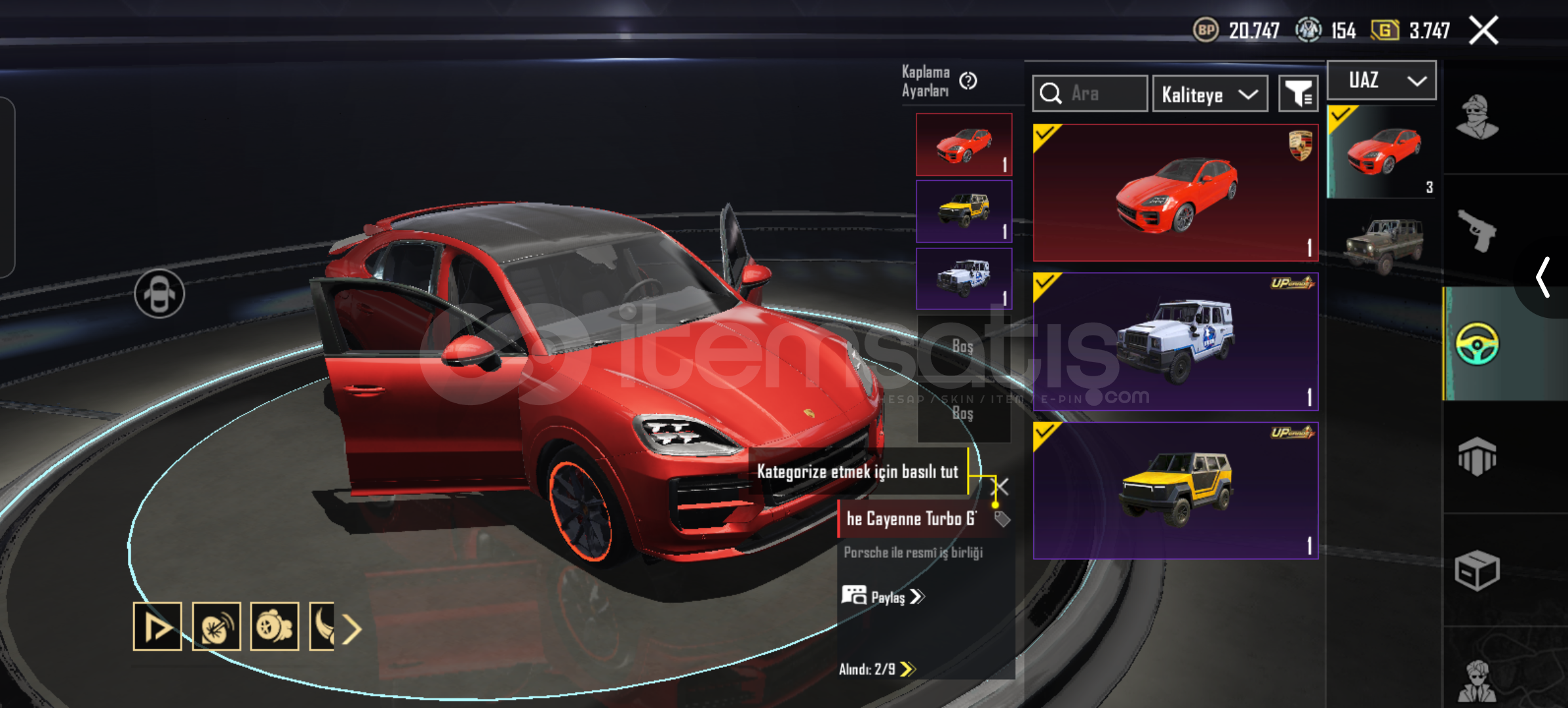 Hesapta 2 tane porşe var kırmızı uaz yeşil toros fotoğraflar mevcut bikaç tane daha skin var araba silah falan dm konuşuruz tek bağı fesbook oyundan fazla anlamıyorum araçlara çok para gitti madiyattan satıyorum
