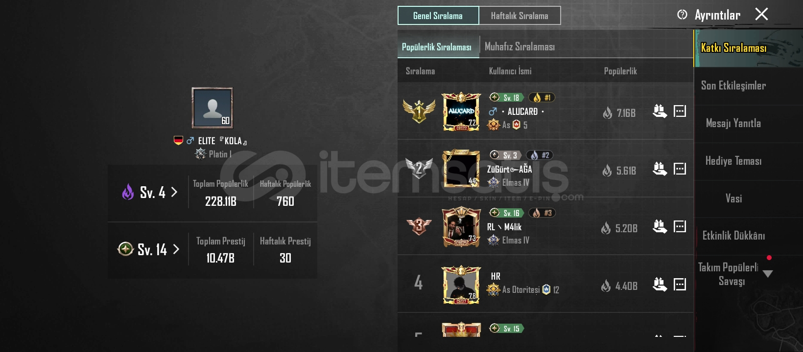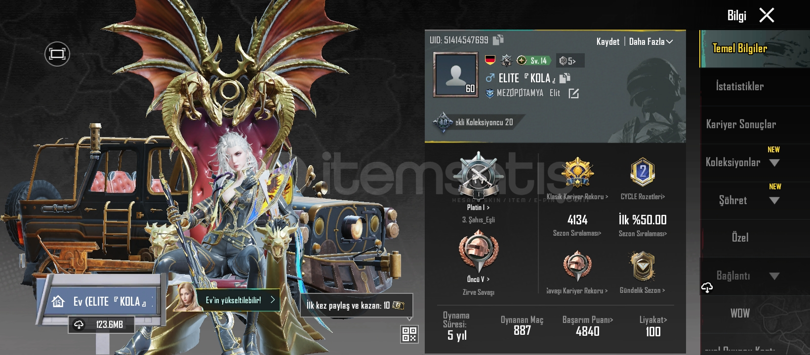 60 LEVEL 5YİLLİKPRİME ABONELİK +120 UC VARDIR220K POPÜLERLİKİSİM KARTININ 9 GÜNÜ KALDI ALACAK HIZLI ALSIN2 ADET XSUİT DRAVİON VE SİLVANUSKAHRAMANLİK AĞIDI AVM 2 SEVİYETOPLAM 72 SİLAH DESENİTOPLAM 45 İFADE7 ARAÇ DESENİ 6 UÇAK DESENİ9 TANE YEDİ GÜNLÜK ODA KARTI12 TANE BİR GÜNLÜK ODA KARTI6 TANE TEK KULLANIMLIK ODA KARTITOPLAM 75 GÜNLÜK ODA K...