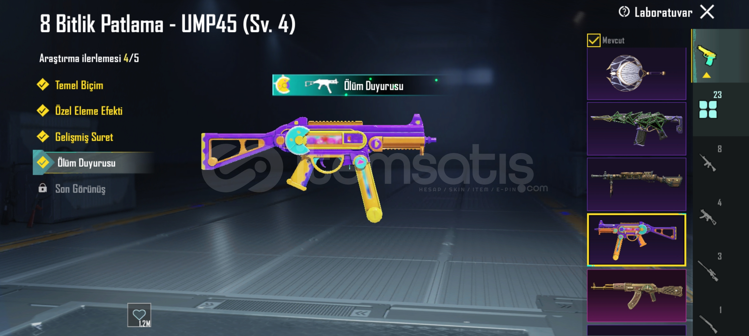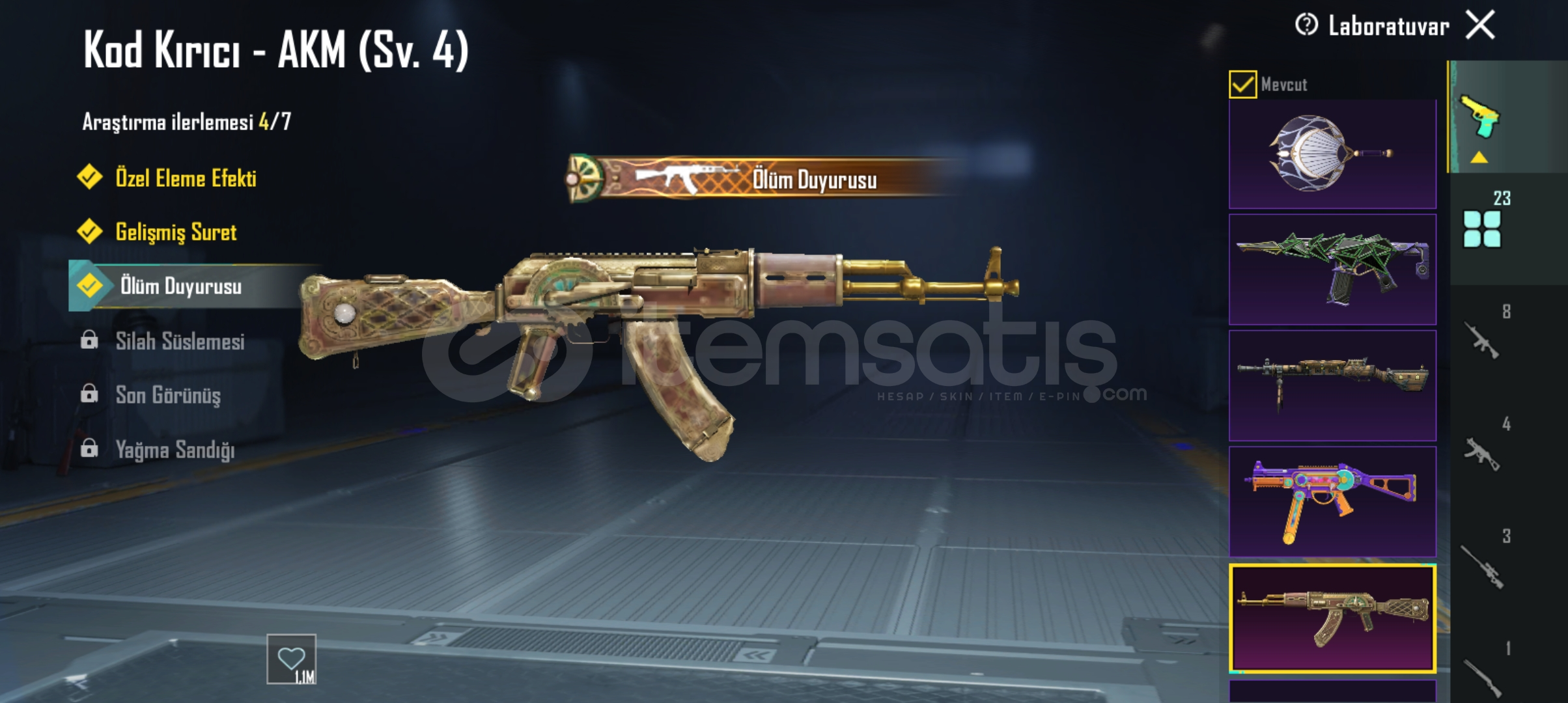 23 yukseltilebilir silah avci m249 sv.3mama tanbancasi scarL sv.3 olum duyurusualevli godzilla baltasi sv.3 olum duyurusuAlevli godzilla groza sv.2Ruhani muhafiz uzi sv.3 olum duyurusuŞirin kedi kar98 sv.3 olum duyurusu Zarif leylak tomsan sv.3 olum duyurusuDeniz savascisi dp28 sv.38 bit patlamasi ump sv.4 olum duyurusukod kirici AKM Sv.4 olum duyurusu Kucuk midilli m762 sv.4 olum duyurusuGeri kalan silahlar sv.1'dir.Koleksiyon 50.seviyedir.Destansi gosteris vardir.Detayli videosu link yout...