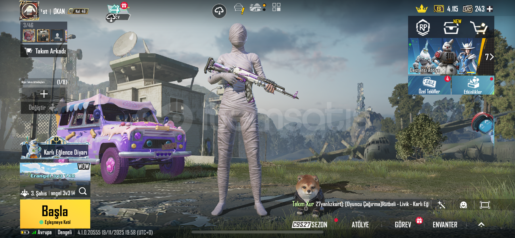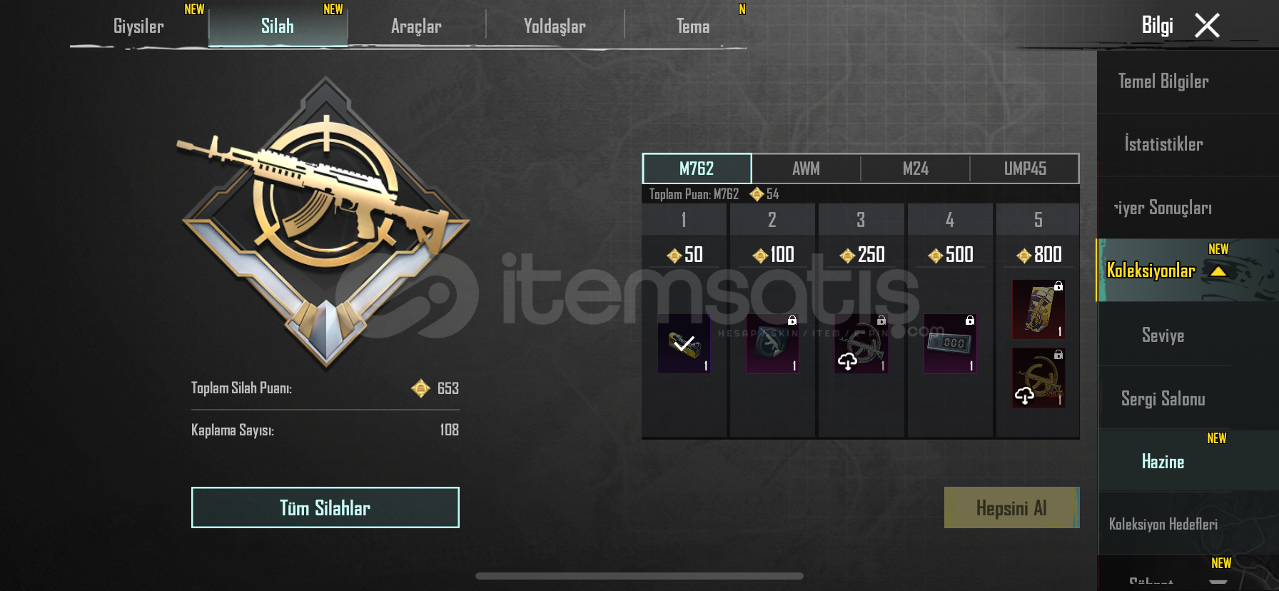 hesapta 10 yükseltilebilir silah varmidilli m7 4 seviye 8 bitlik patlama ump 4 seviye altın pençe p90 2 seviye28 destansılı + mumyalı 70 seviye emek hesabı Rp açık30 ünvan mevcut