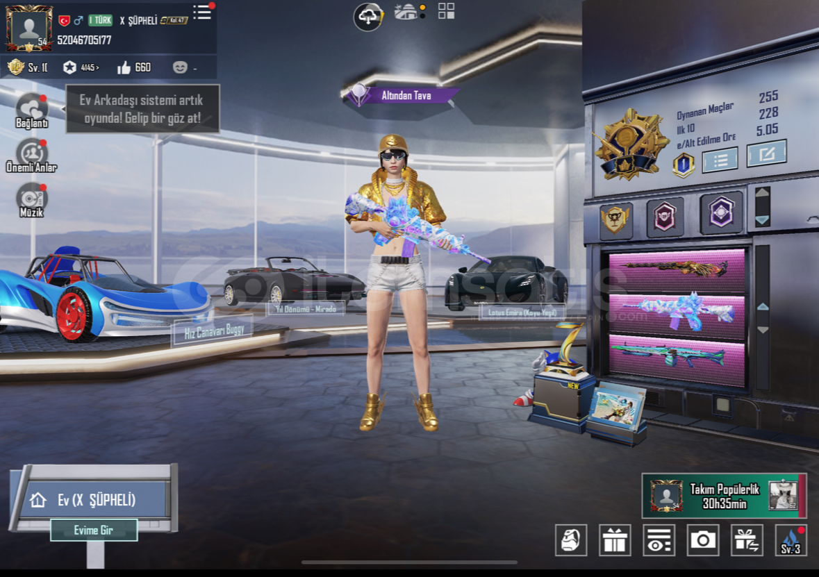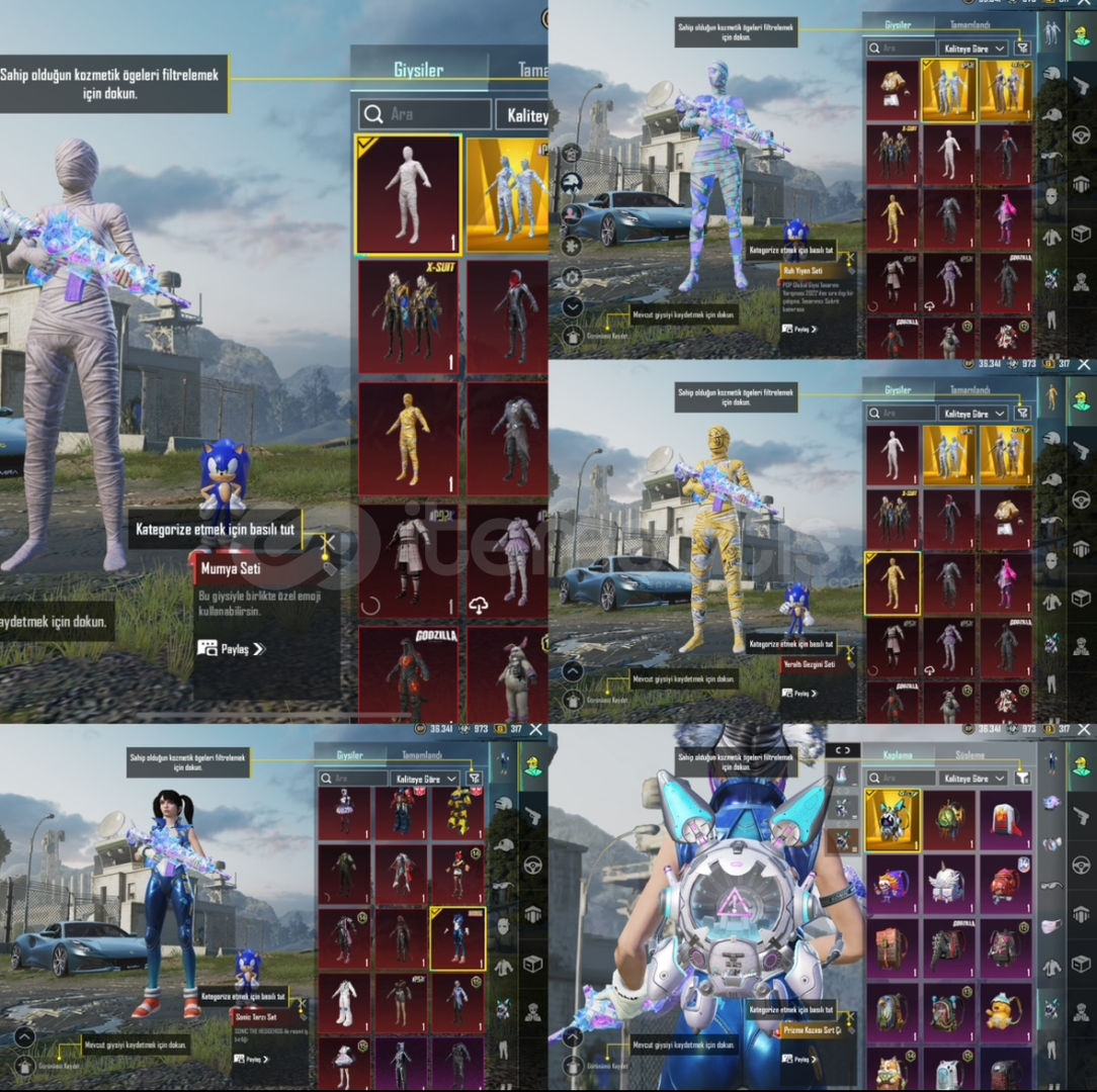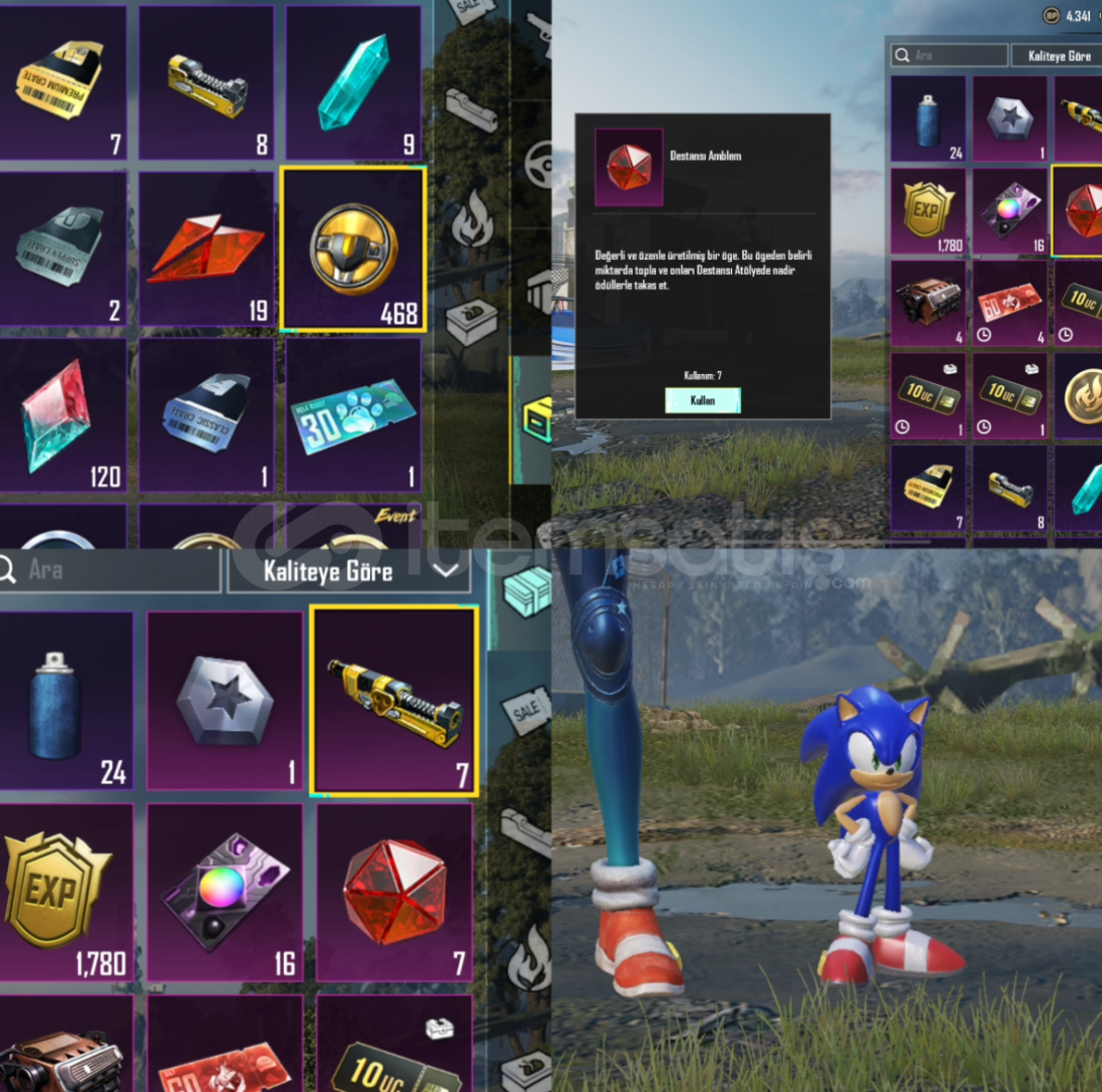Hesaptaki tüm önemli şeyler fotoğrafta mevcut. 7 MATERYAL VAR 76 BOYA EKSİK ONLARI TAMAMLARSANIZ M4 MAX SEVİYE OLUR. YENİ GELEN SONİC YOLDAŞ DAHİL ARABA TEKNE SET HER ŞEY ÇIKARILDI.