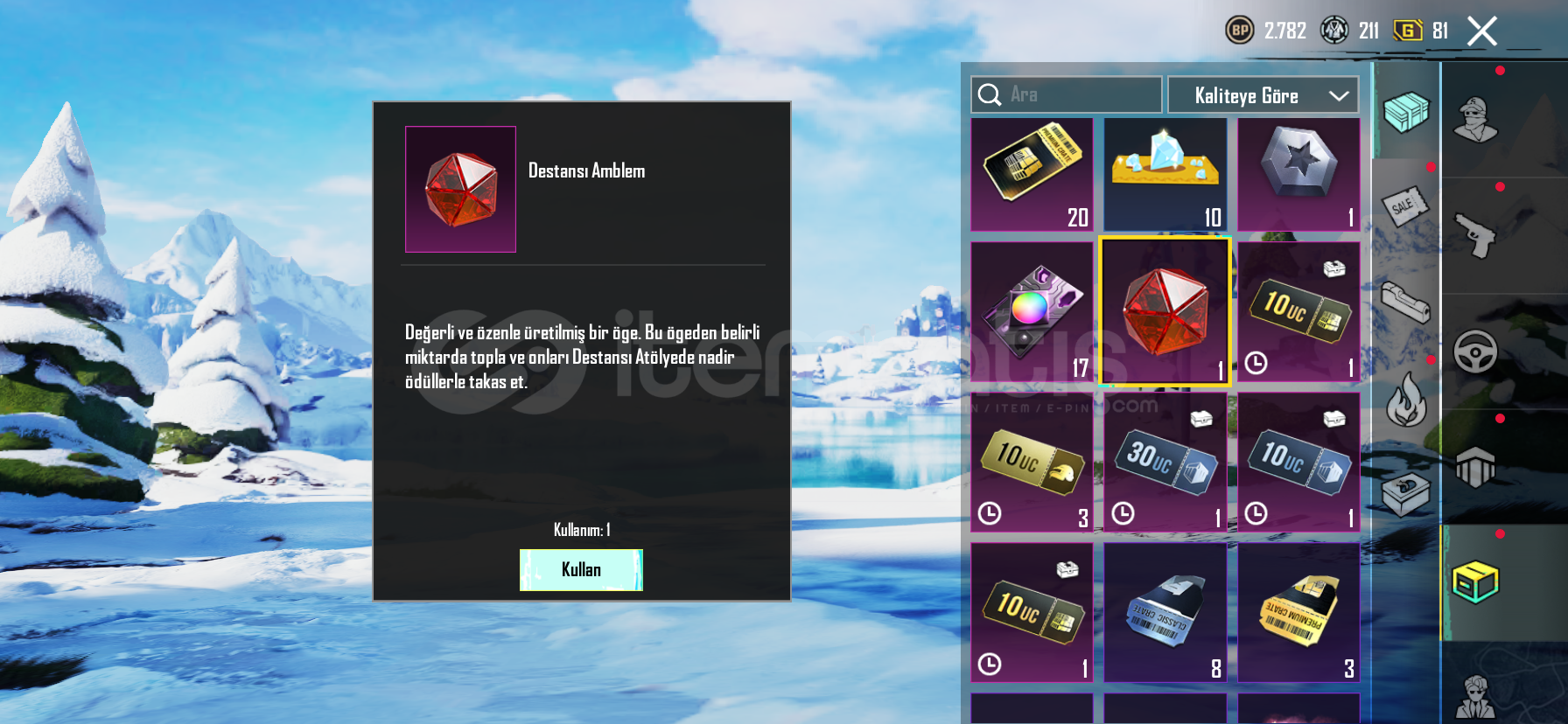 MERHABAHESAP 2 YILLIK 39 SEVİYE ÇOK OYNANMAMIŞHESAPTA TOPLAM4 DESTANSI ÖĞE26 EPİK ÖĞE64 MOR ÖĞE VARDIRROYAL PASS AÇILMIŞTIR1 YÜKSELTİLEBİR SİLAH VAR355 UC VAR1 TANE DESTANSI AMBLEM24 TANE DESTANSI AMBLEM PARÇASI VARDIR9 TANE MODİFAKSYON PARÇASI VARDIRİD KARTI MEVCUTTURHESAP İDSİ: 51955256462HESAP TEK BAĞDIR BAĞLARI ÜSTÜNÜZE YAPILACAKTIR BAŞLANGI...