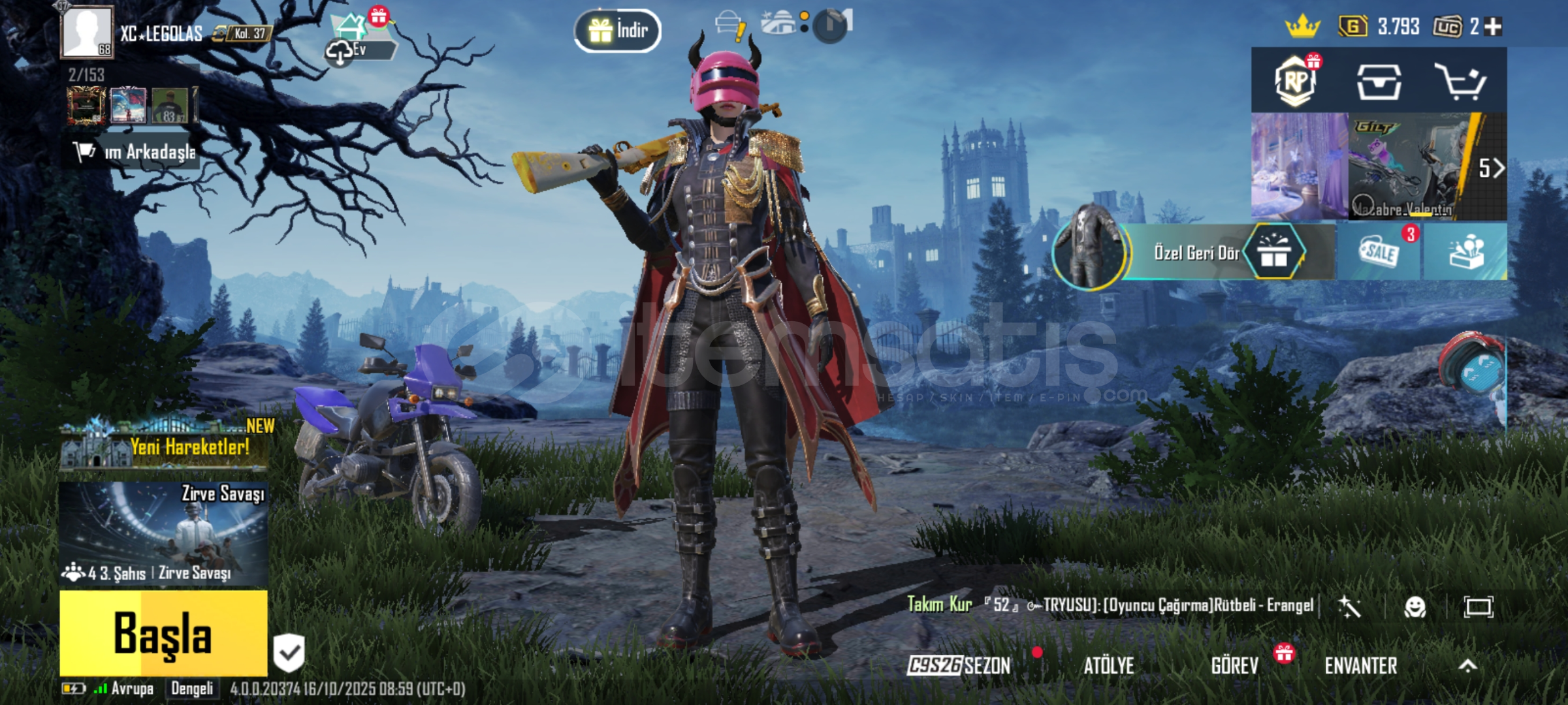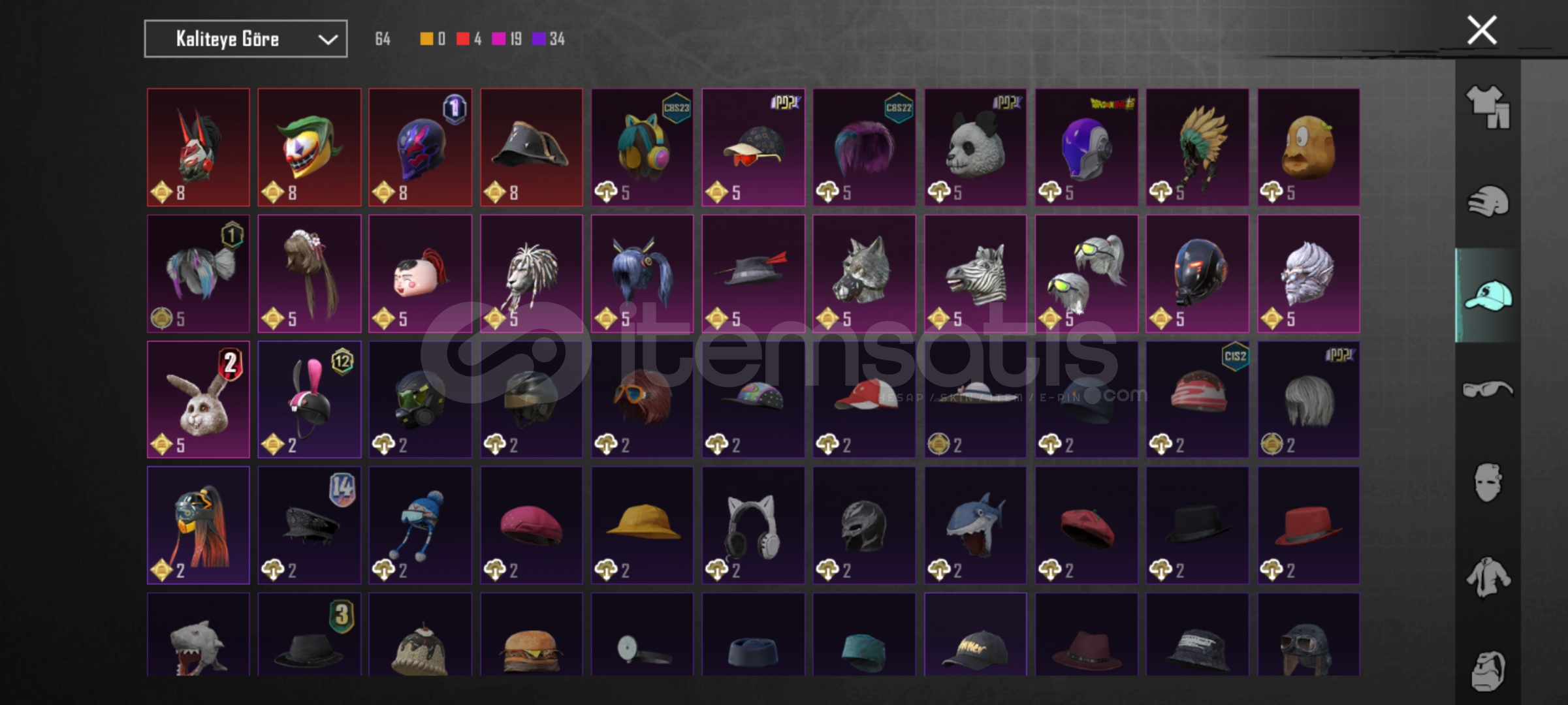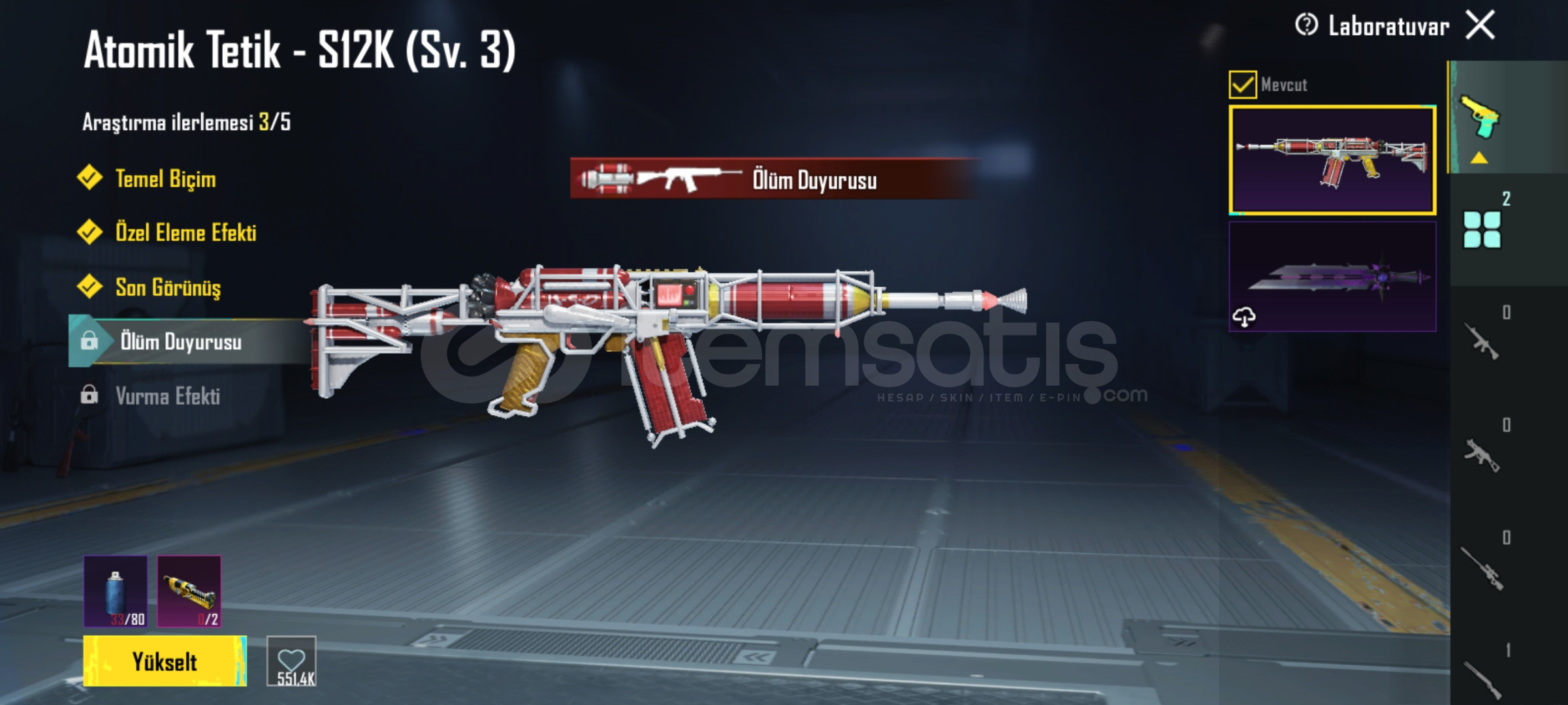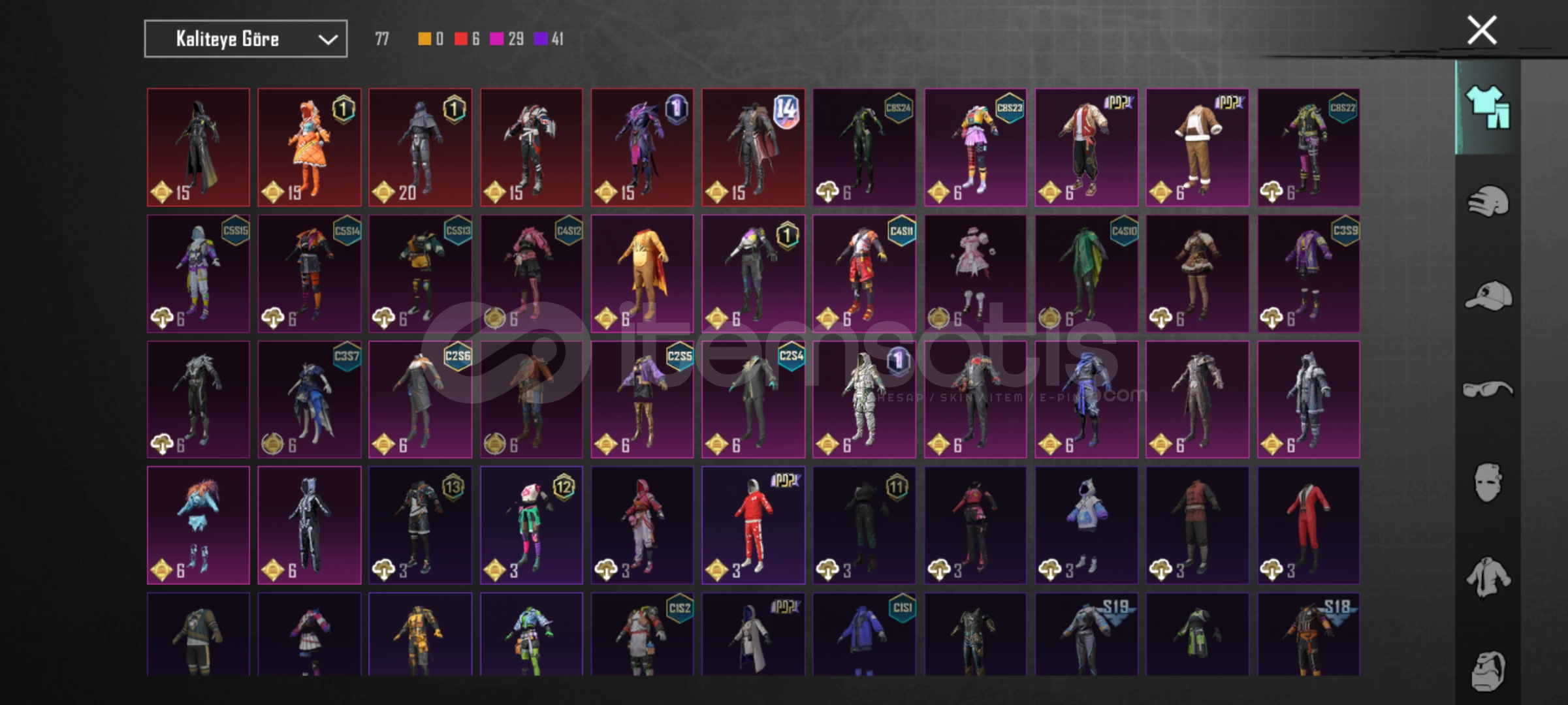 HESAPTA 354 adet giysi skini 56 adet silah skini bulunur Orbion çantası boynuzlu kask buz kask tek gözlü destansı çanta bulunur Ve daha birçok nadir öğe var Alacak kişiye şimdiden hayırlı olsun 2 adet yükseltilebilir silah vardırPazarlığa açığım